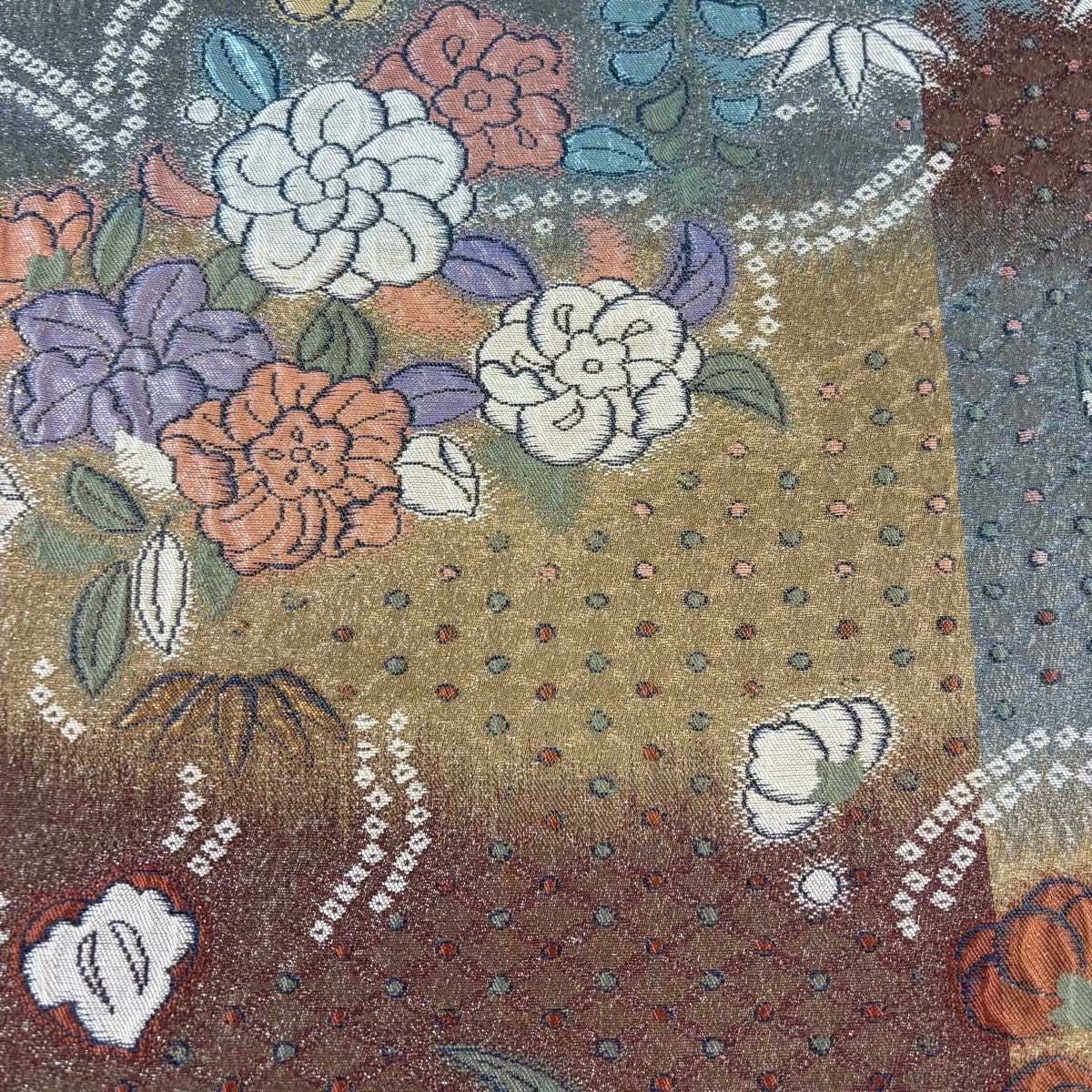 【美品】 袋帯 名品 辻が花 格子 銀糸 箔 灰茶 お太鼓柄 正絹