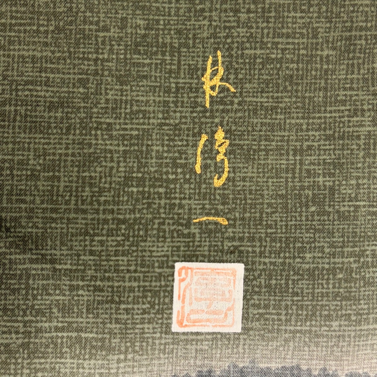 訪問着 身丈155.5cm 裄丈65cm M 袷 翠山工房 落款あり 山並み 霞 金彩 絞り 灰緑 正絹 名品