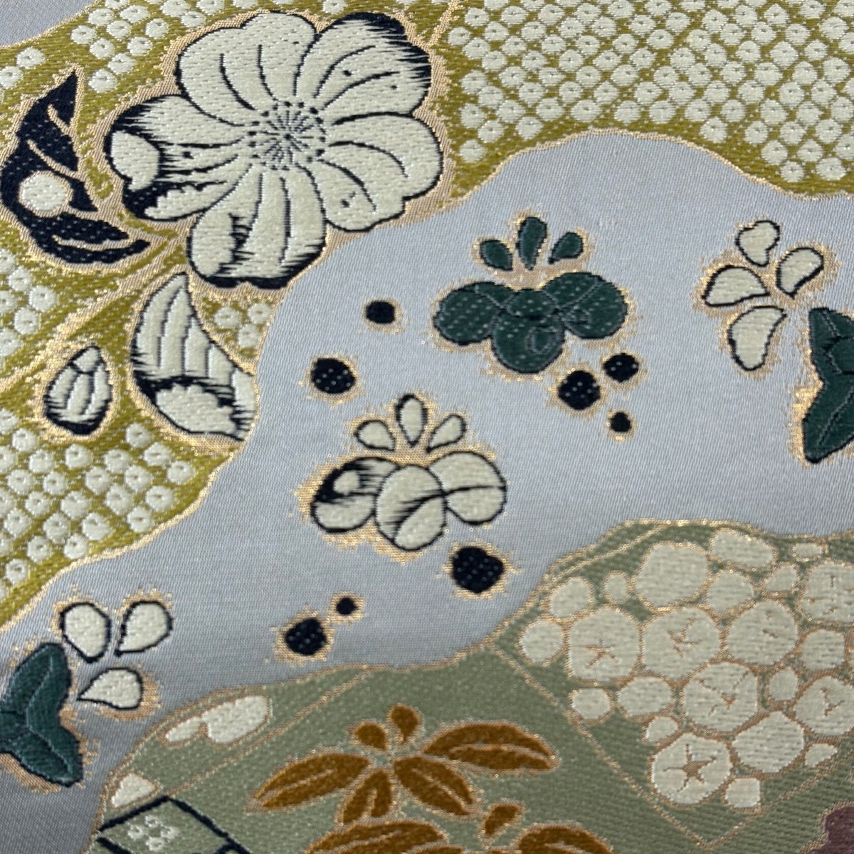 【美品】 袋帯 名品 落款あり 辻が花 格子 銀糸 箔 黄土色 お太鼓柄 正絹