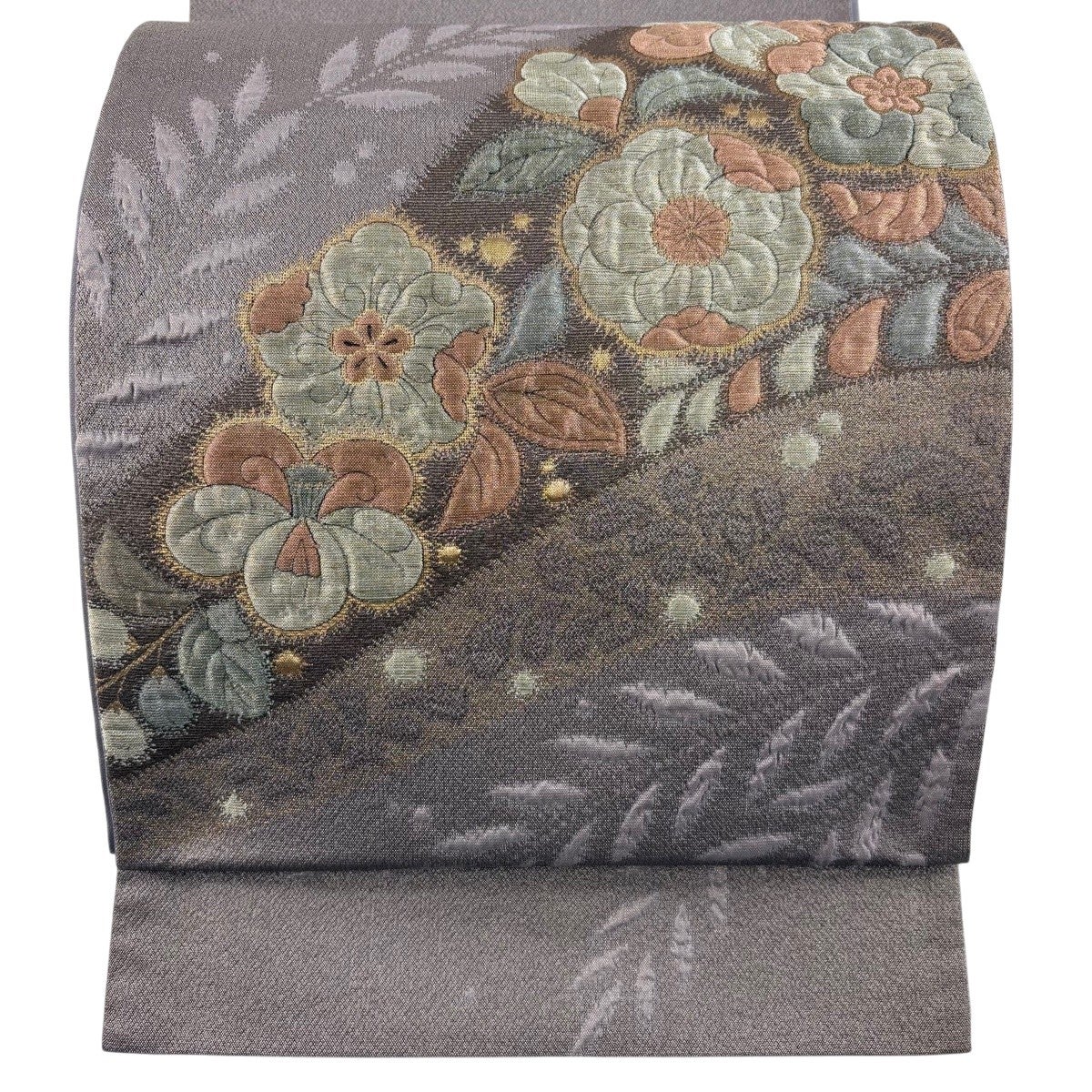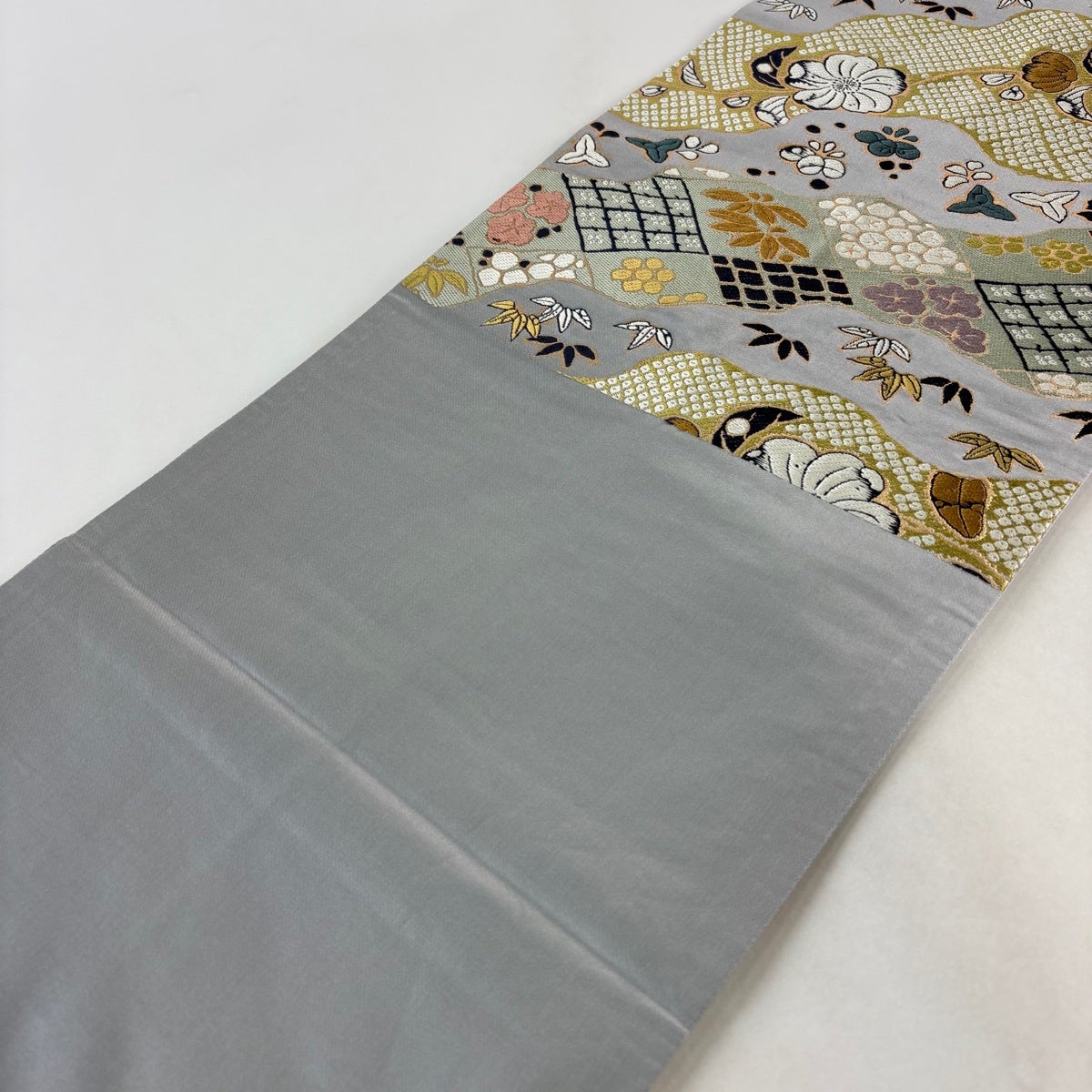 【美品】 袋帯 秀品 辻が花柄 竹梅 箔 灰色 六通 正絹