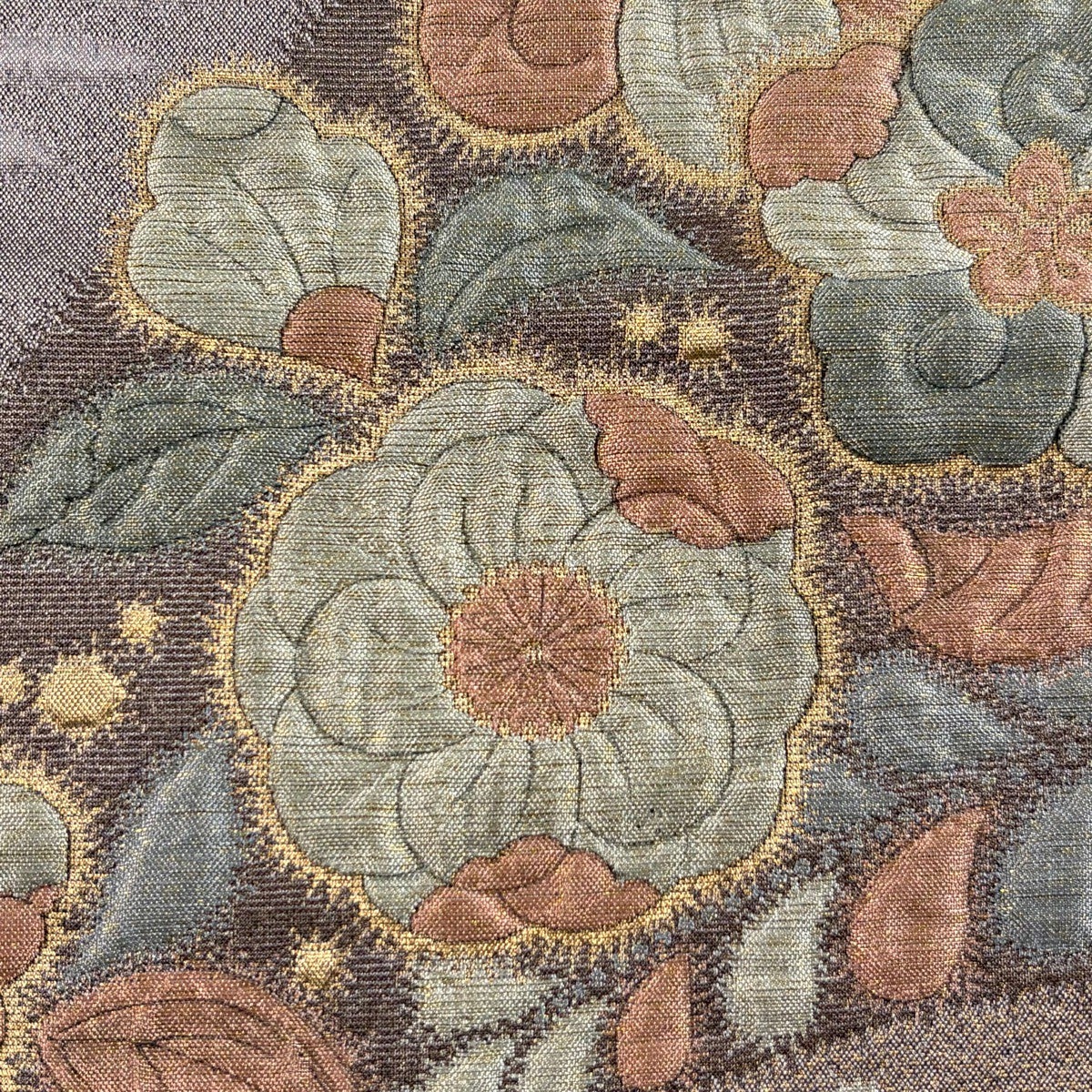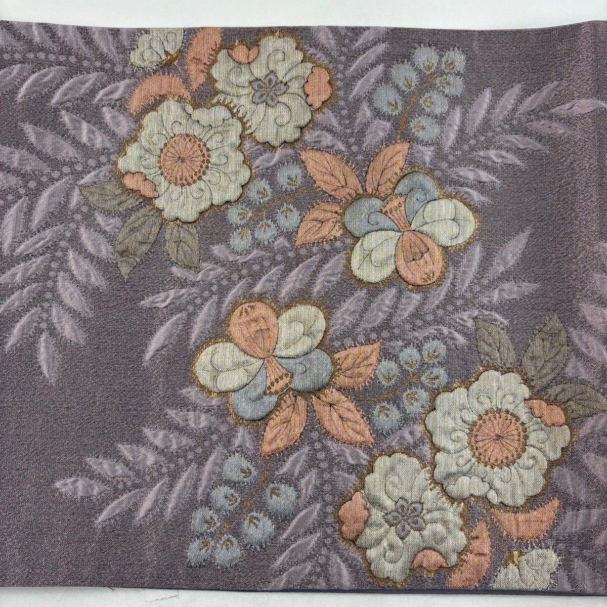 袋帯 秀品 辻が花柄 ふくれ織 金糸 灰紫 お太鼓柄 正絹