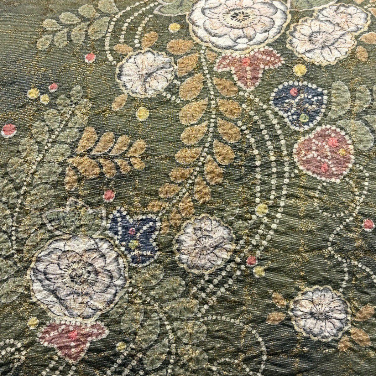 【美品】 袋帯 秀品 辻が花柄 金銀糸 箔 灰緑 お太鼓柄 正絹