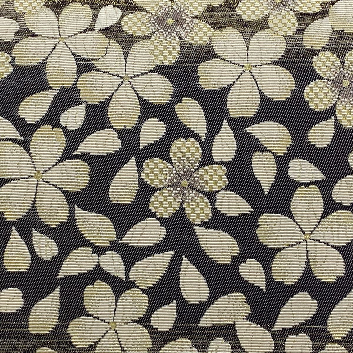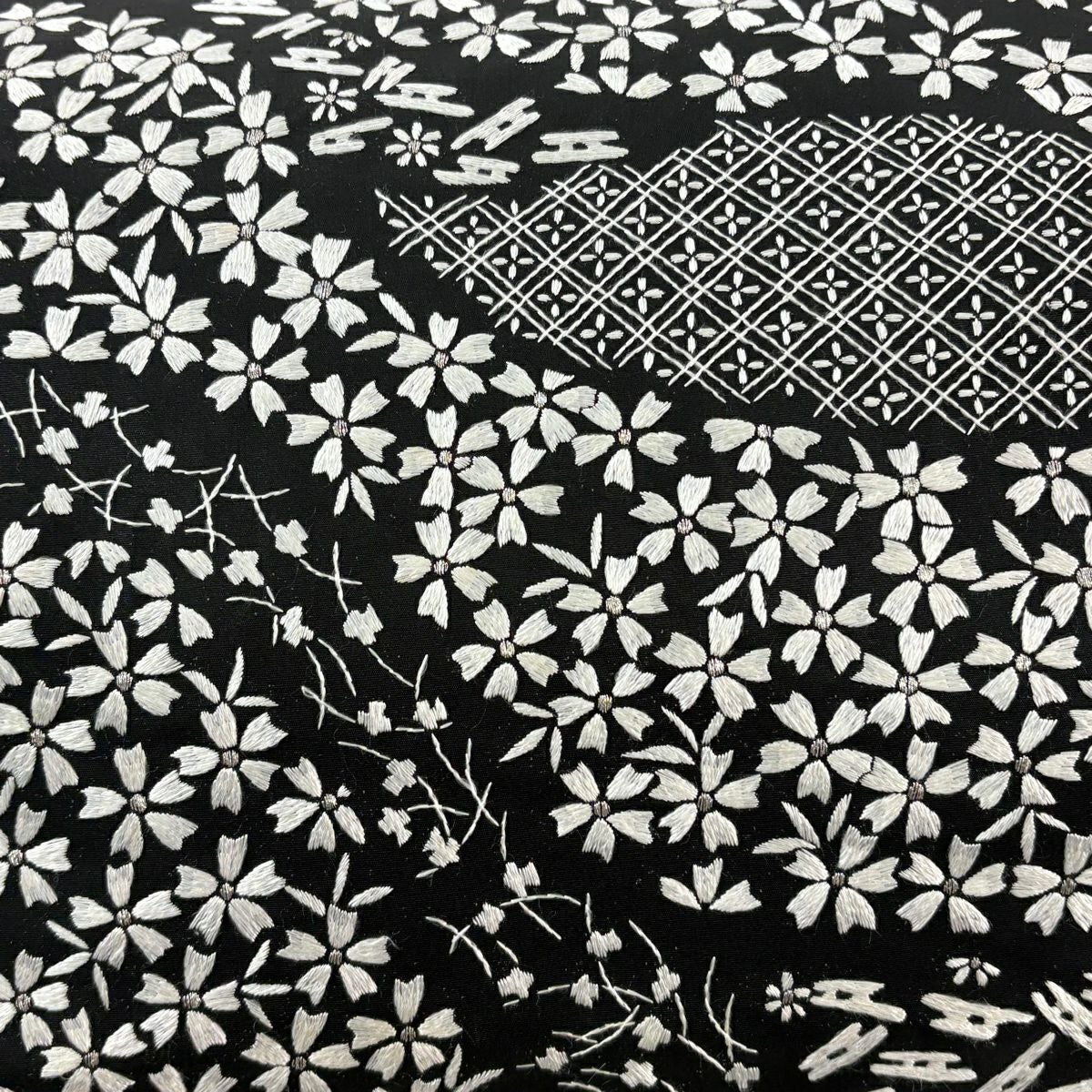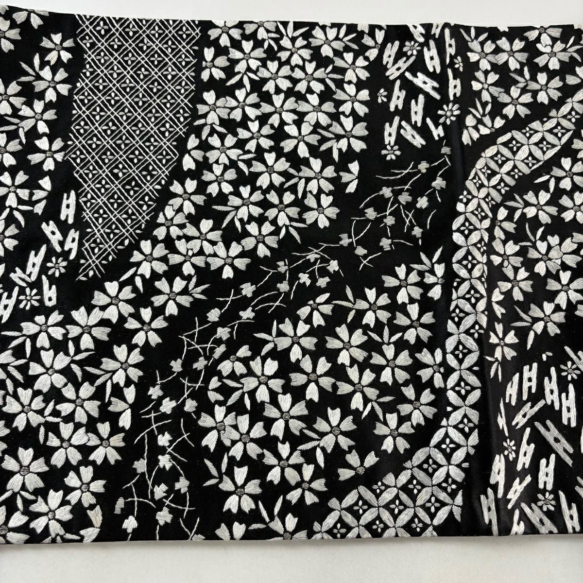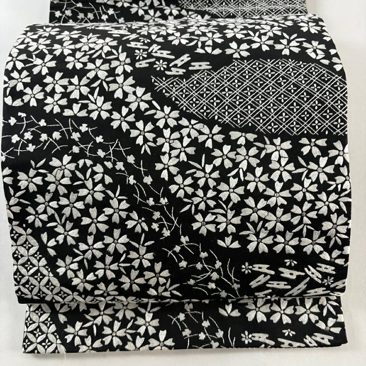 袋帯 逸品 桜 菱 刺繍 銀糸 黒 六通 正絹
