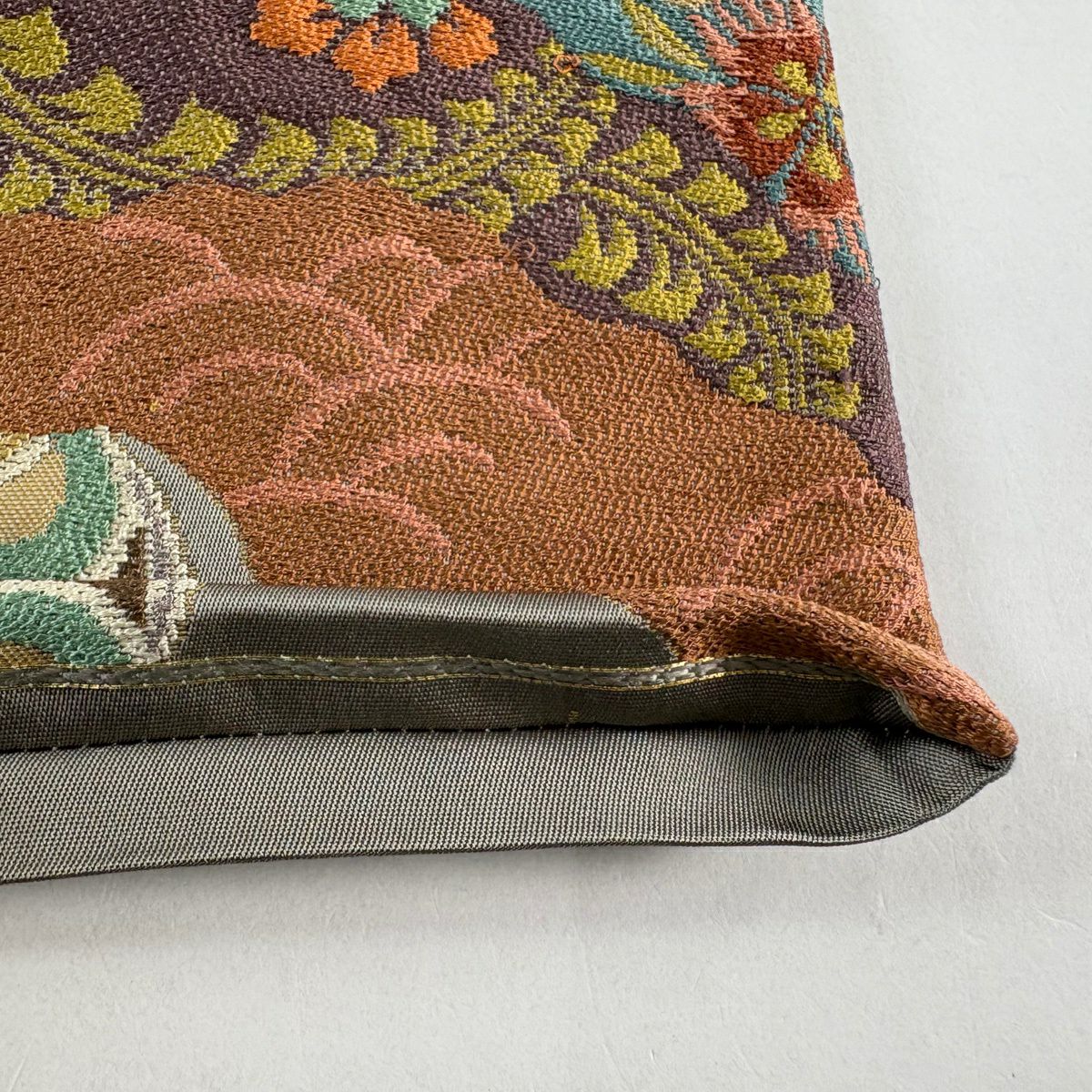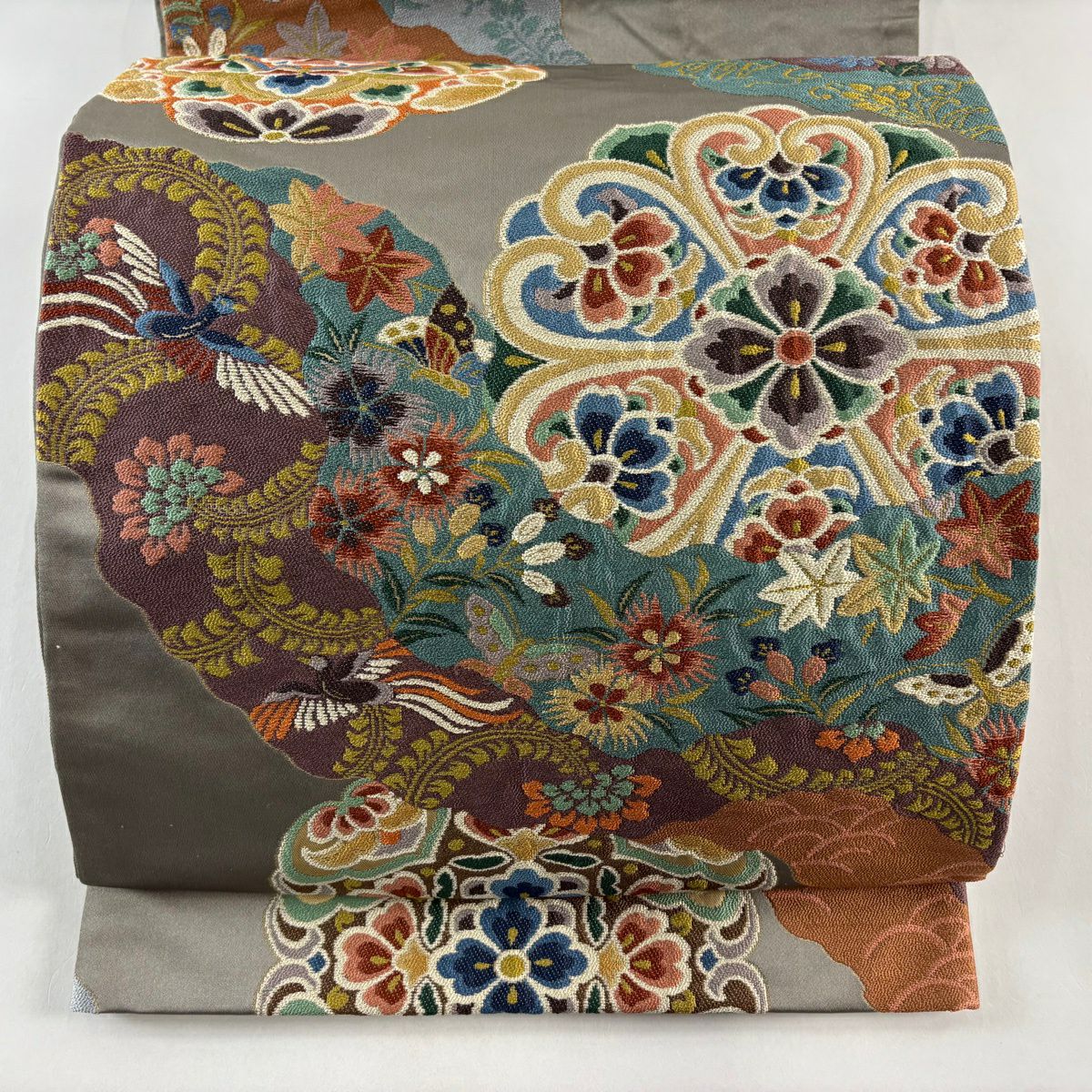 袋帯 逸品 華文 花鳥 箔 灰茶 六通 正絹