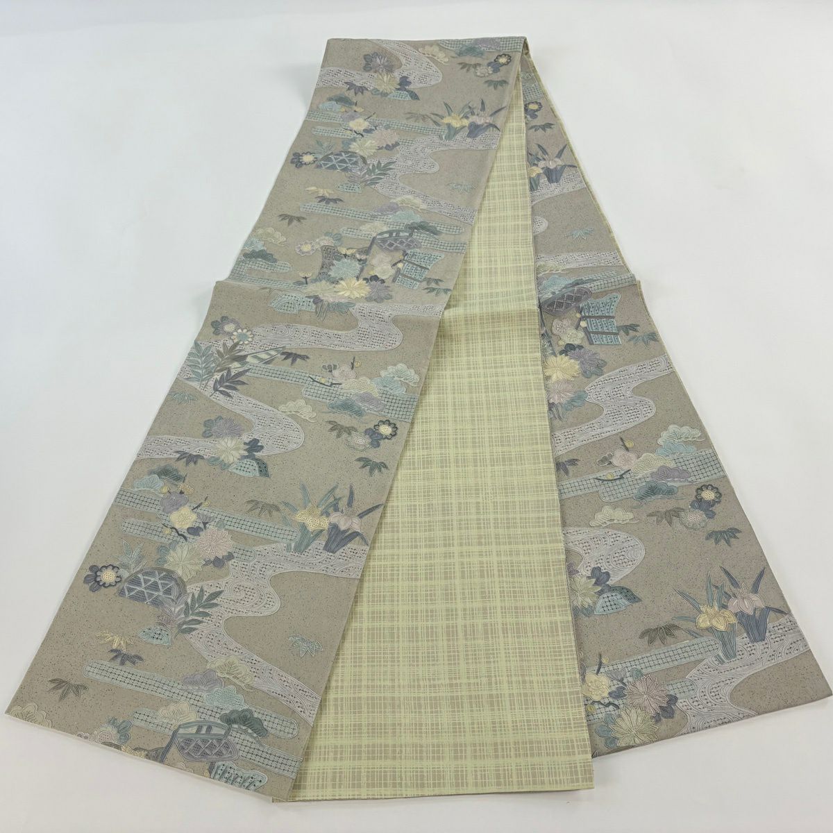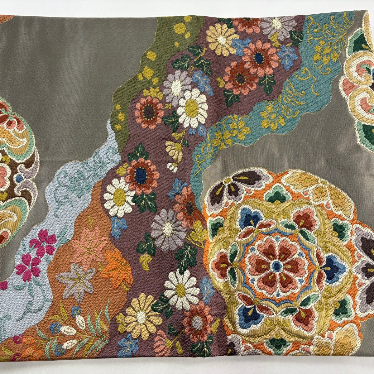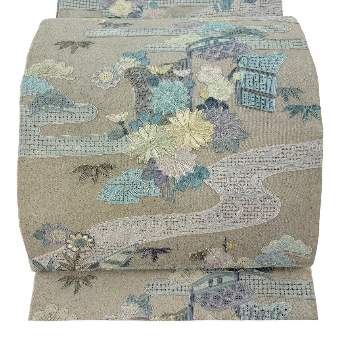 袋帯 逸品 菊 松竹梅 刺繍 灰緑 全通 正絹