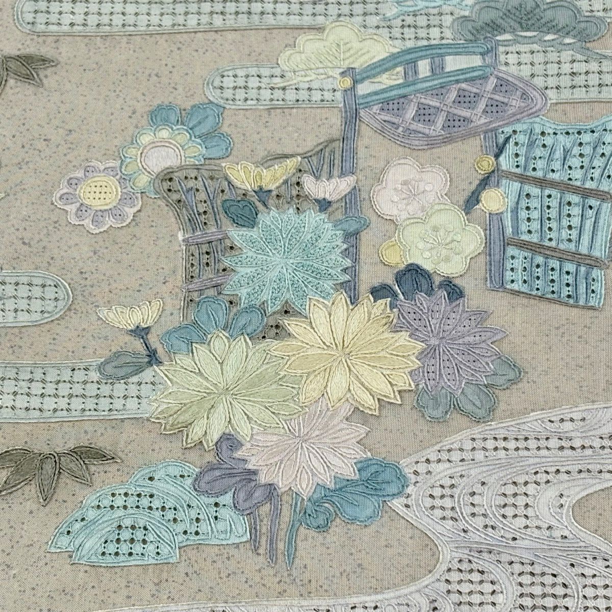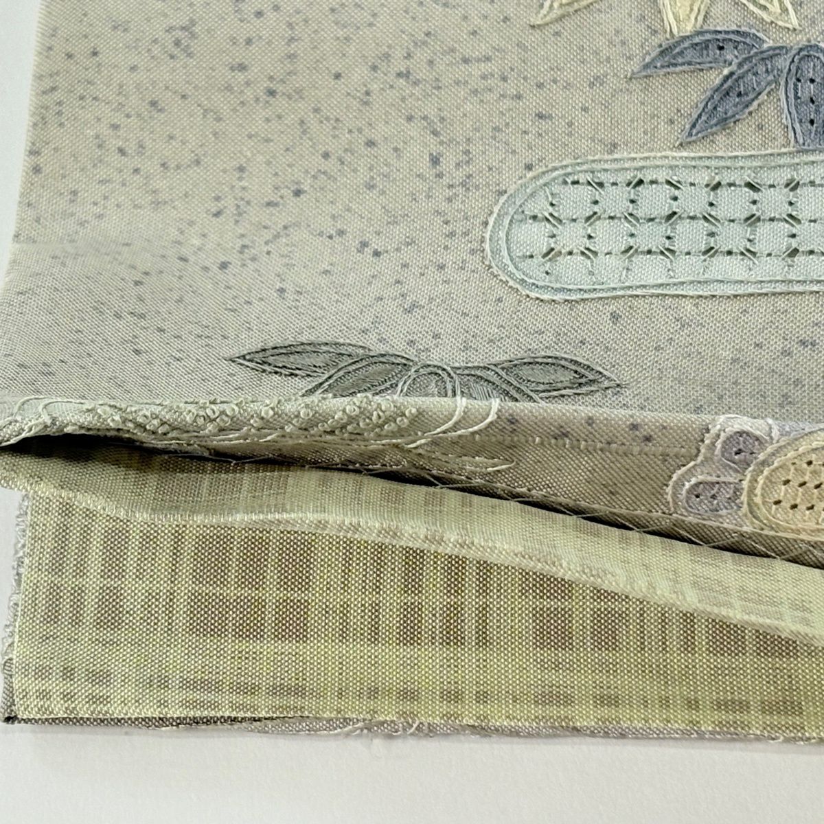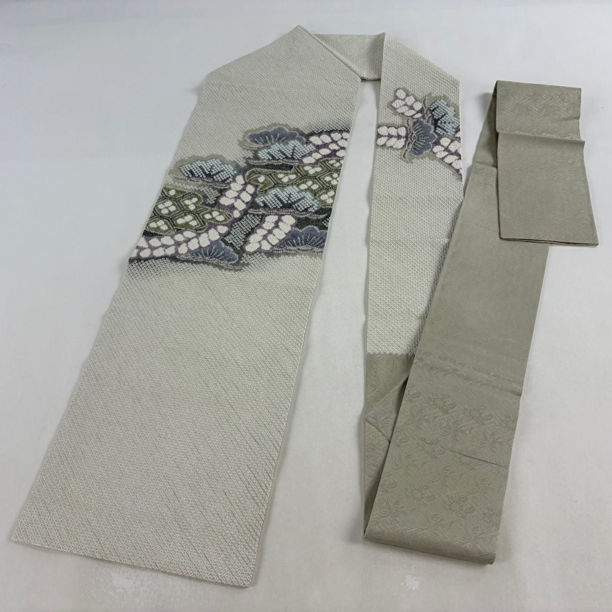 袋帯 逸品 菊 松竹梅 刺繍 灰緑 全通 正絹