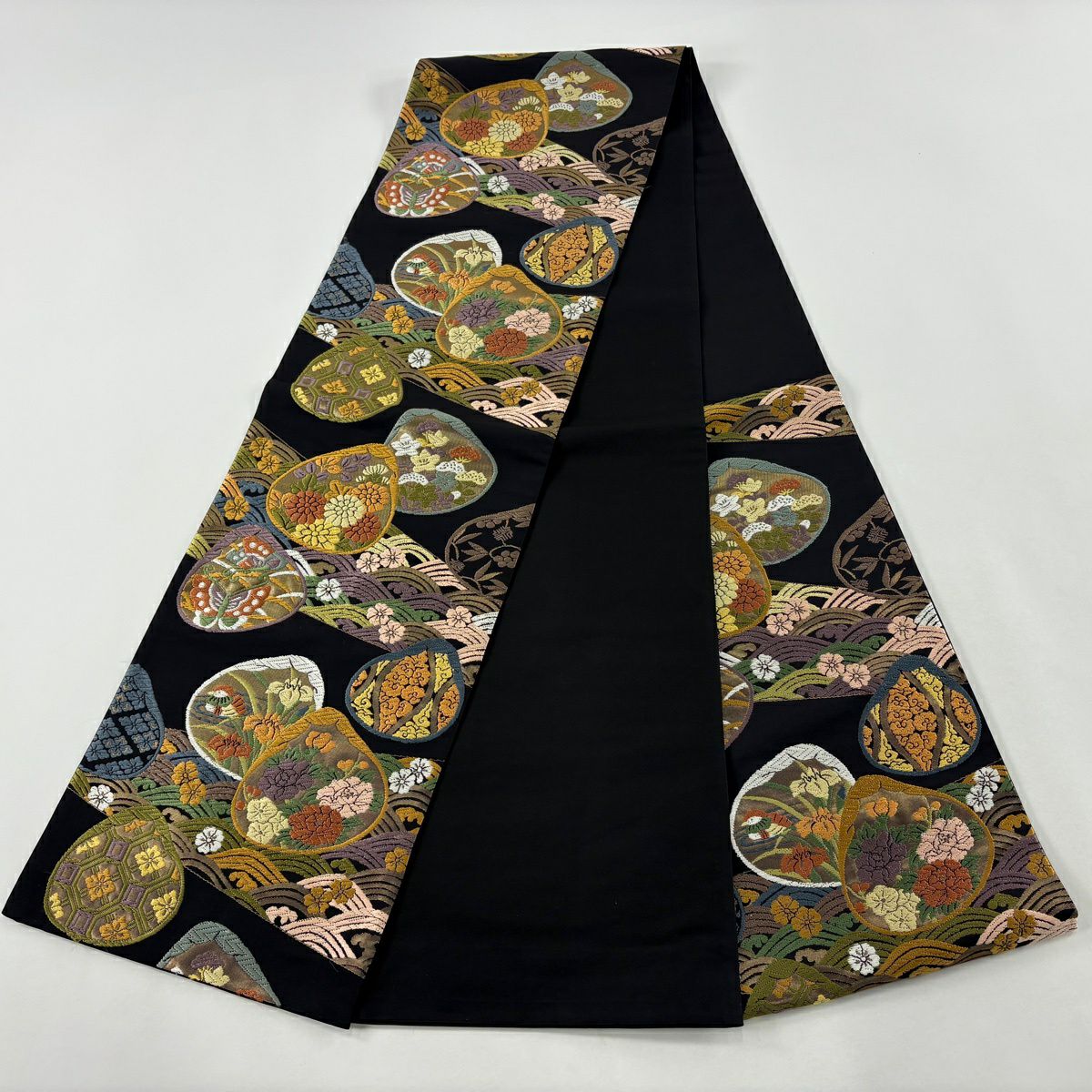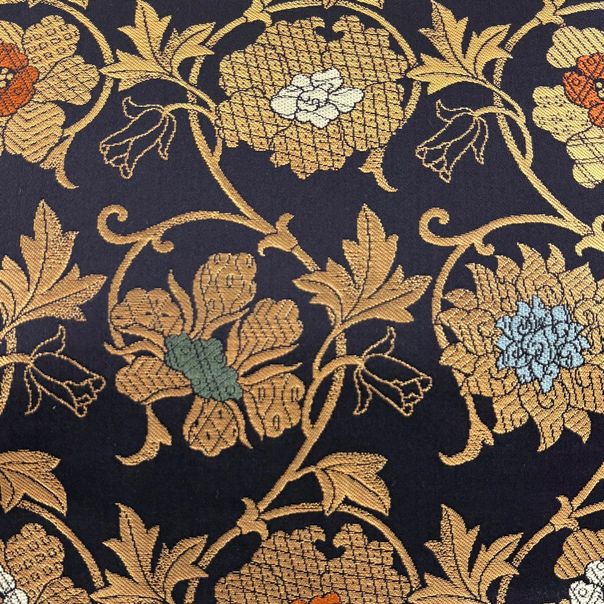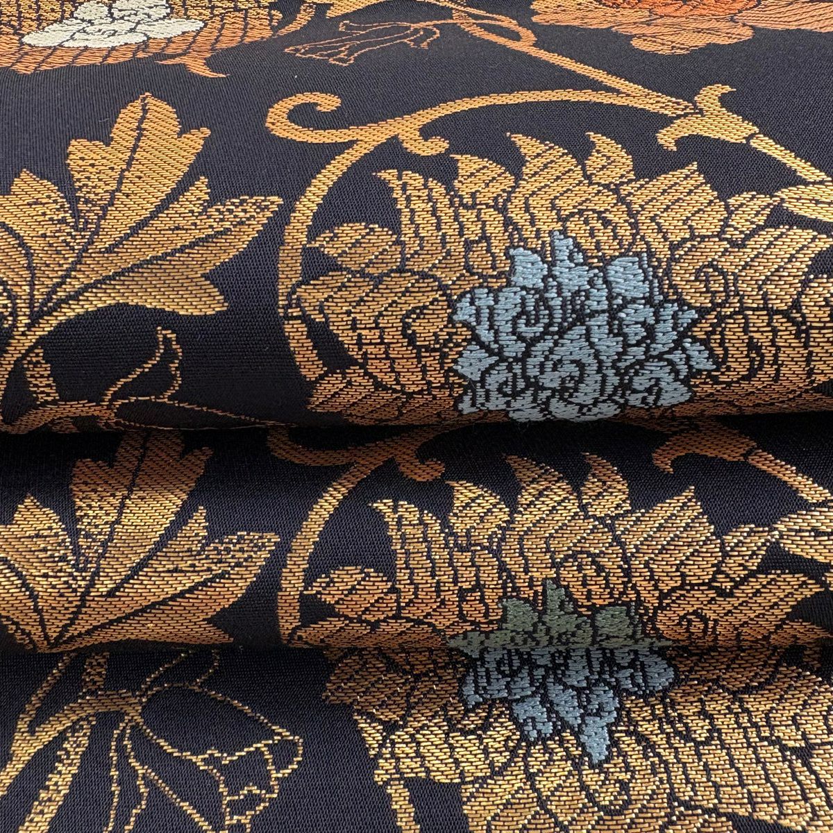 袋帯 逸品 草花 貝 刺繍 箔 黒 六通 正絹