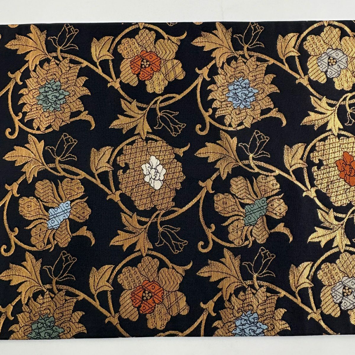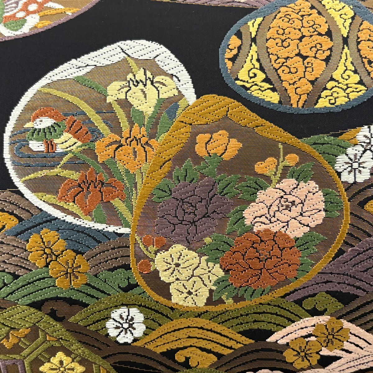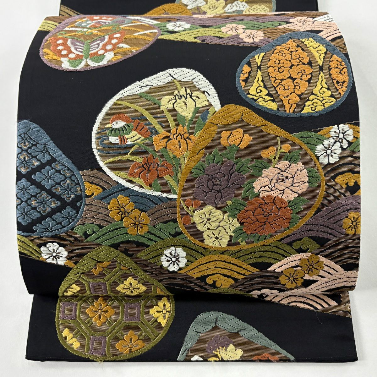袋帯 逸品 草花 貝 刺繍 箔 黒 六通 正絹