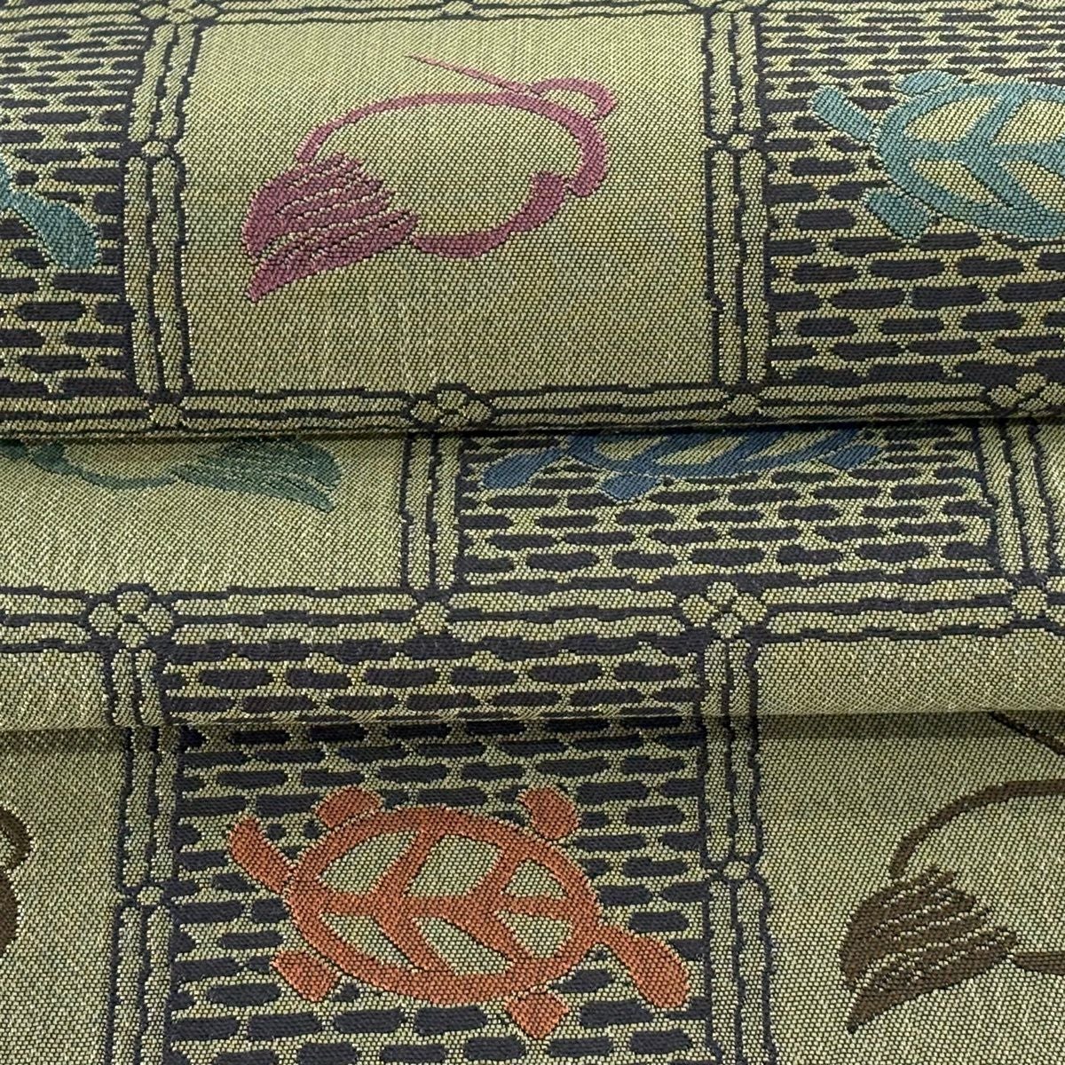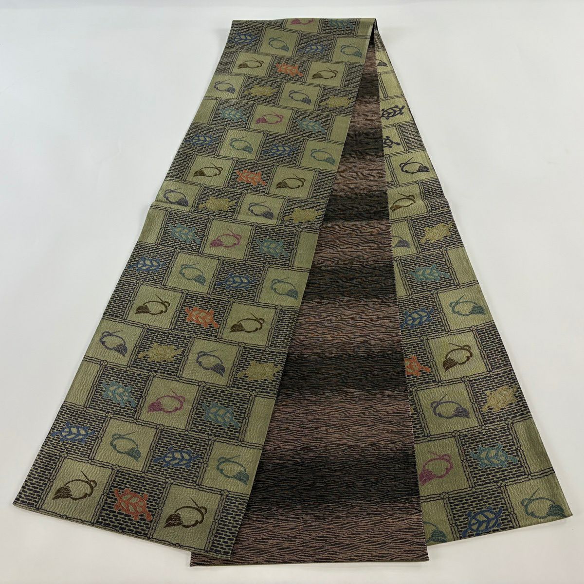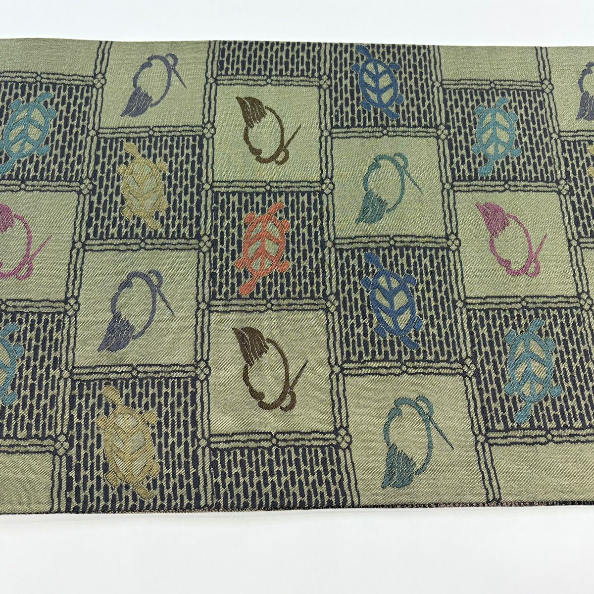 【美品】 袋帯 逸品 鶴 亀 灰緑 六通 正絹