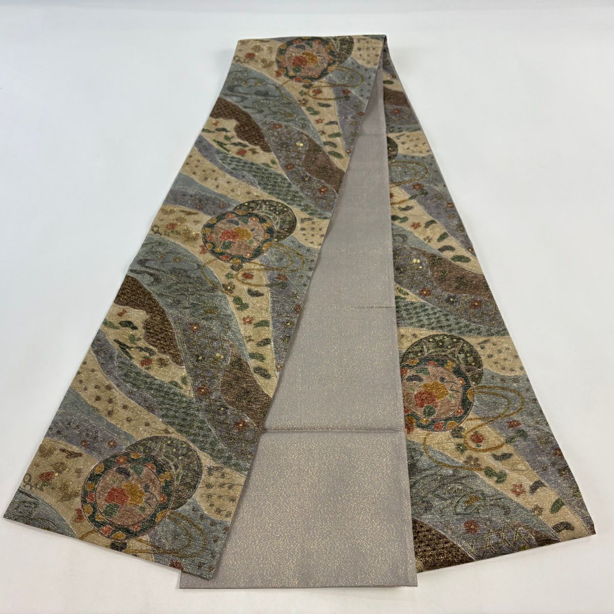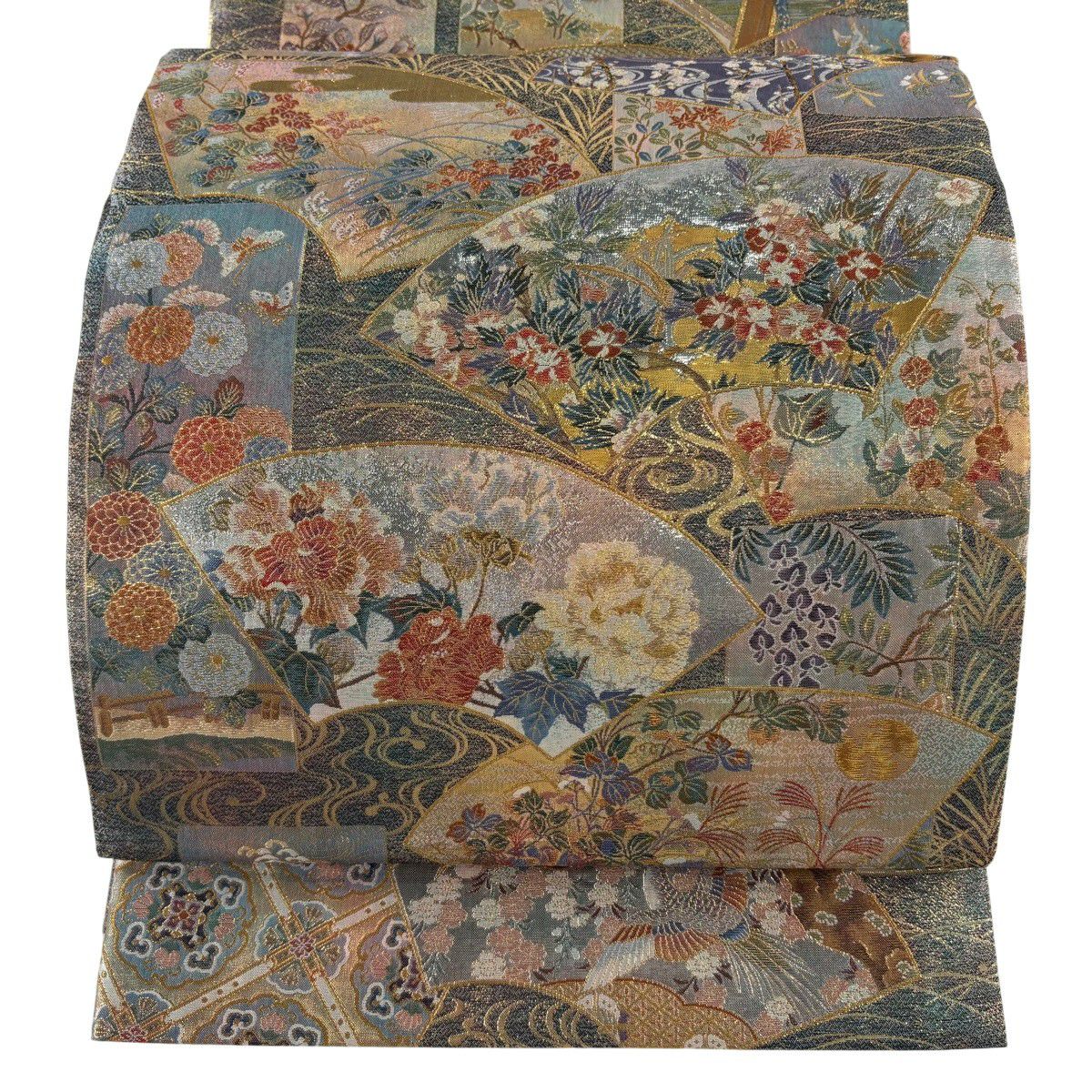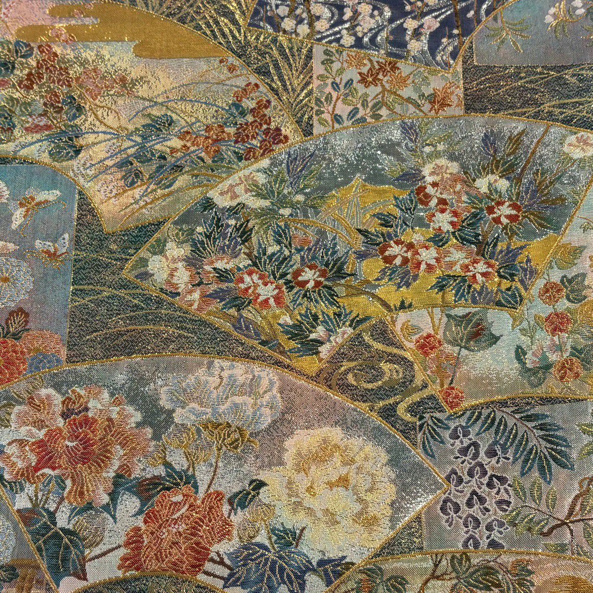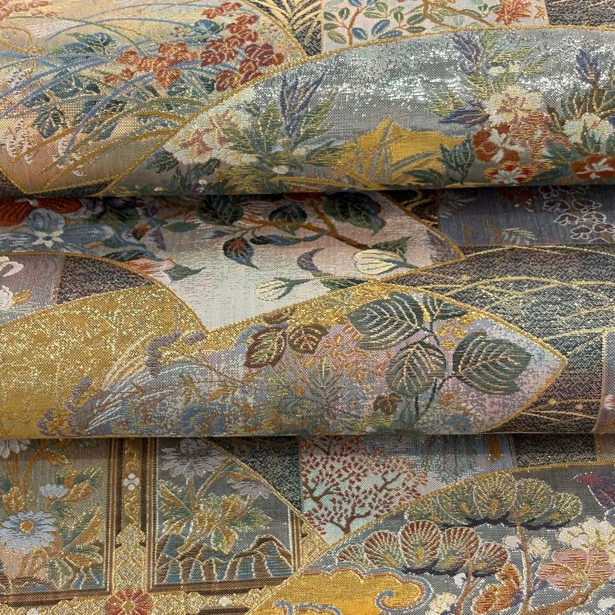 袋帯 逸品 じゅらく 落款あり 扇 草花 金糸 箔 青灰色 六通 正絹