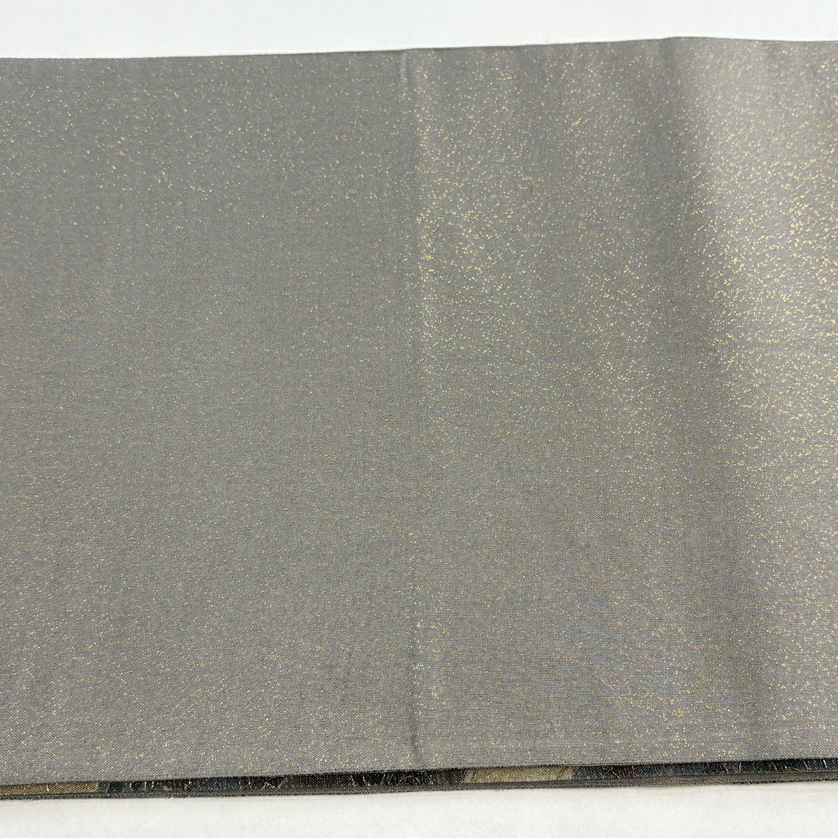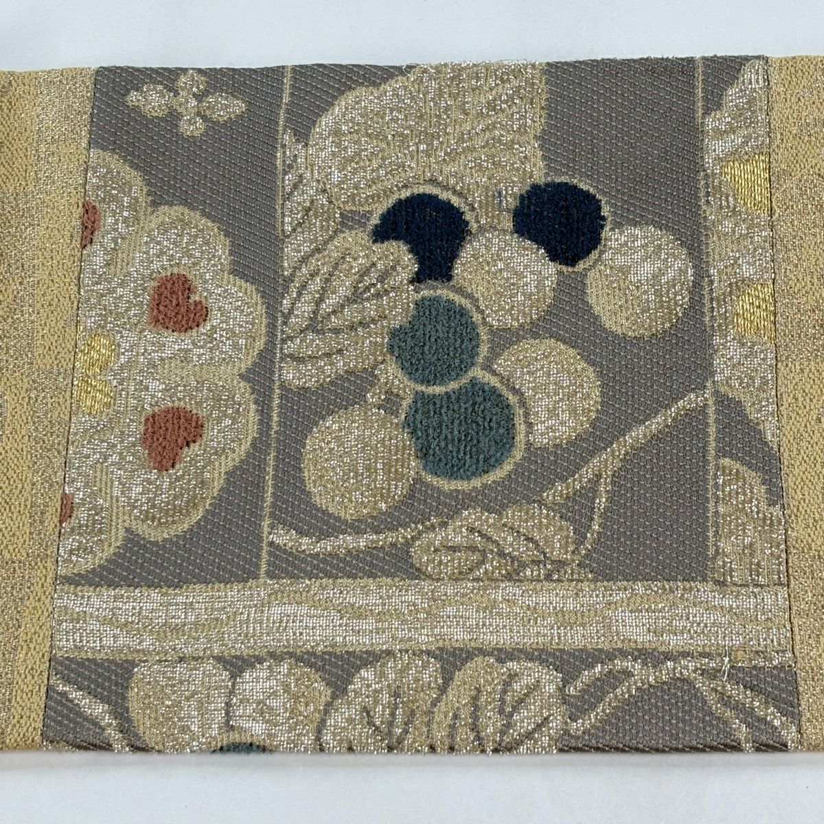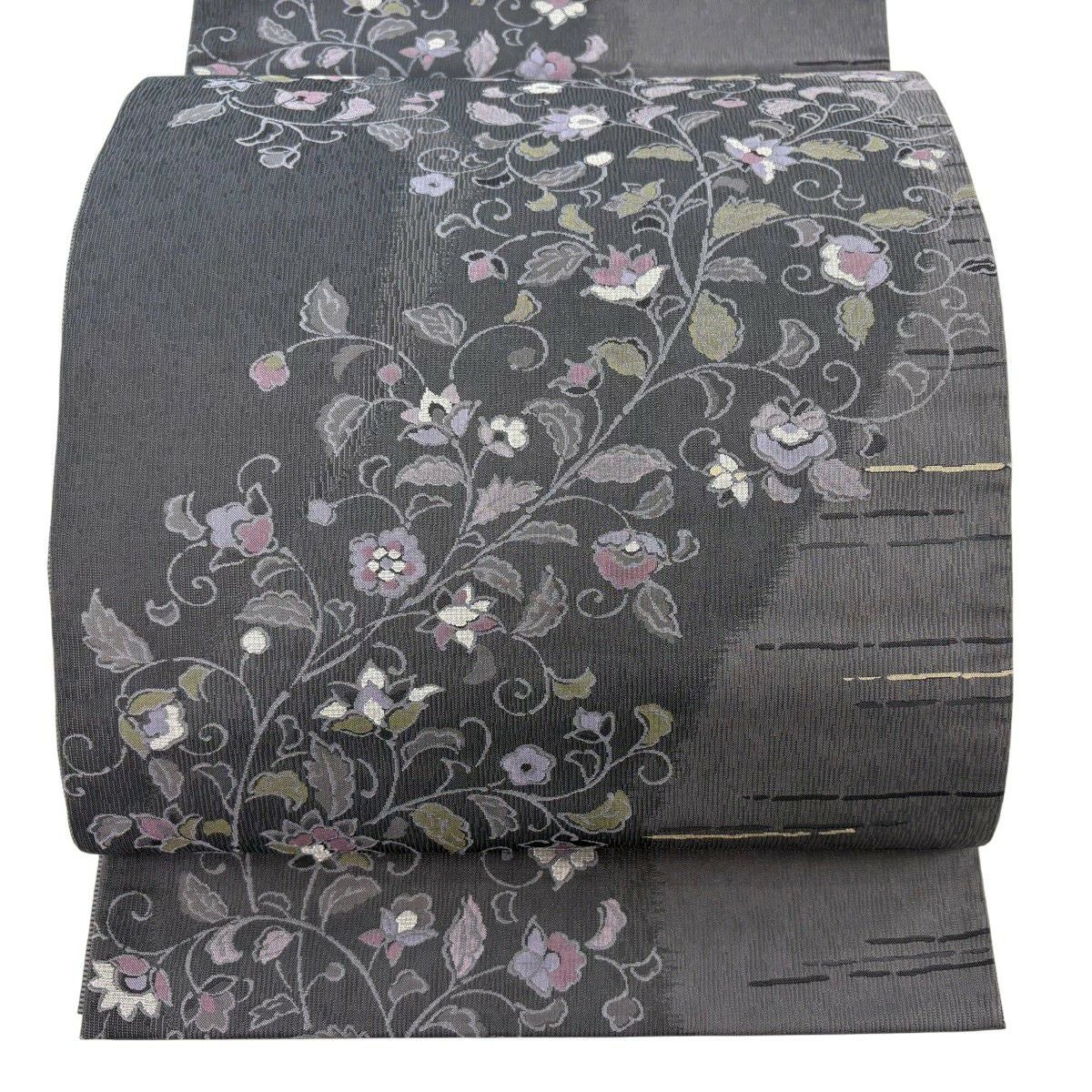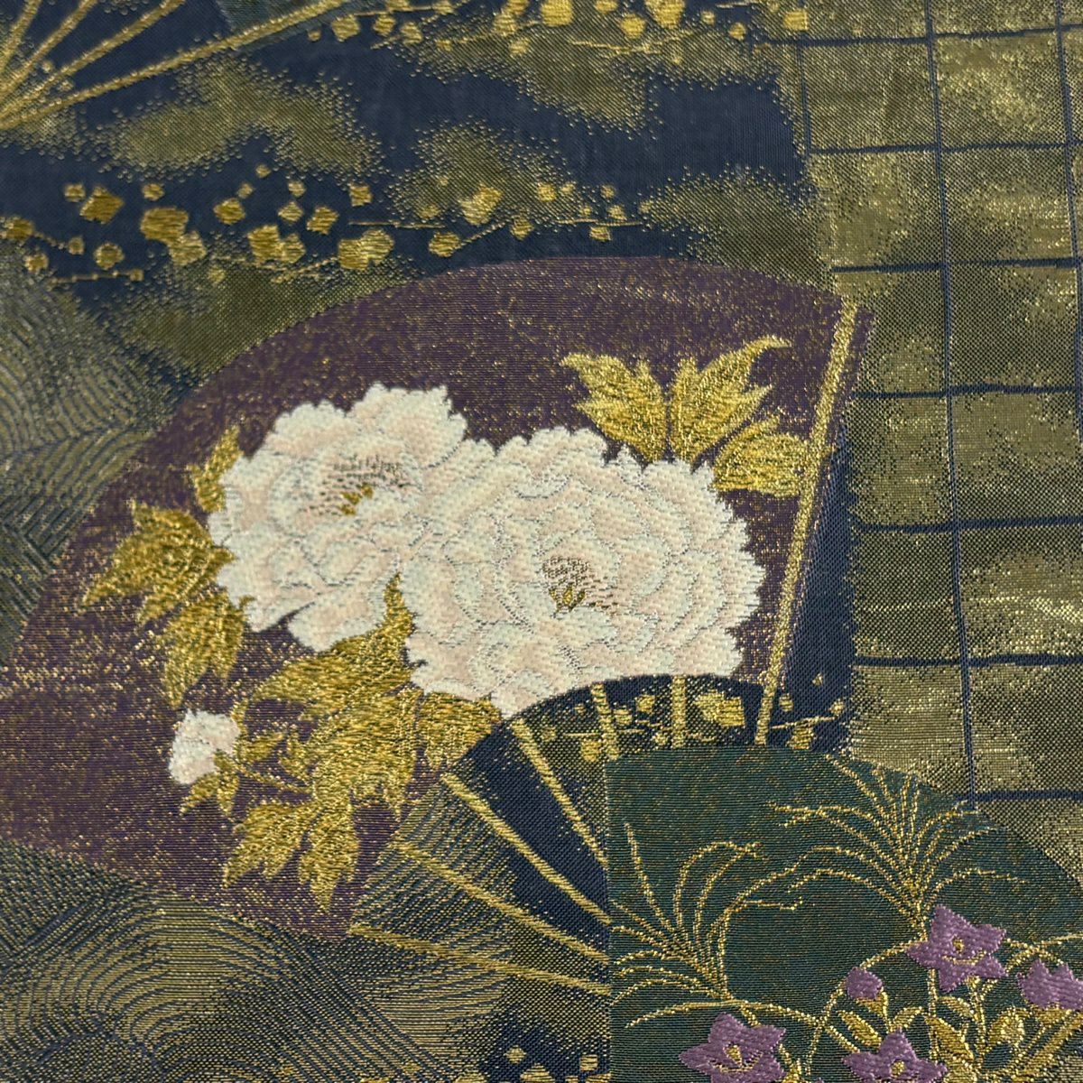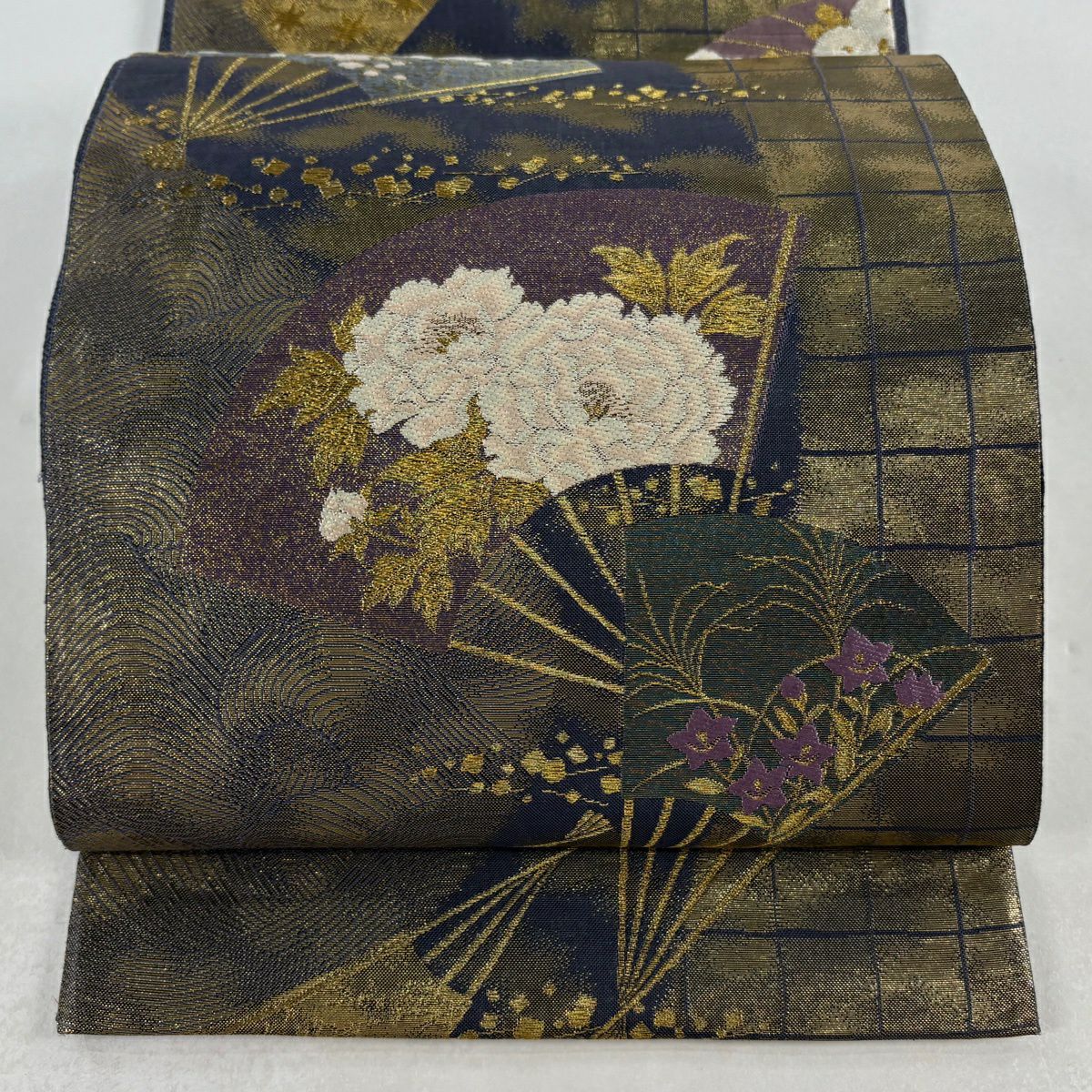 袋帯 逸品 じゅらく 落款あり 扇 草花 金糸 箔 青灰色 六通 正絹