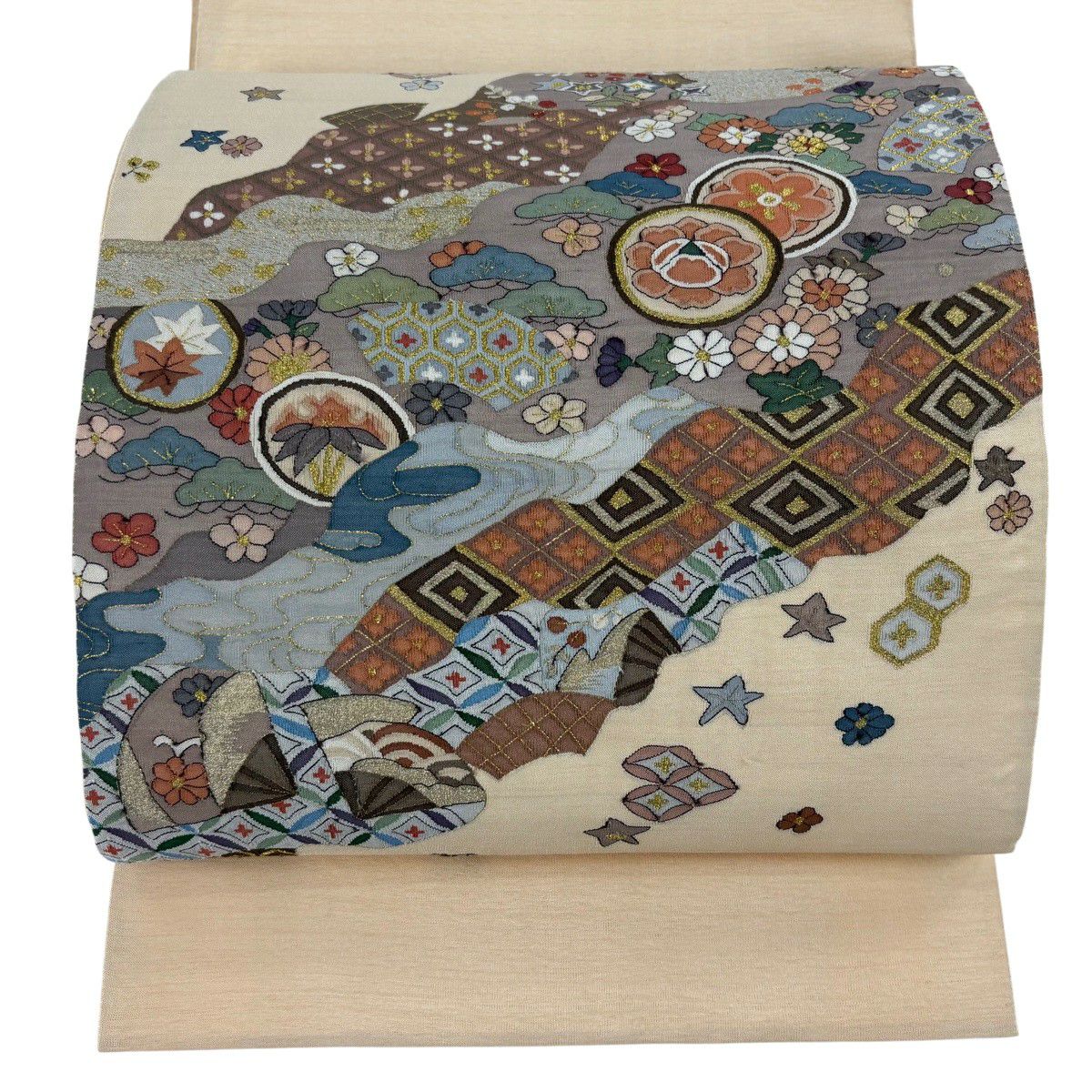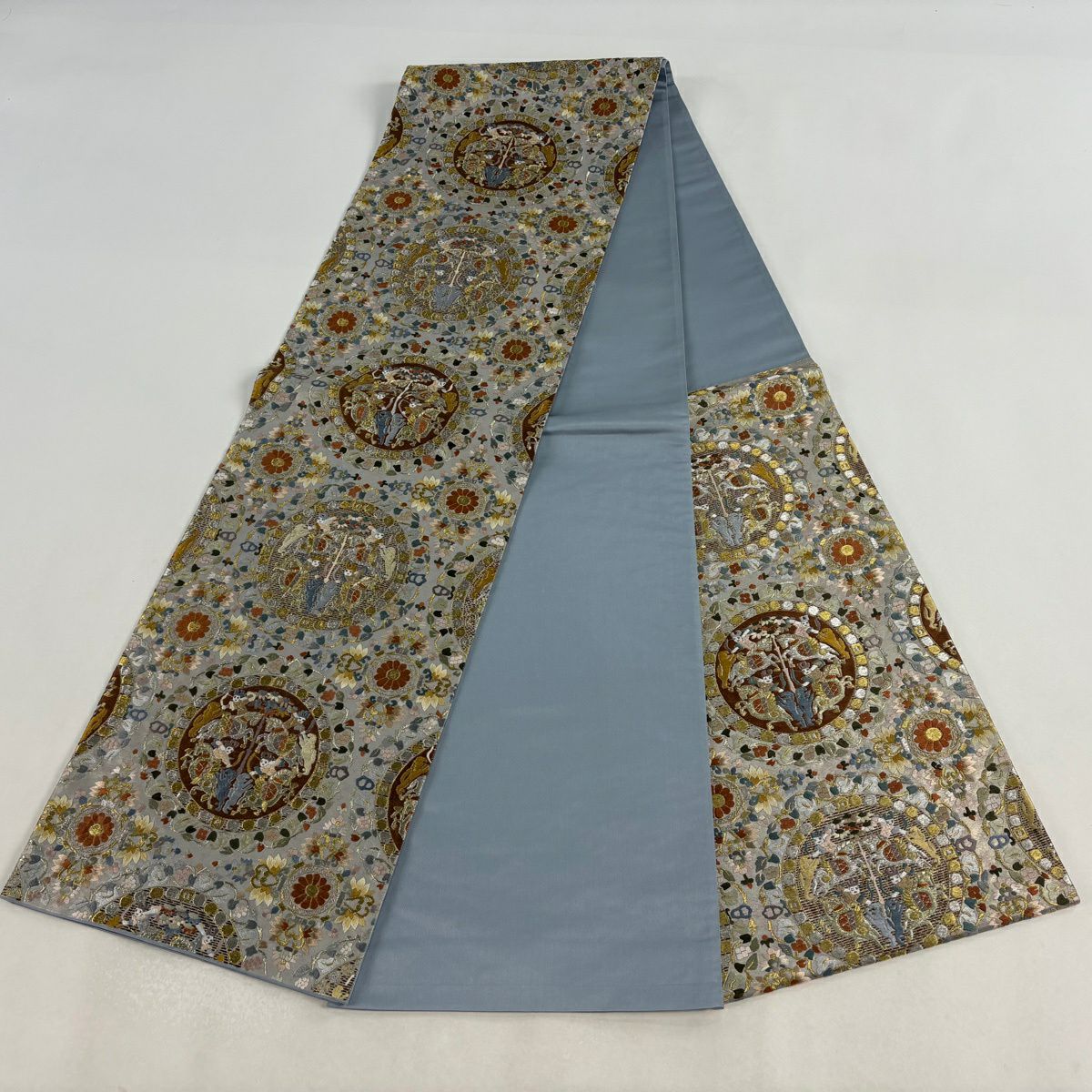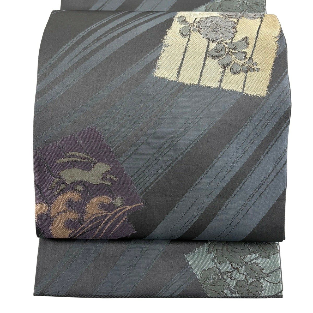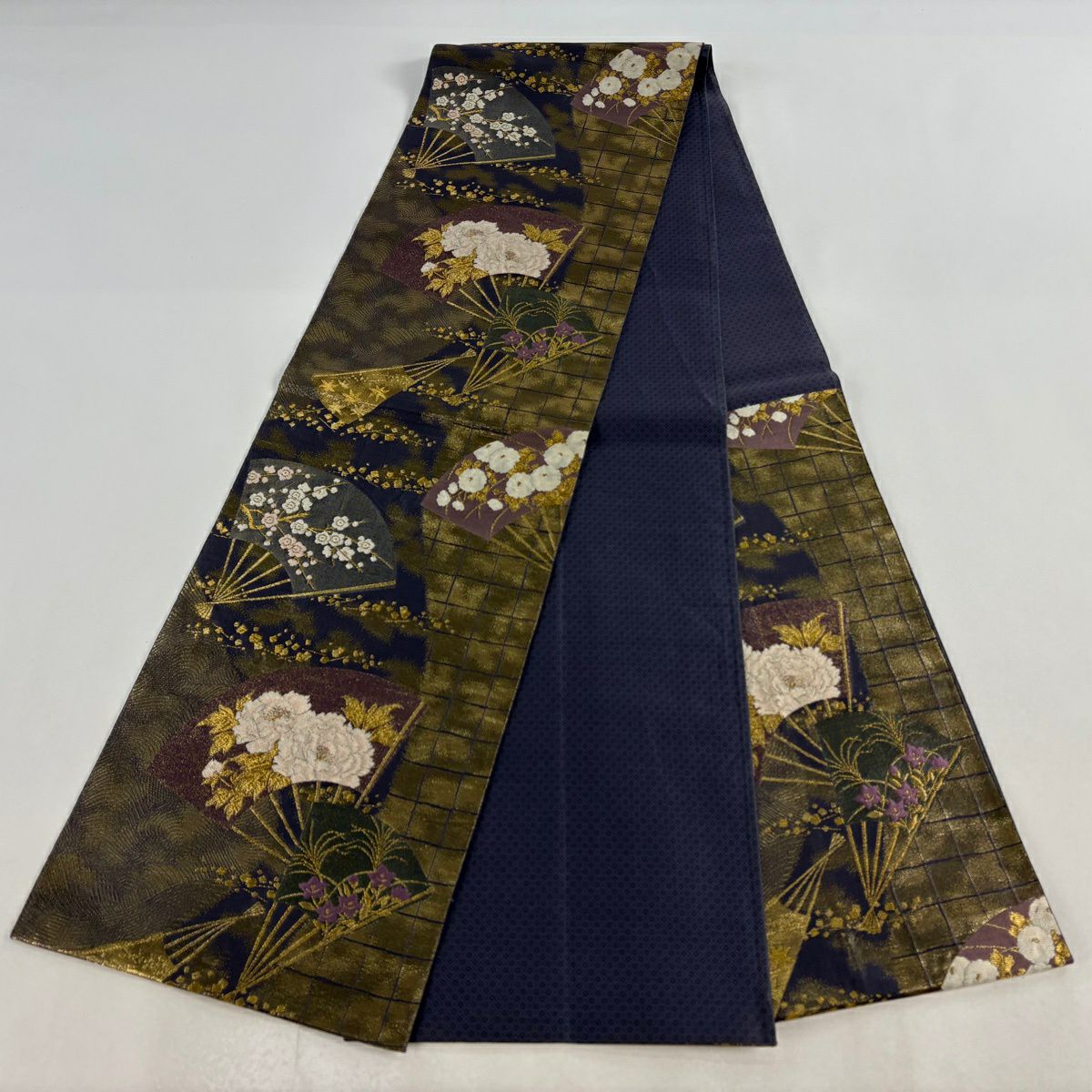袋帯 逸品 じゅらく 落款あり 扇 草花 金糸 箔 青灰色 六通 正絹