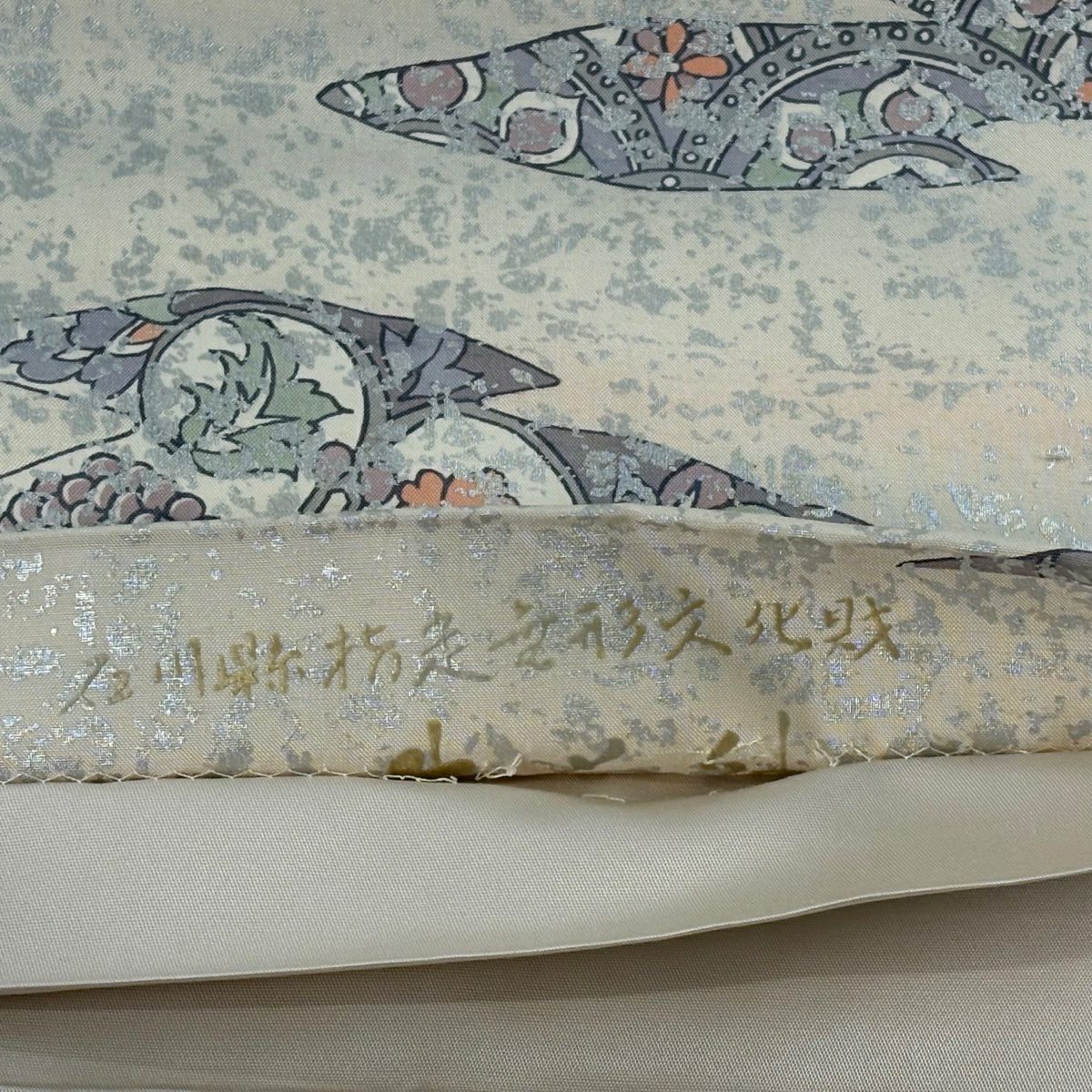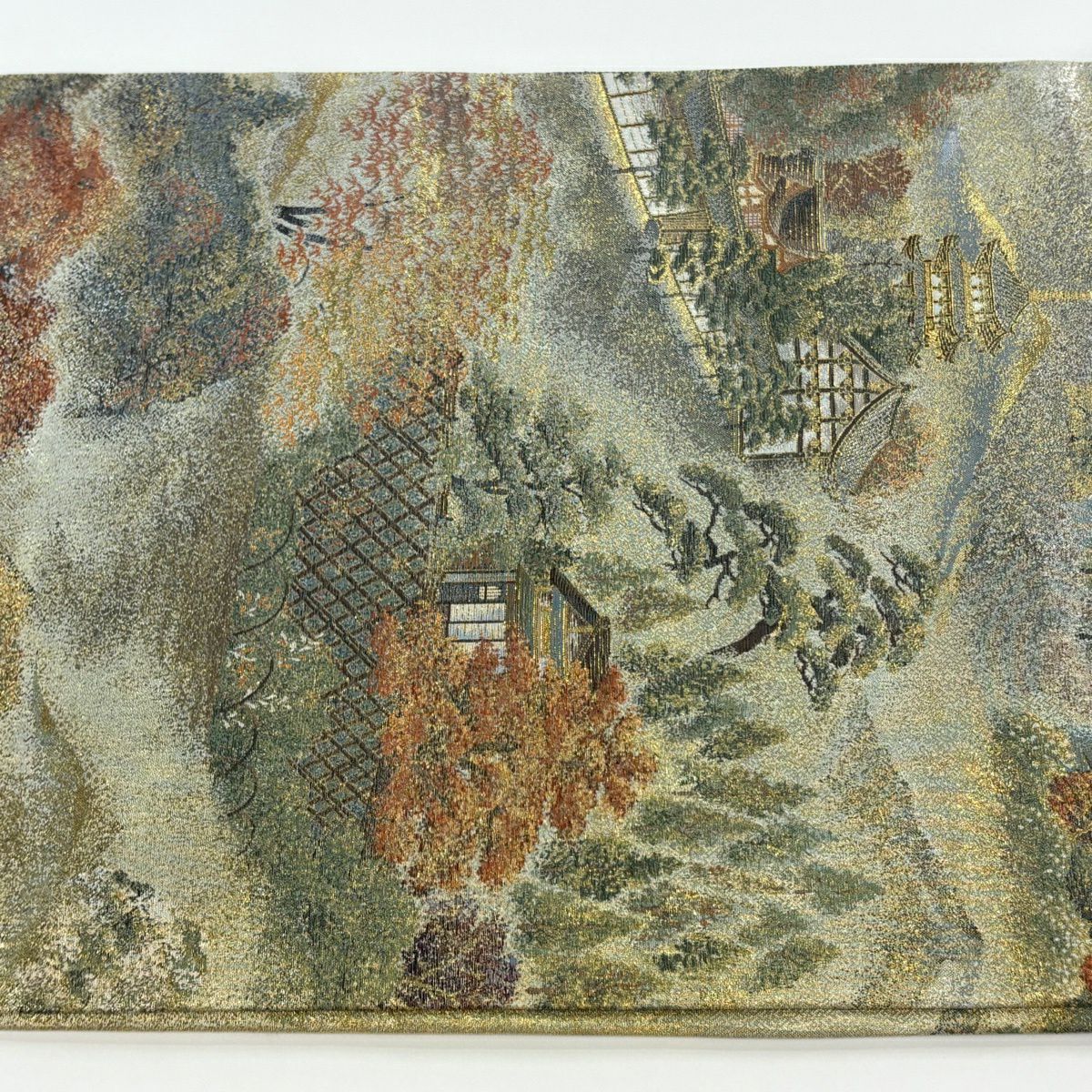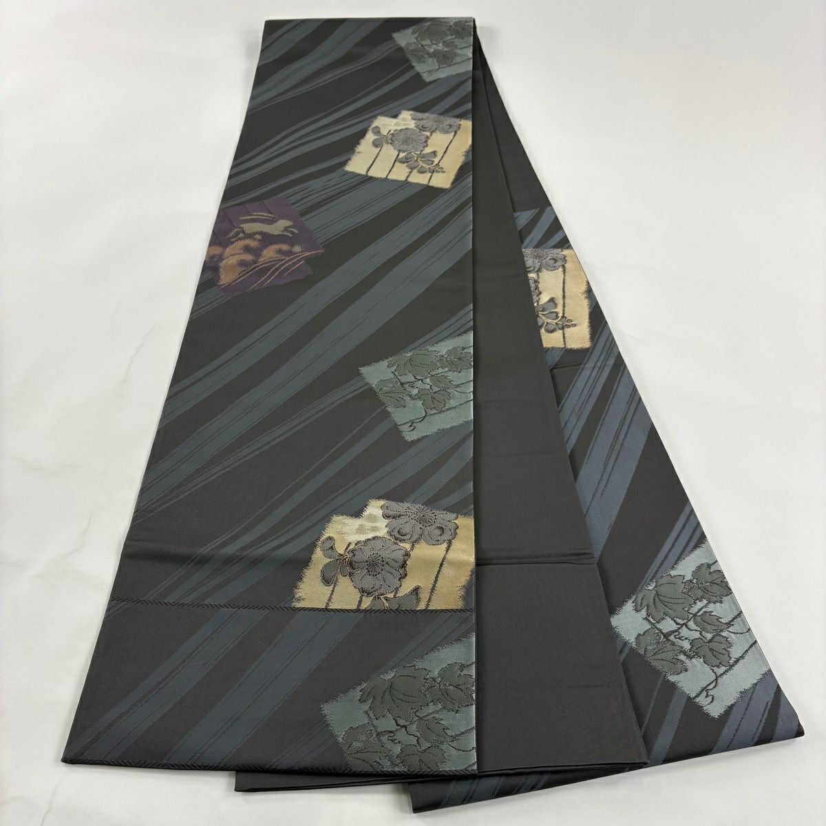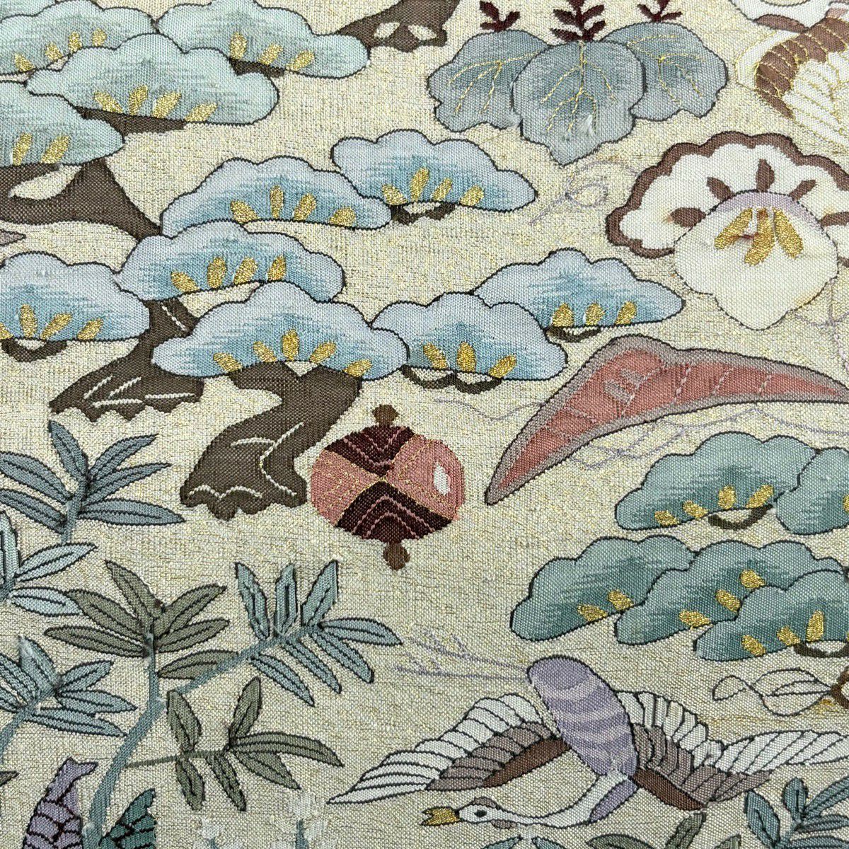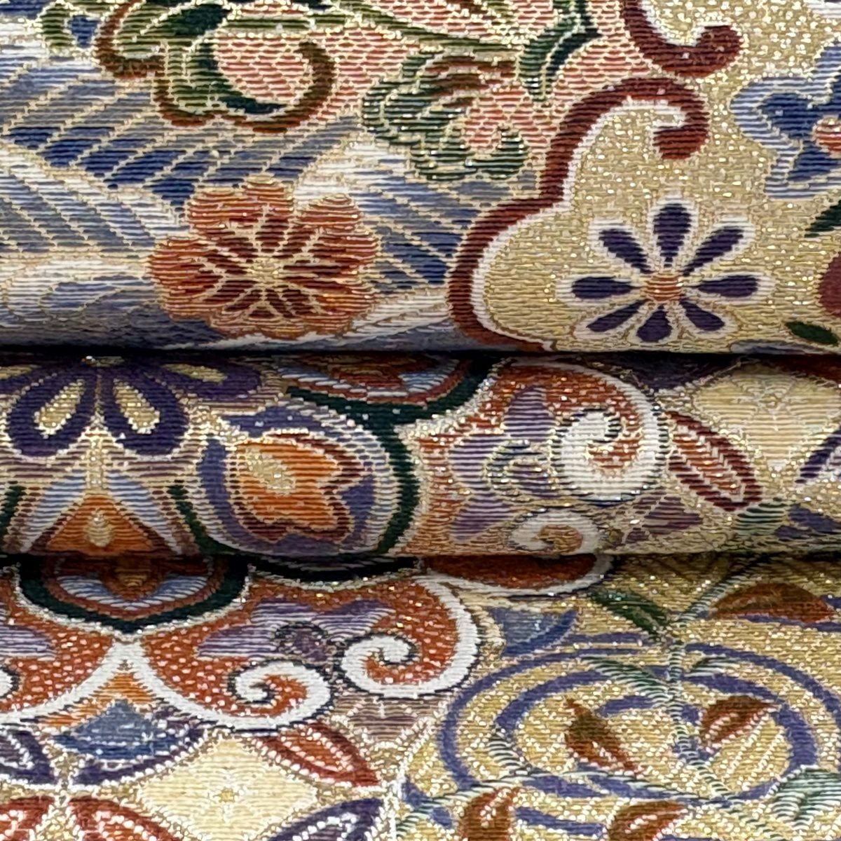 袋帯 逸品 じゅらく 落款あり 扇 草花 金糸 箔 青灰色 六通 正絹