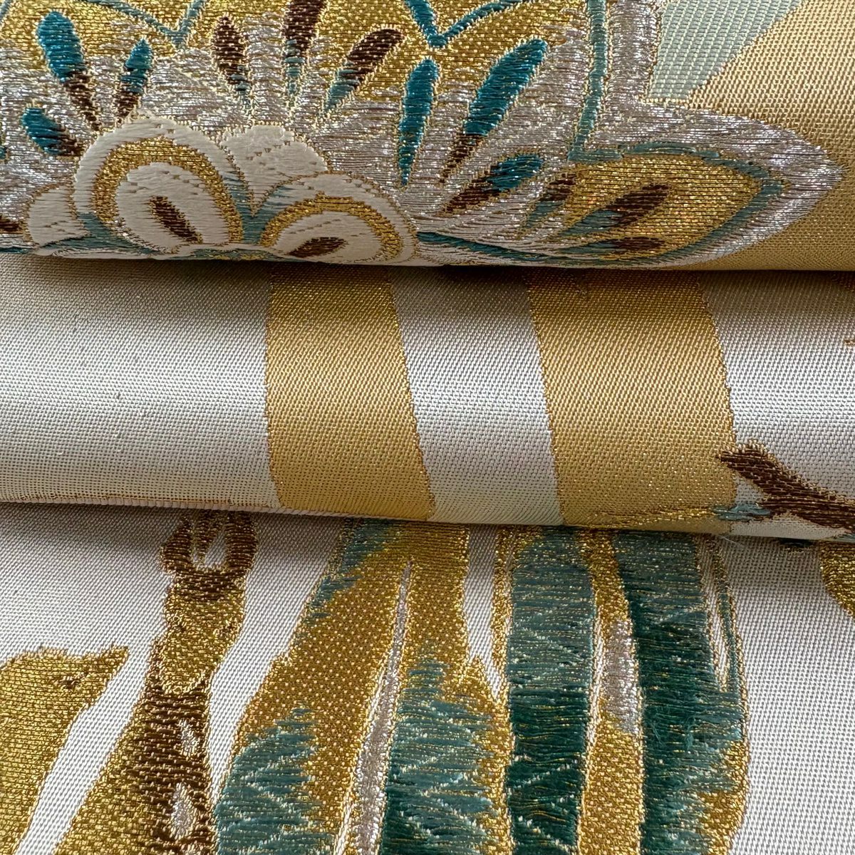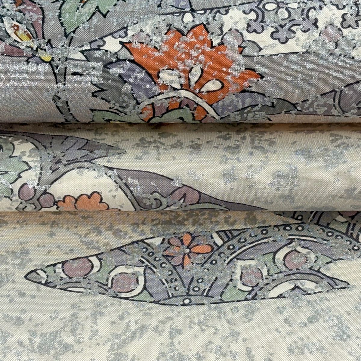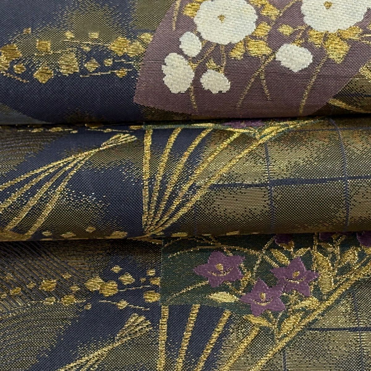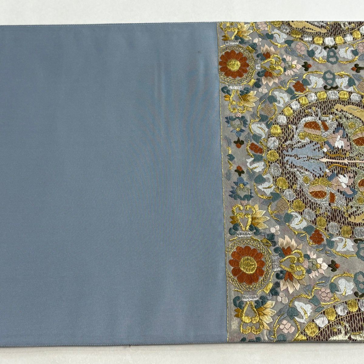 袋帯 逸品 じゅらく 落款あり 扇 草花 金糸 箔 青灰色 六通 正絹