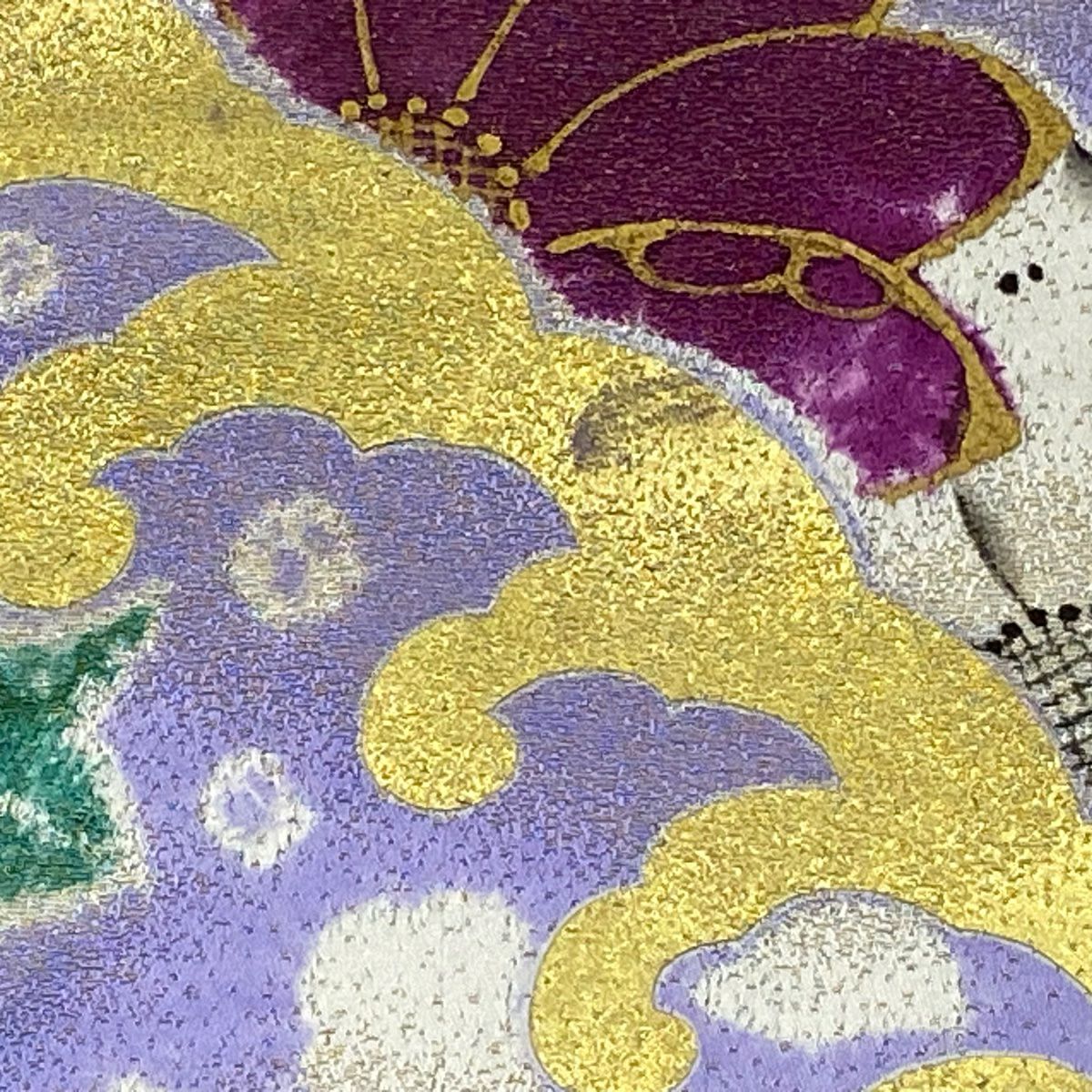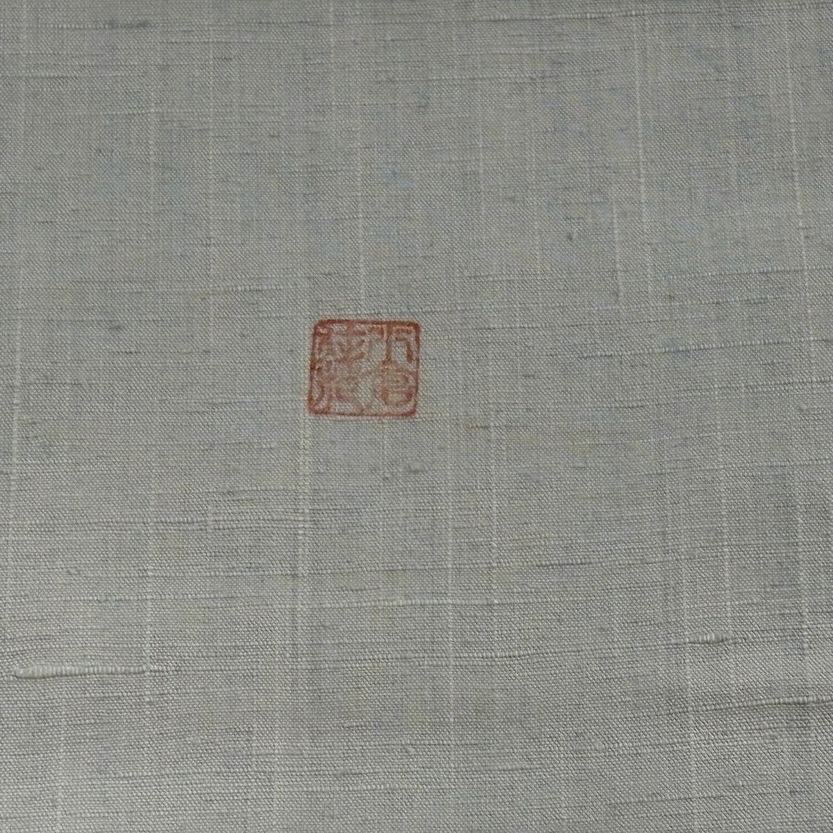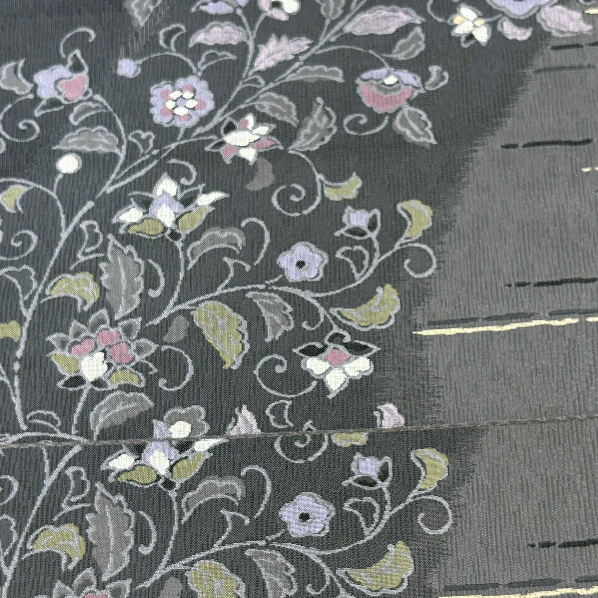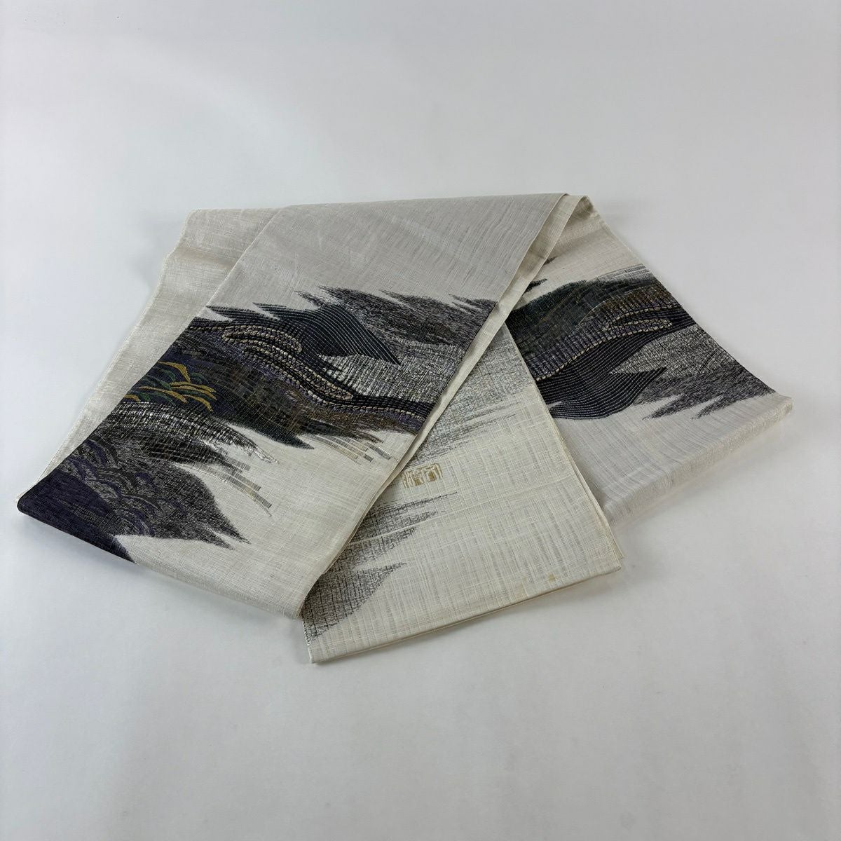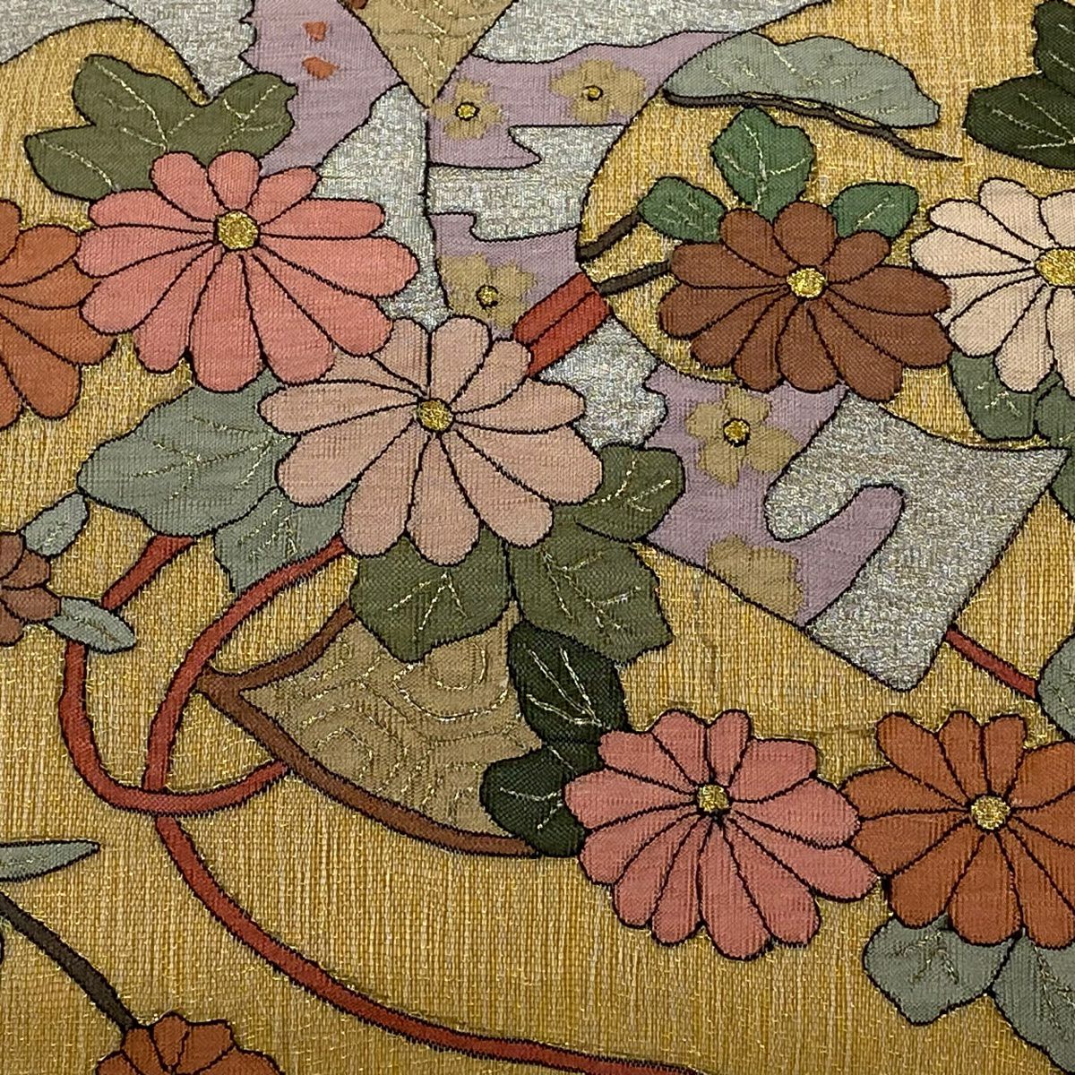 袋帯 逸品 じゅらく 落款あり 扇 草花 金糸 箔 青灰色 六通 正絹