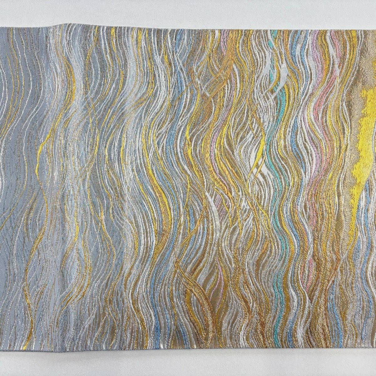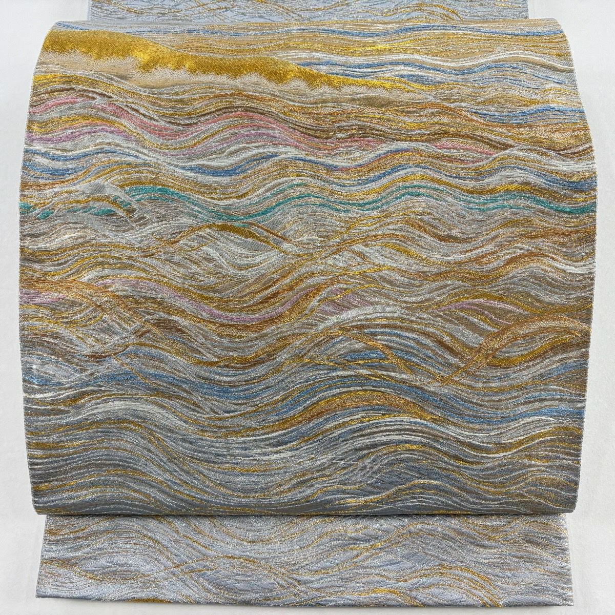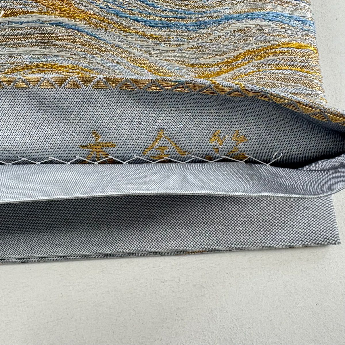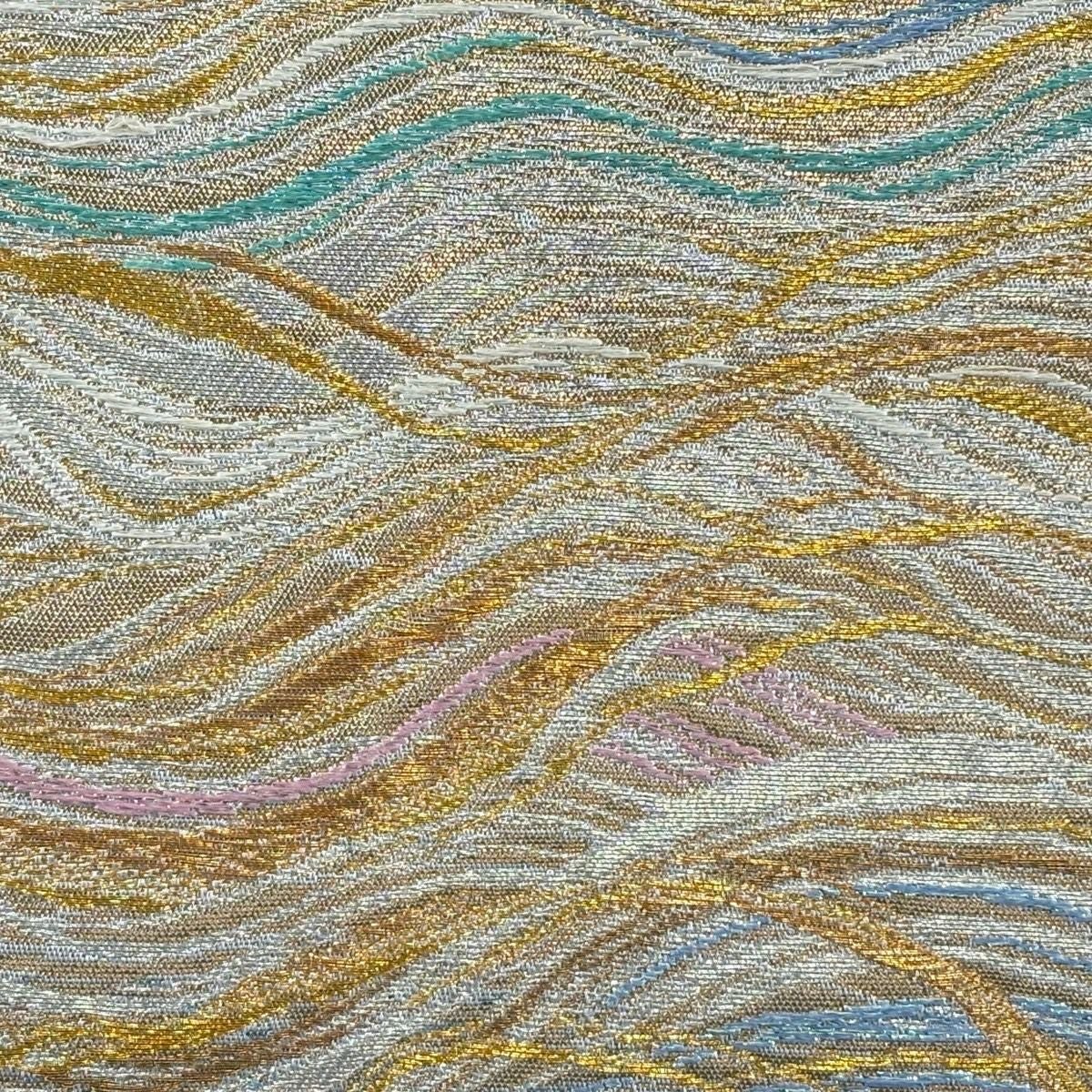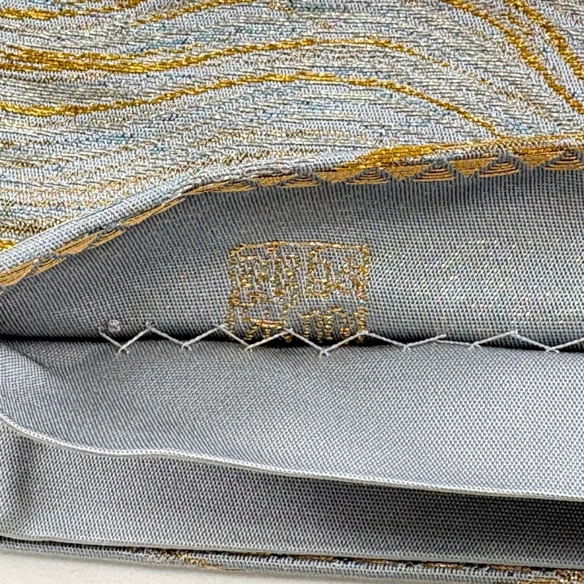 袋帯 逸品 じゅらく 落款あり 波 金銀糸 本金箔 青灰色 六通 正絹