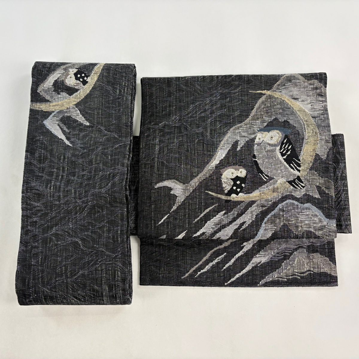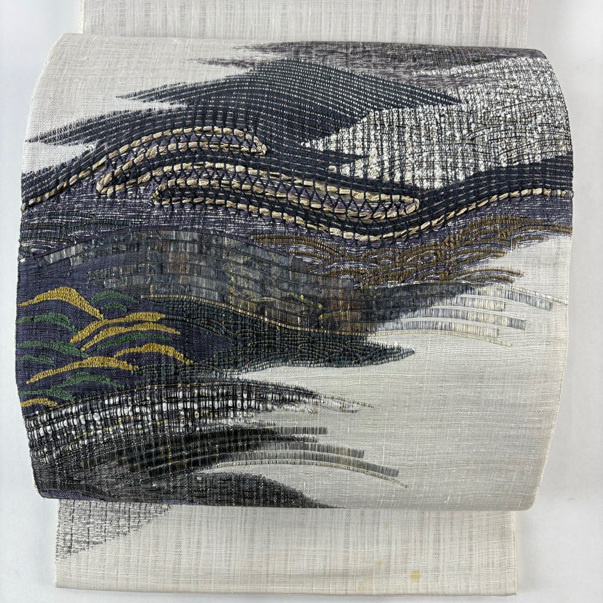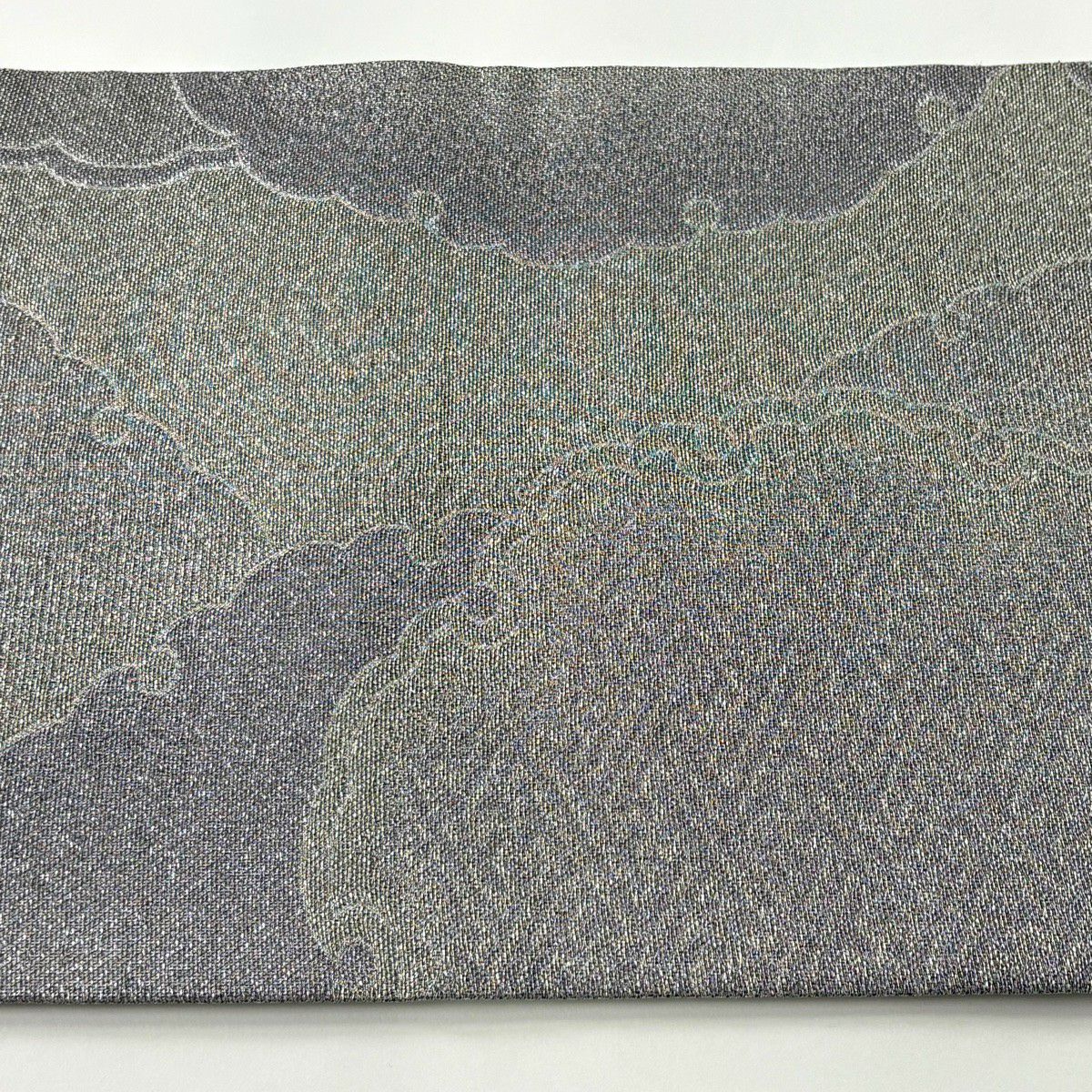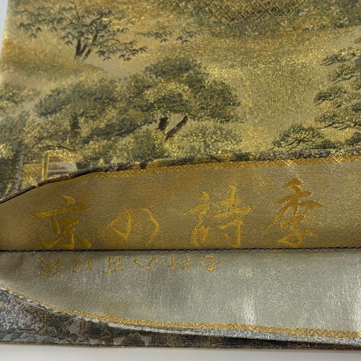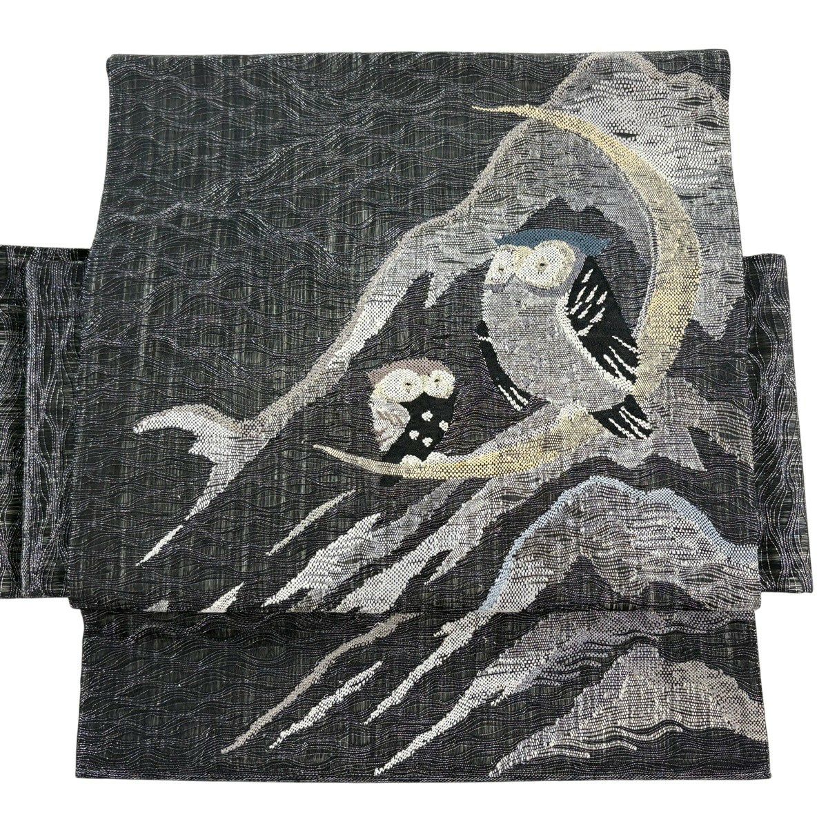 袋帯 逸品 じゅらく 落款あり 波 金銀糸 本金箔 青灰色 六通 正絹