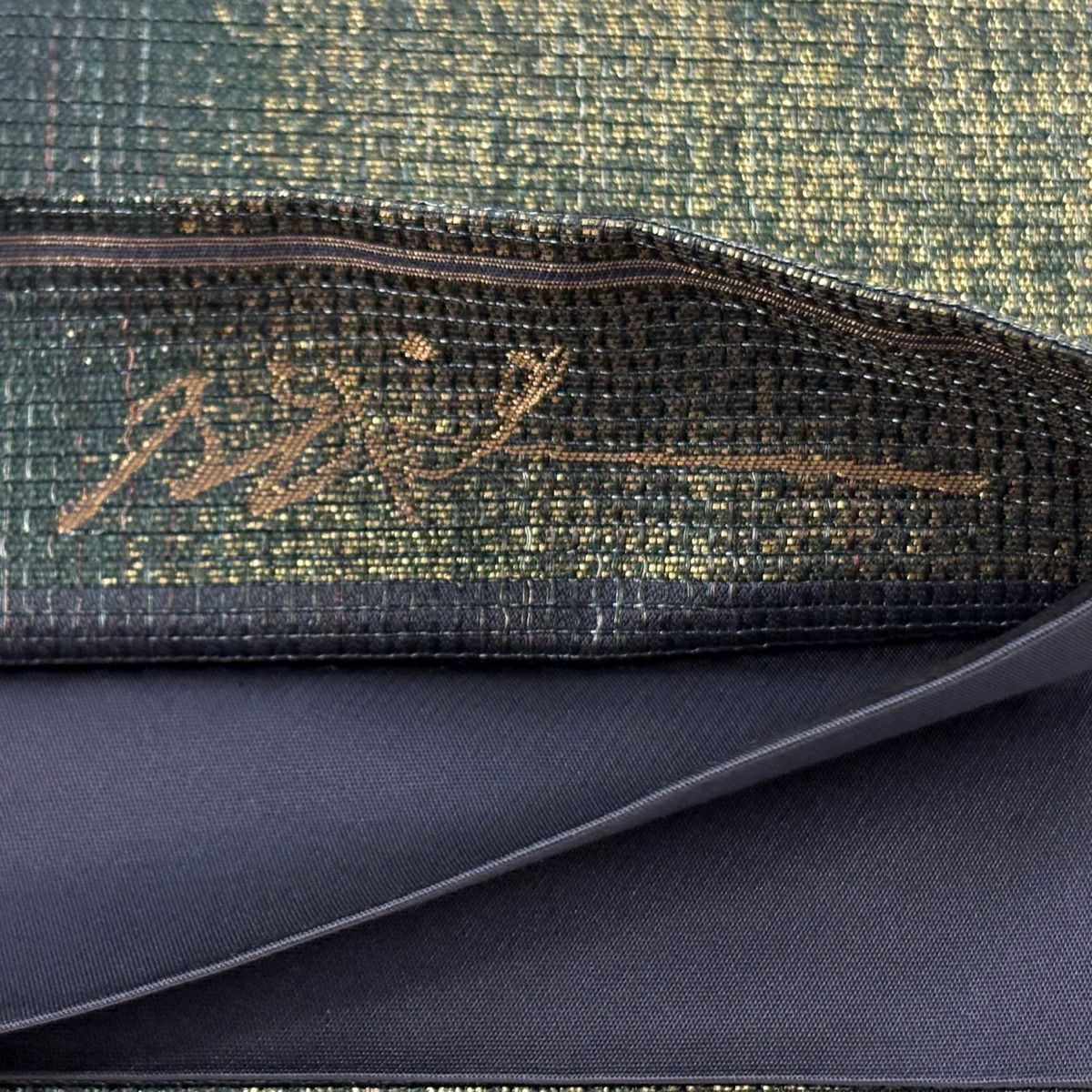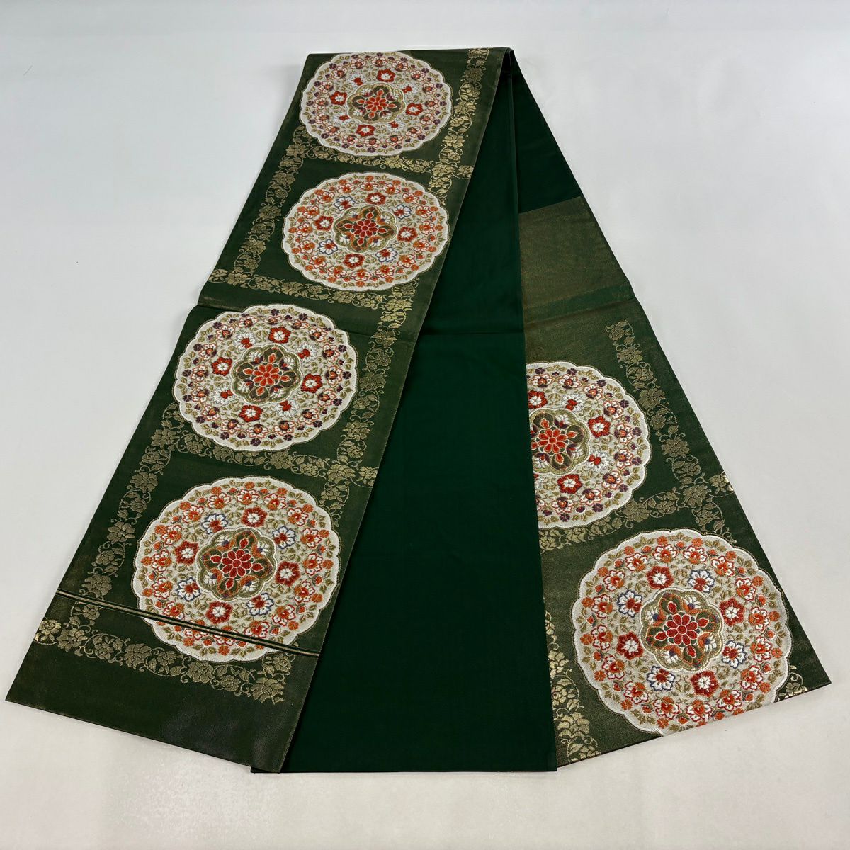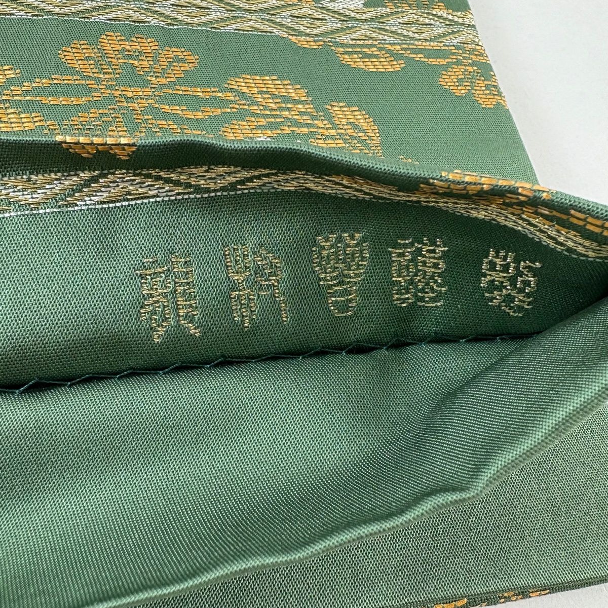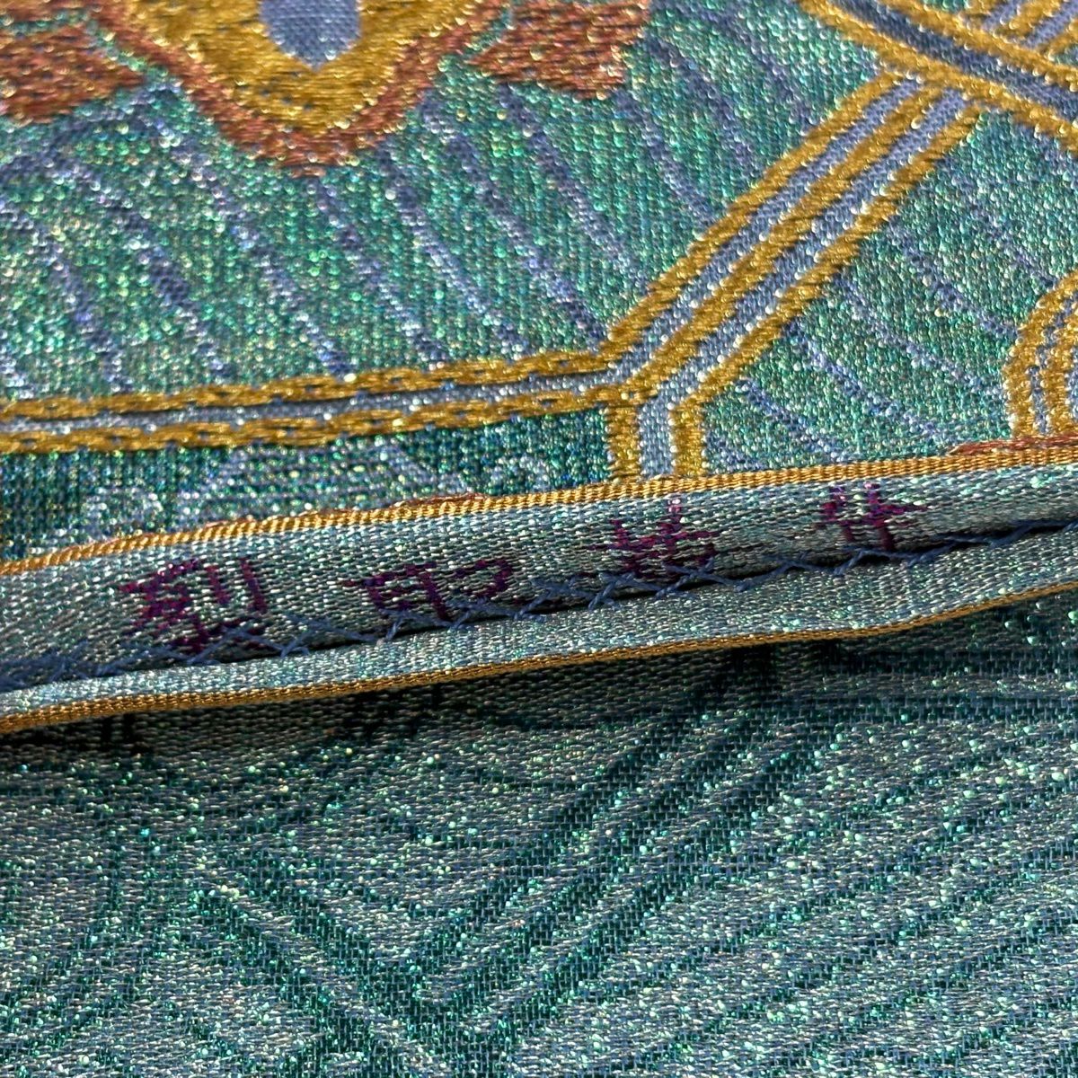 袋帯 逸品 河村織物 落款あり 上代彩華文 金糸 箔 深緑 六通 正絹