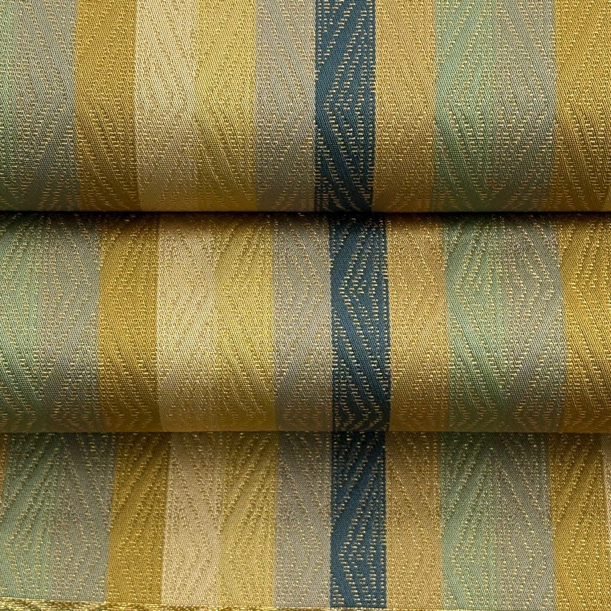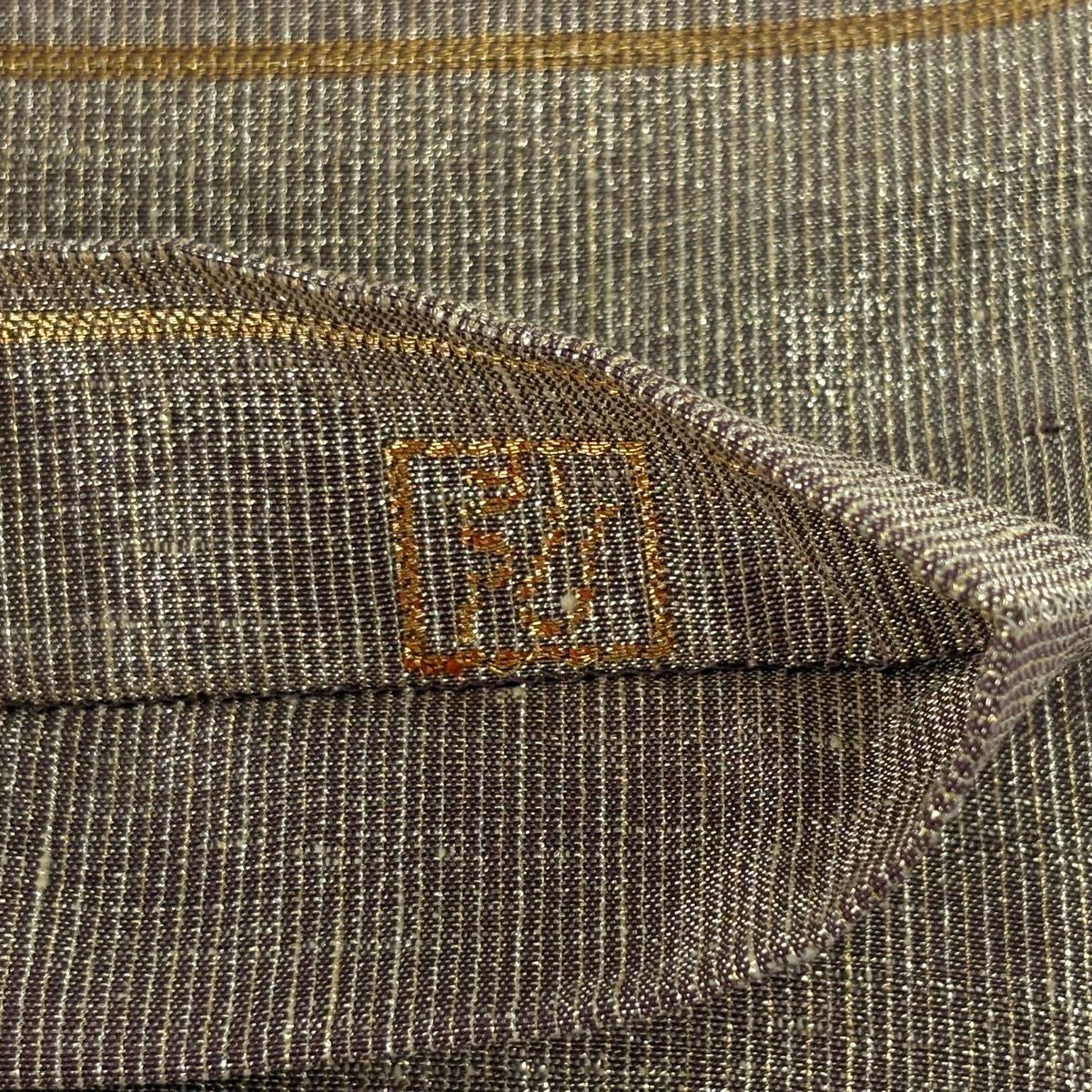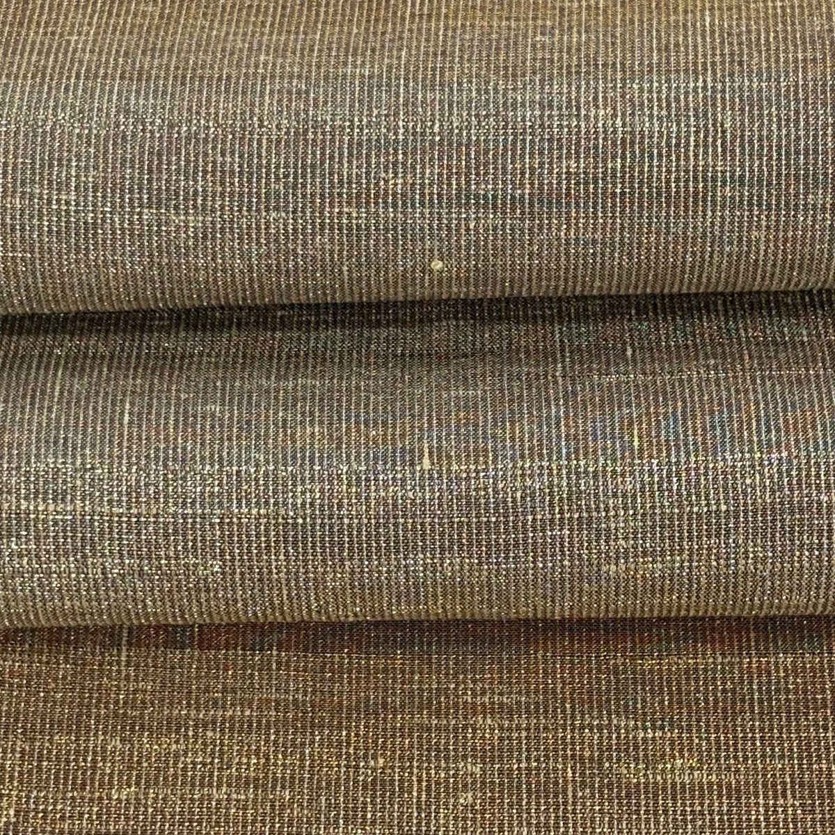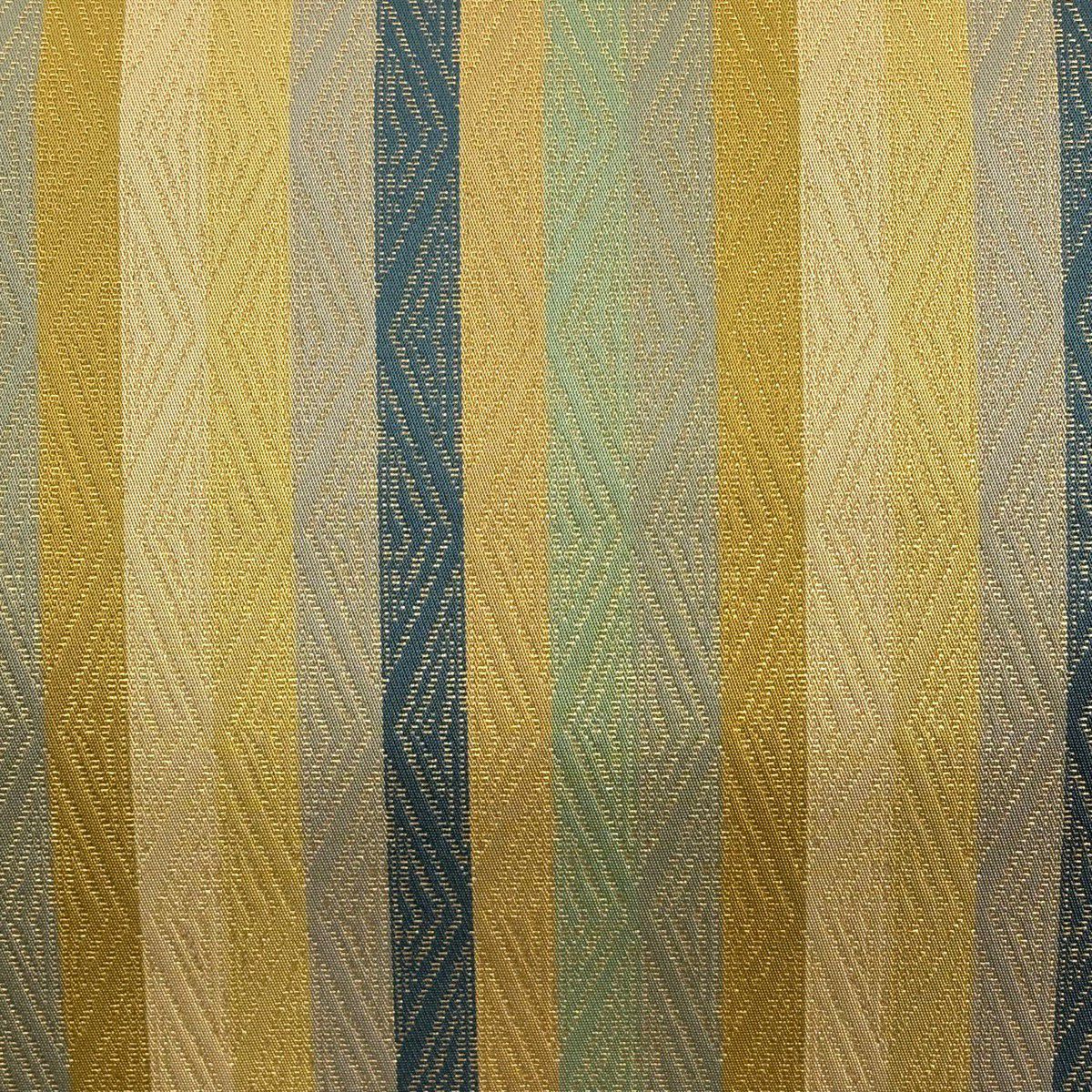 【美品】 袋帯 逸品 龍村晋 落款あり 縞 菱 箔 茶緑色 全通 正絹