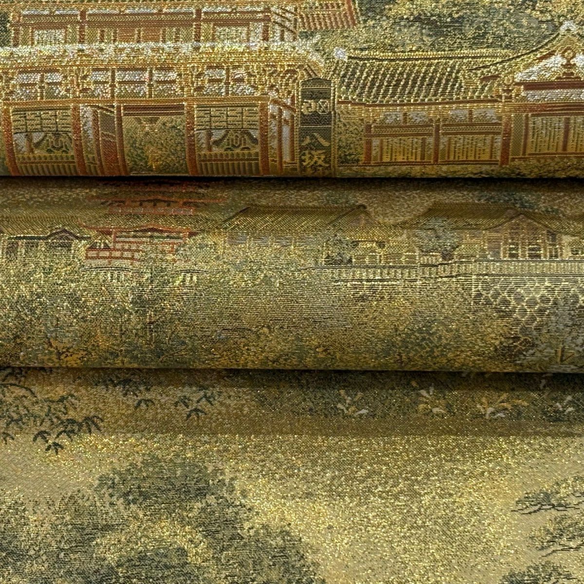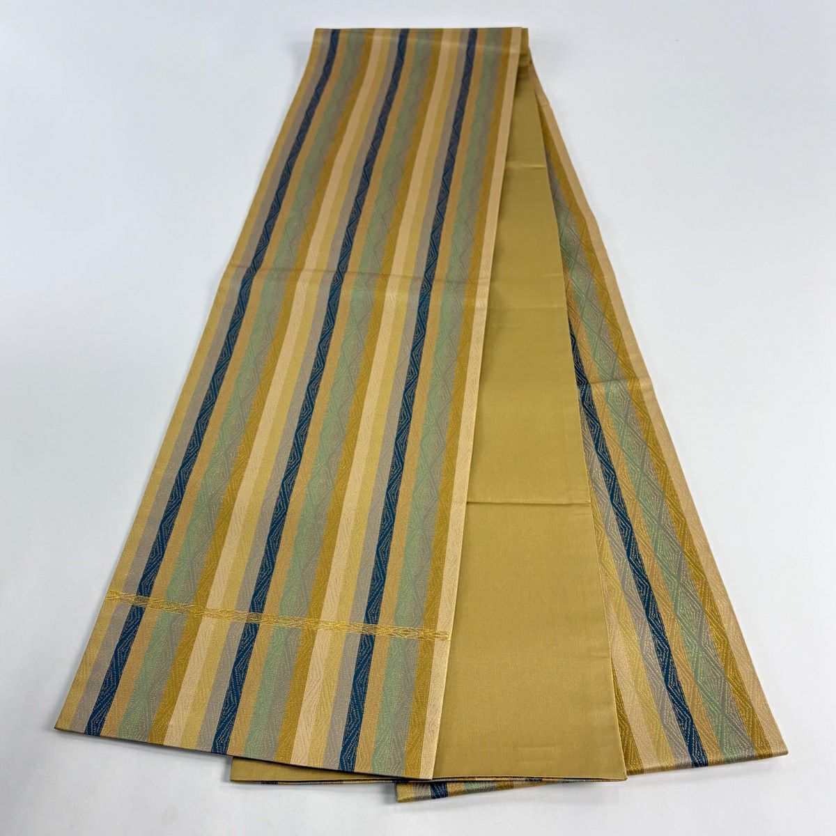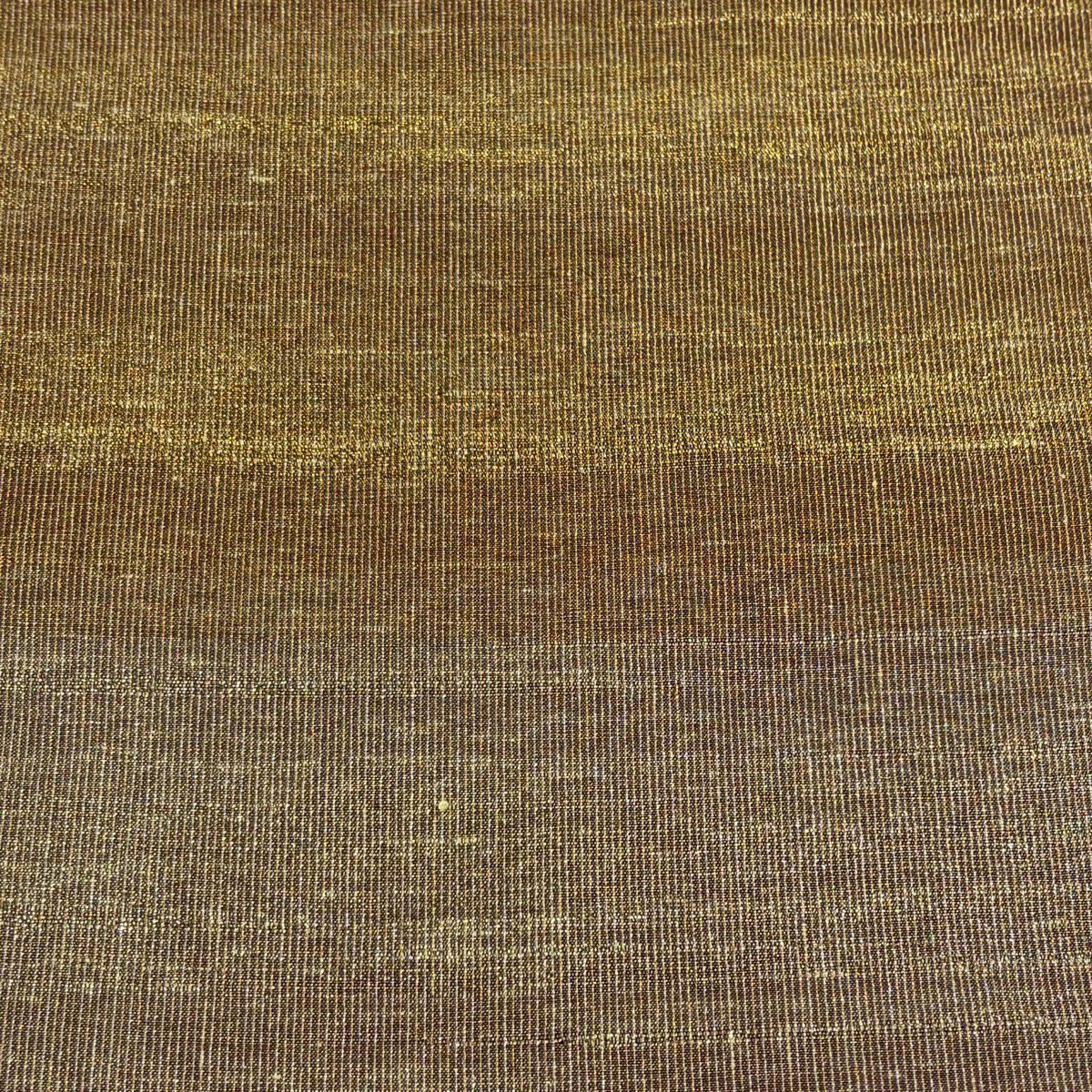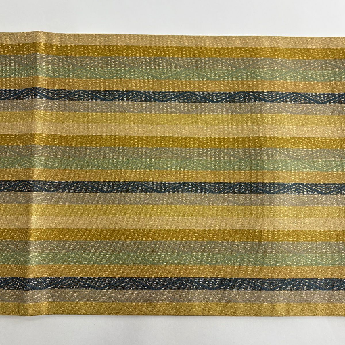 【美品】 袋帯 逸品 龍村晋 落款あり 縞 菱 箔 茶緑色 全通 正絹
