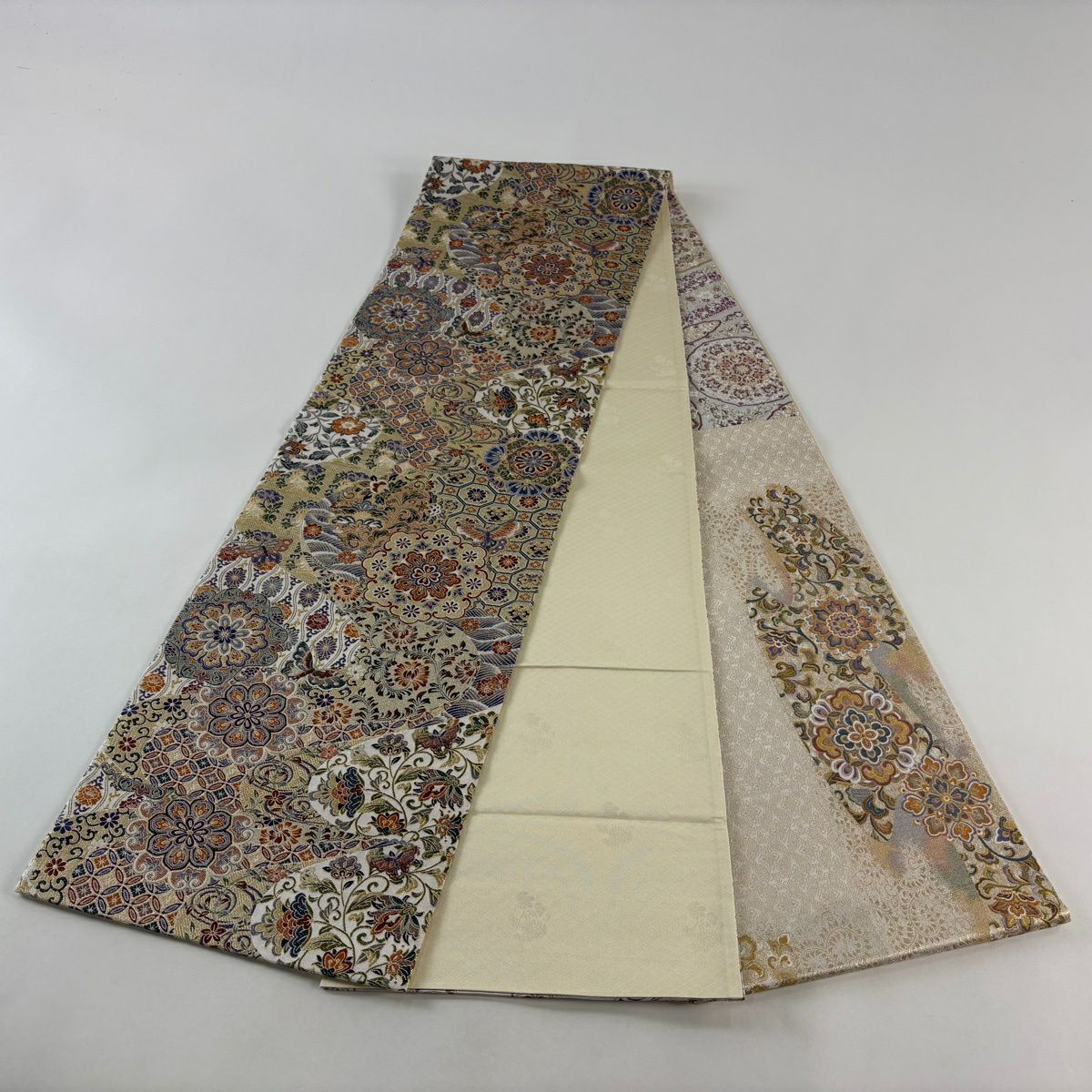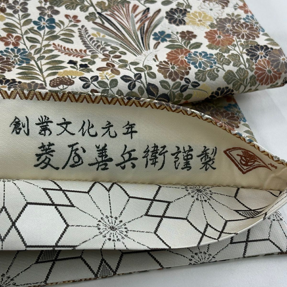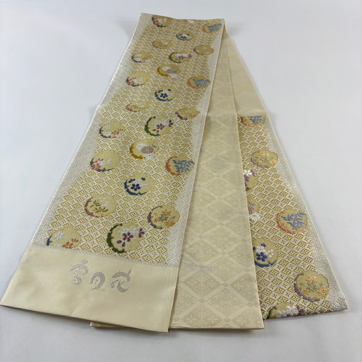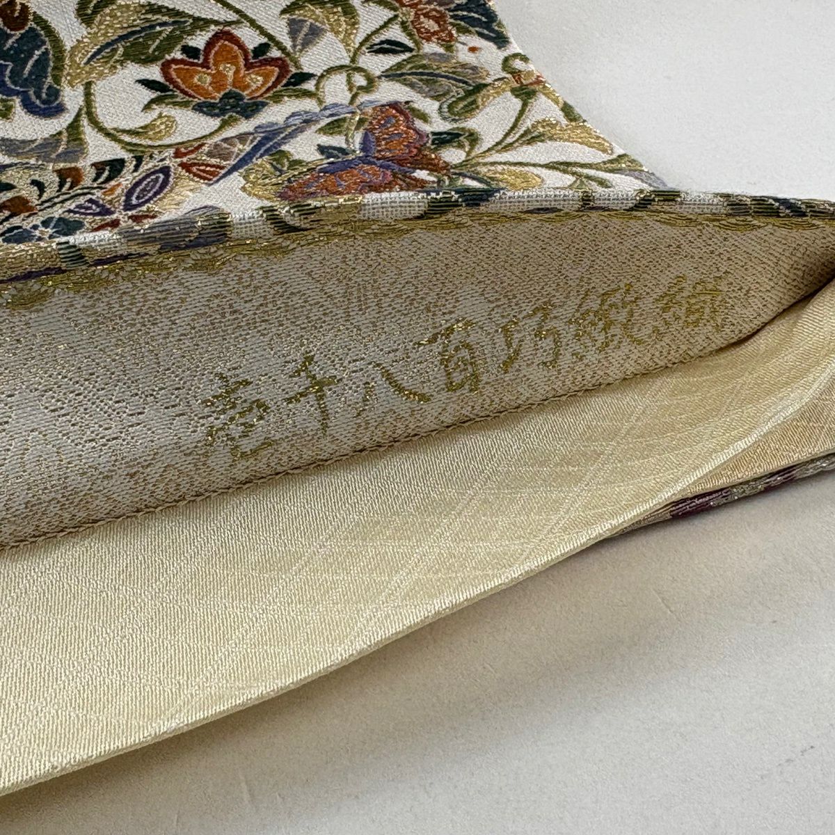 袋帯 逸品 落款あり 牛首紬 華文 花唐草 銀彩 クリーム 全通 正絹