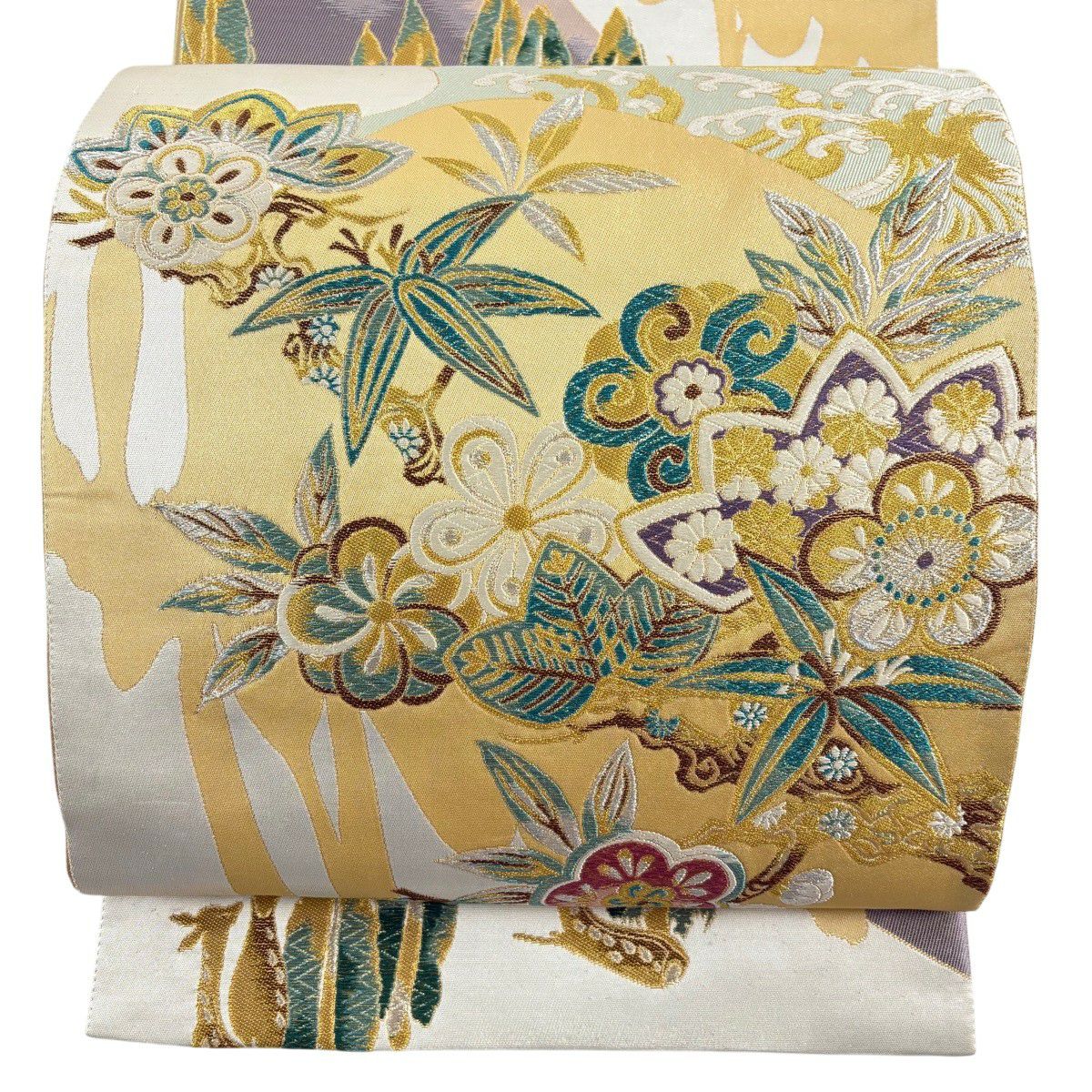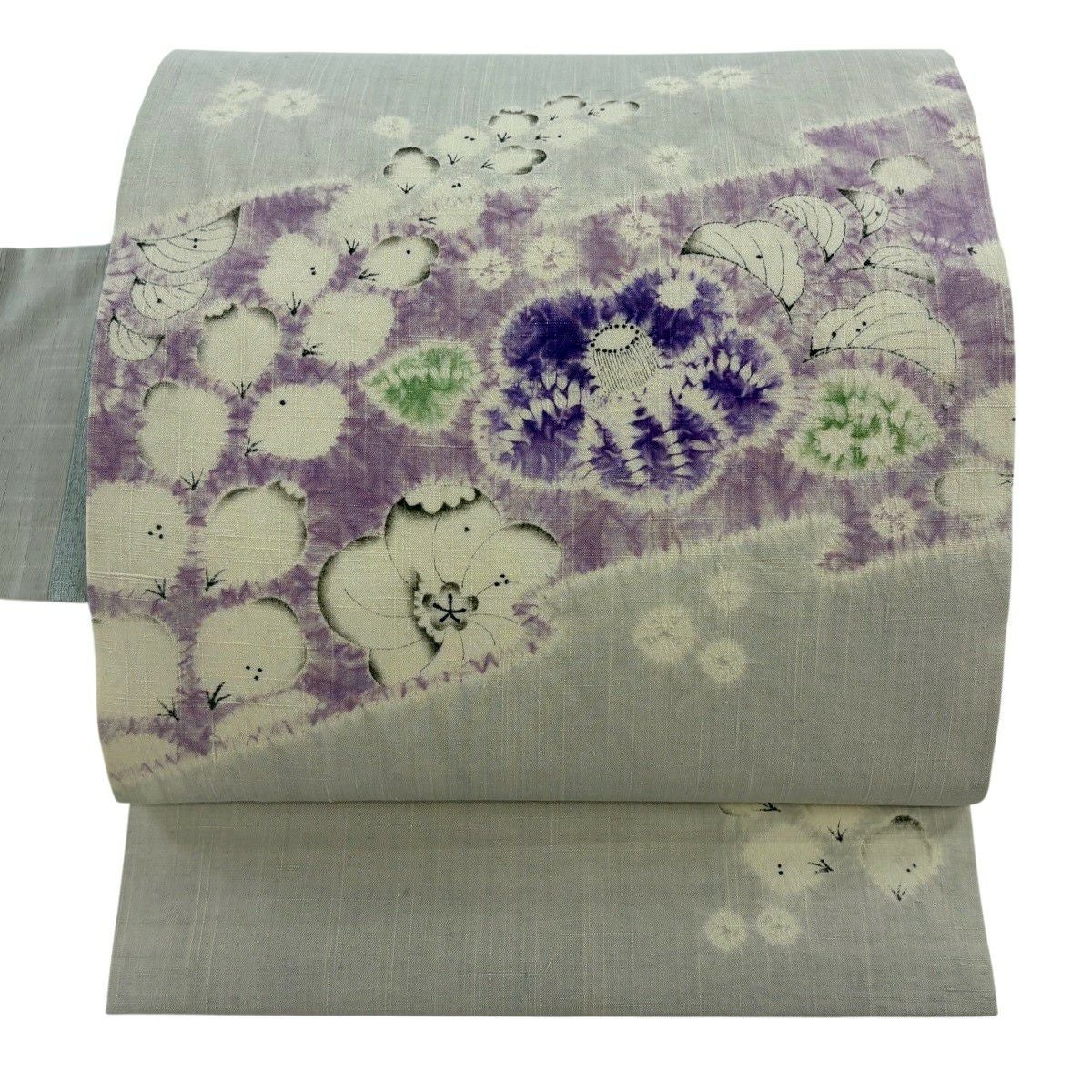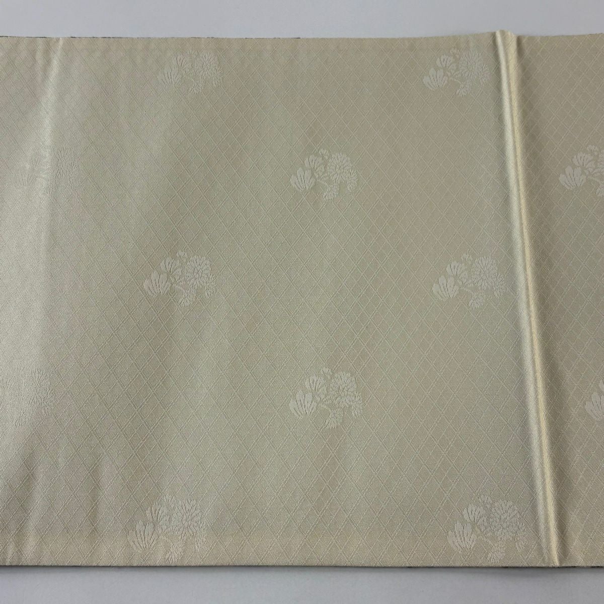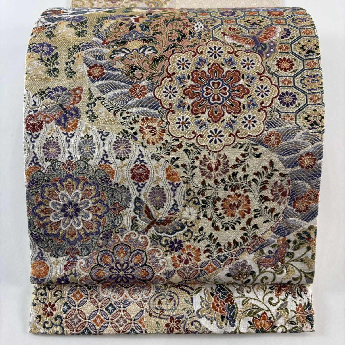 袋帯 逸品 落款あり 牛首紬 華文 花唐草 銀彩 クリーム 全通 正絹