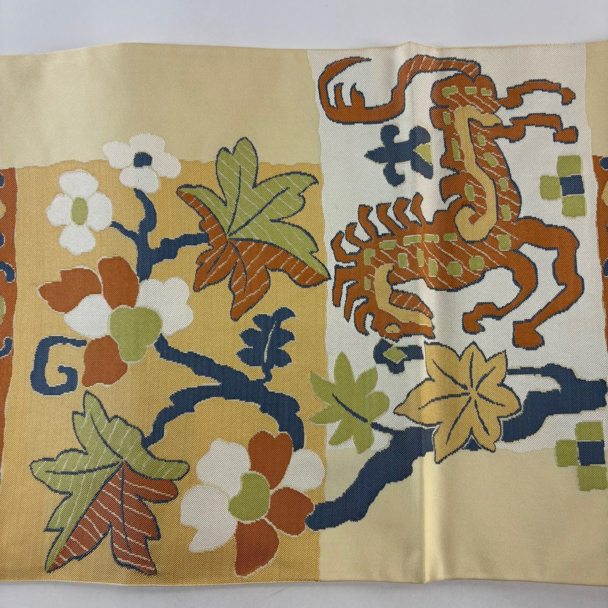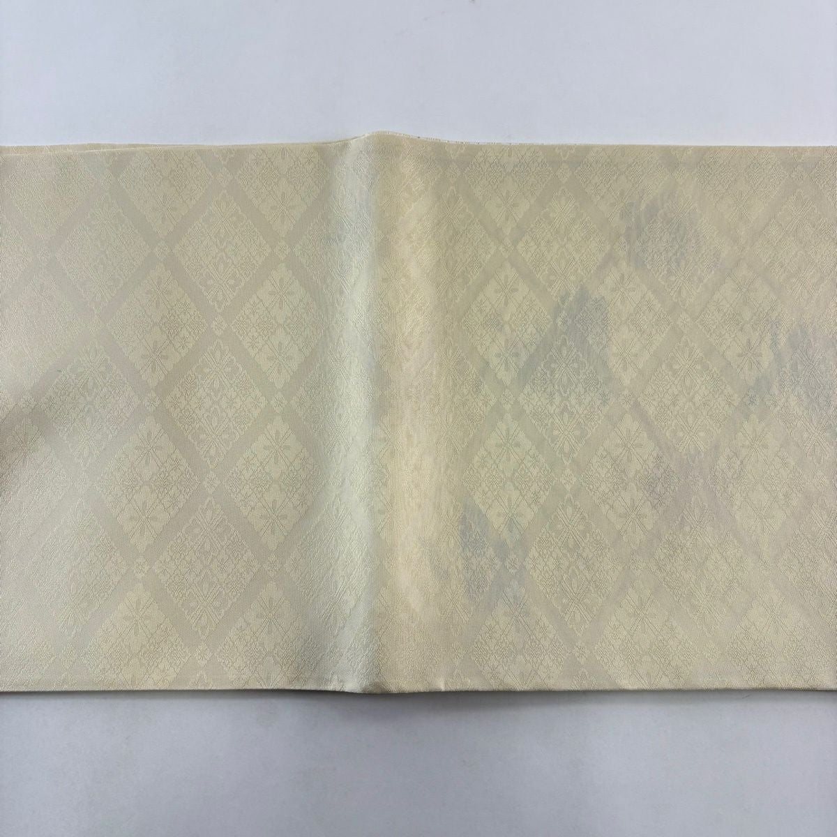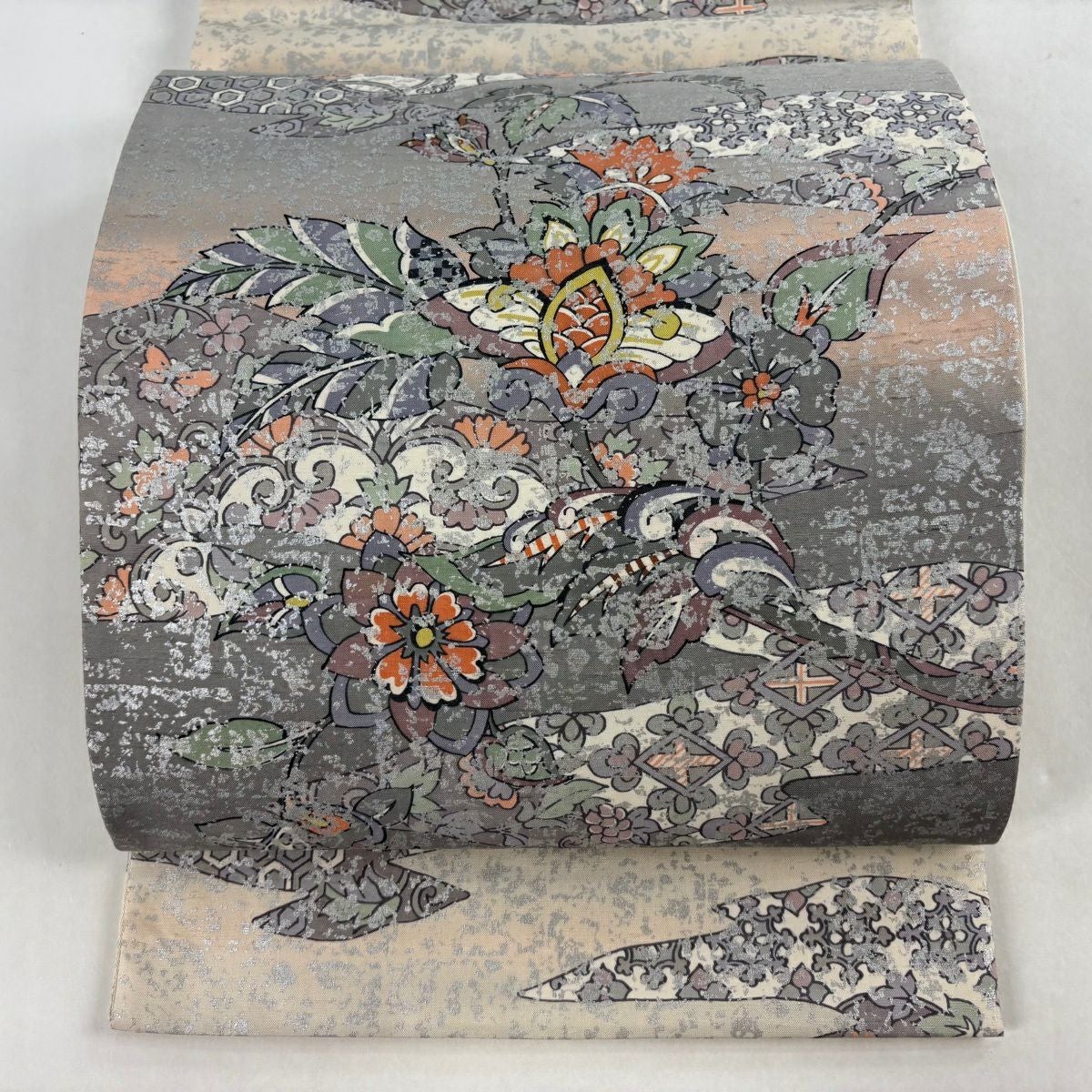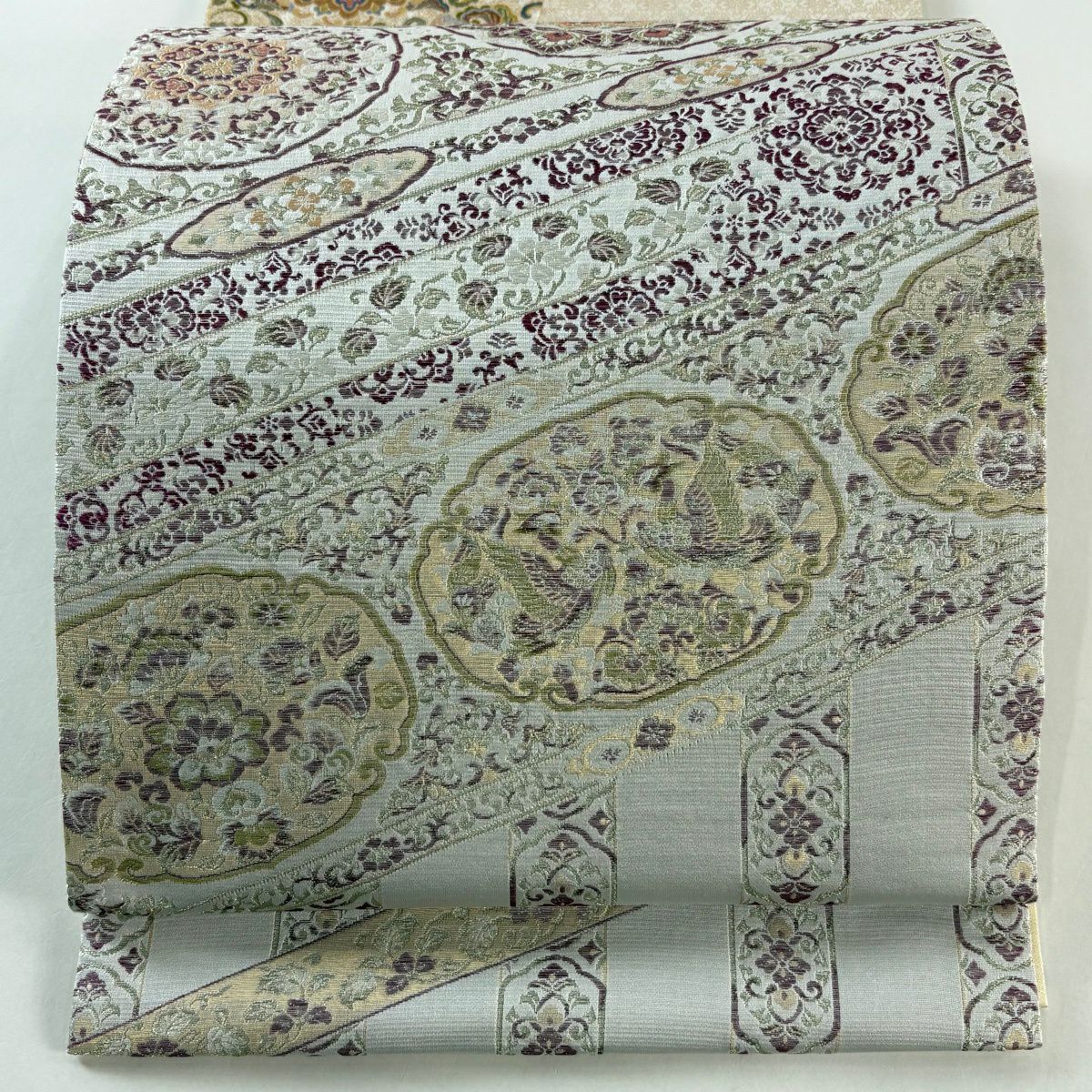 袋帯 逸品 落款あり 牛首紬 華文 花唐草 銀彩 クリーム 全通 正絹