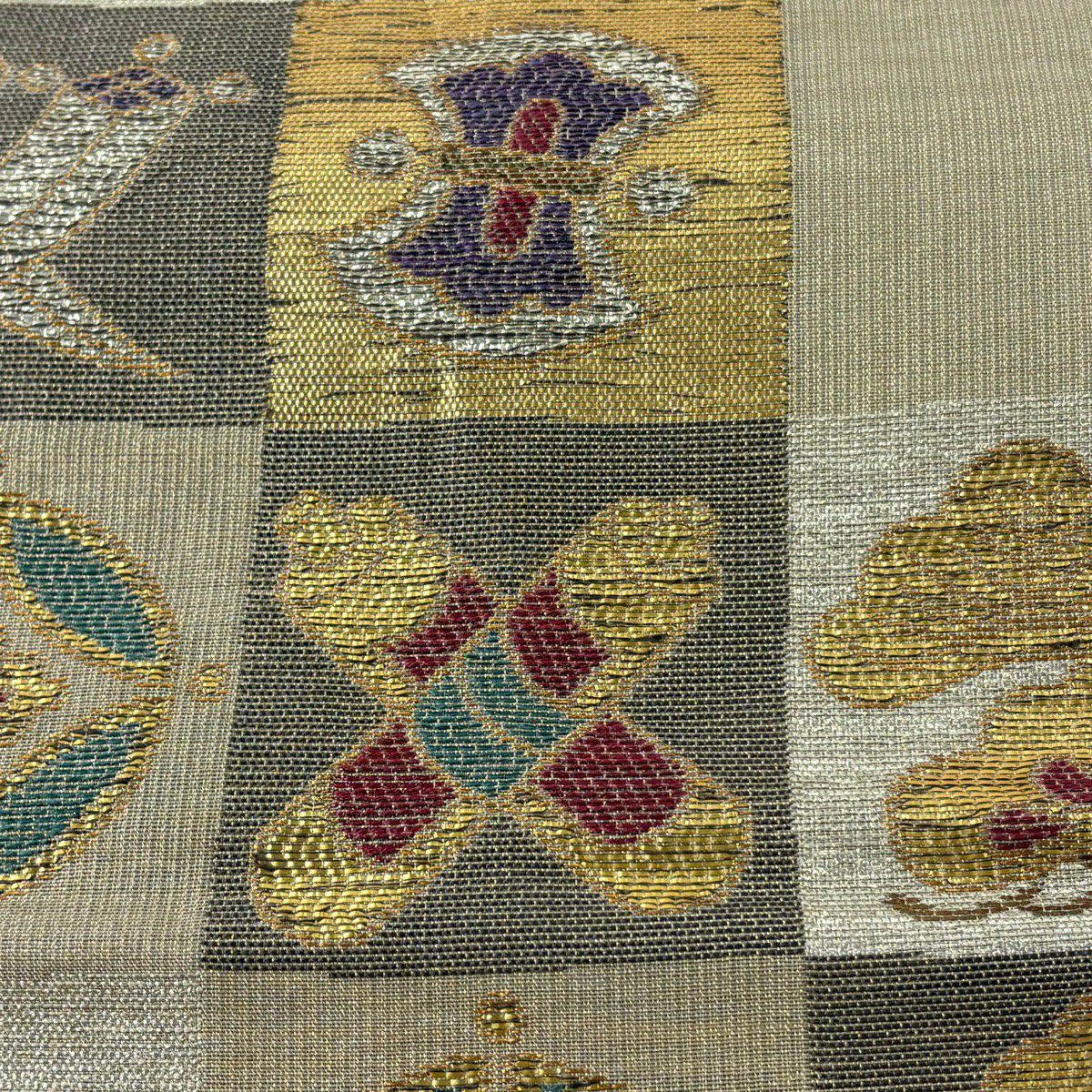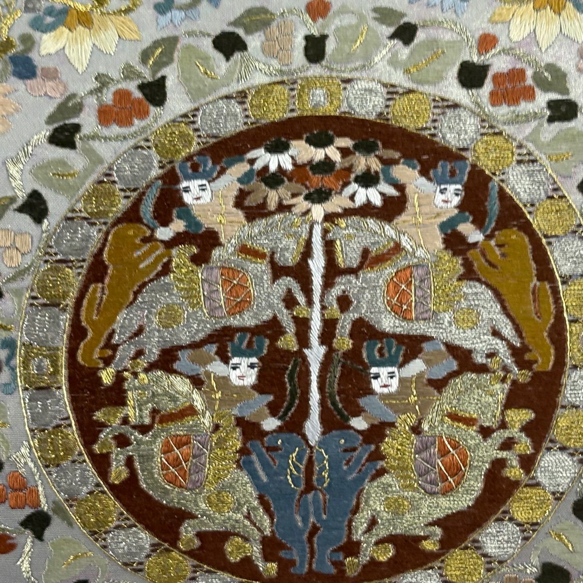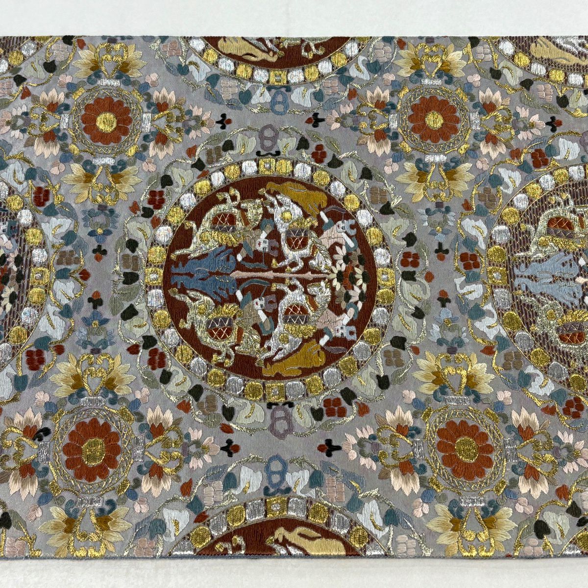 【美品】 袋帯 逸品 連珠狩猟文 草花 刺繍 金銀糸 灰茶 六通 正絹