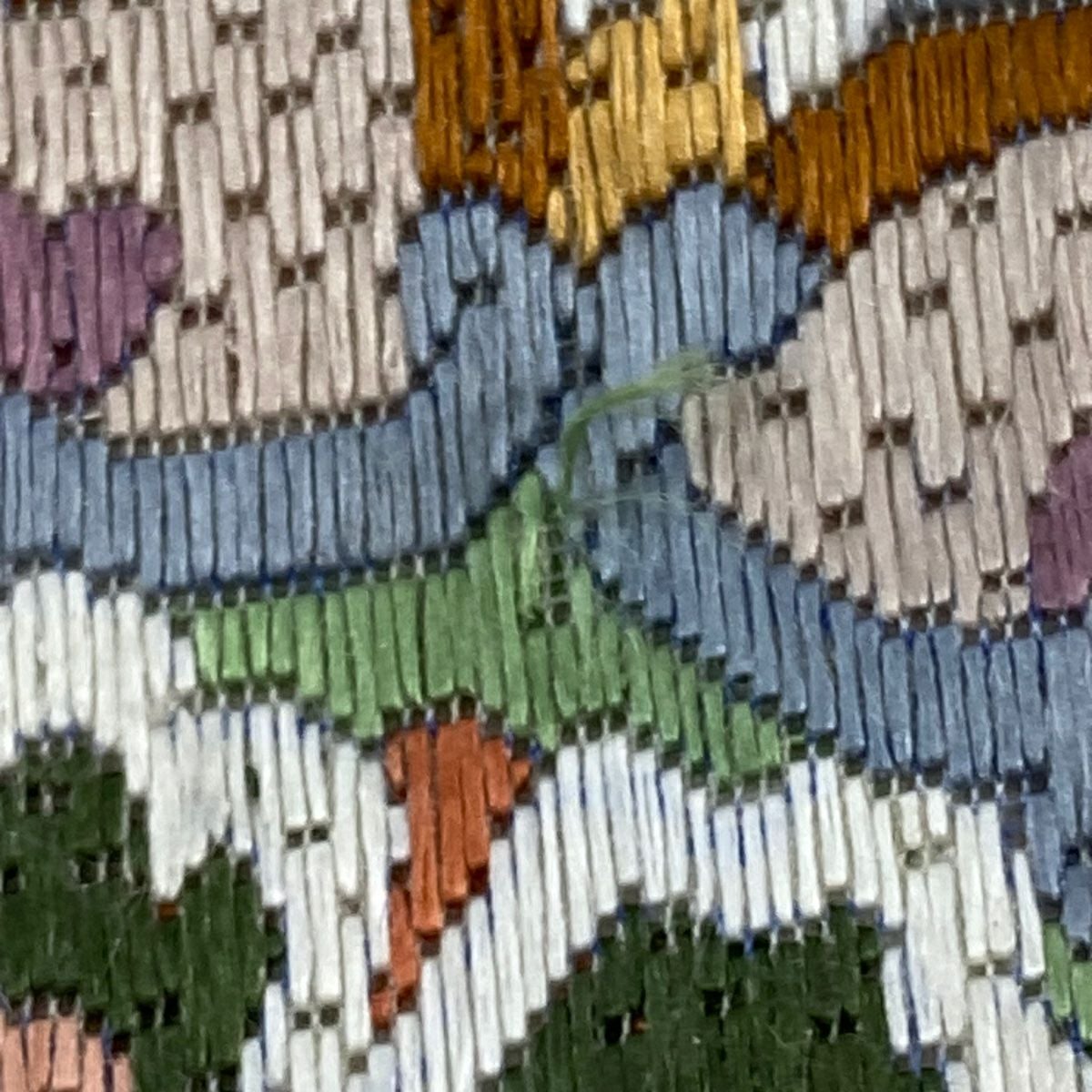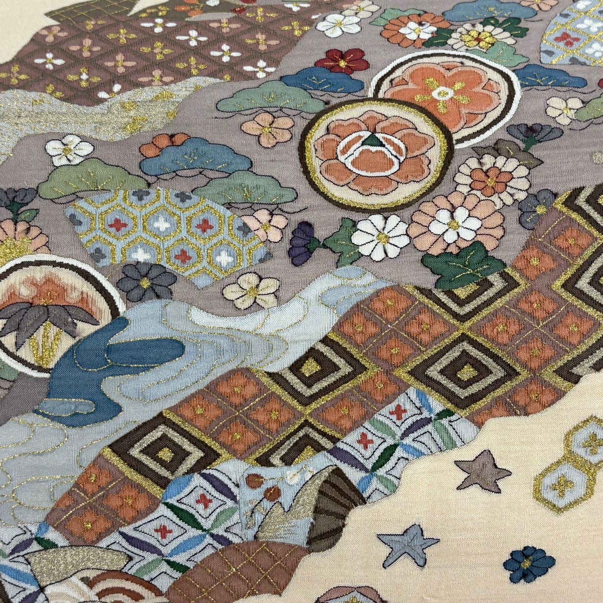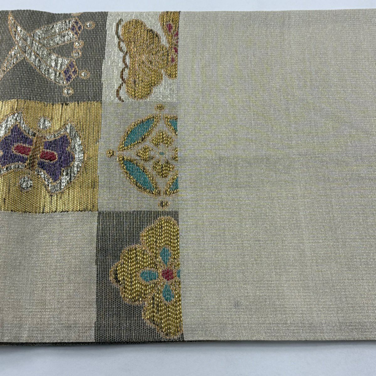 【美品】 袋帯 逸品 連珠狩猟文 草花 刺繍 金銀糸 灰茶 六通 正絹