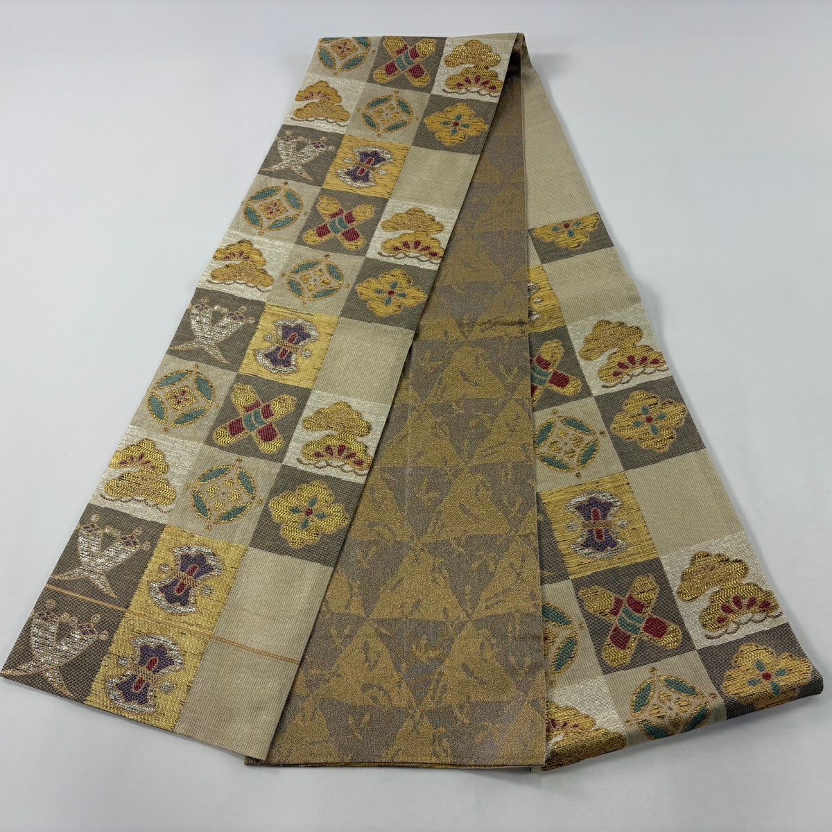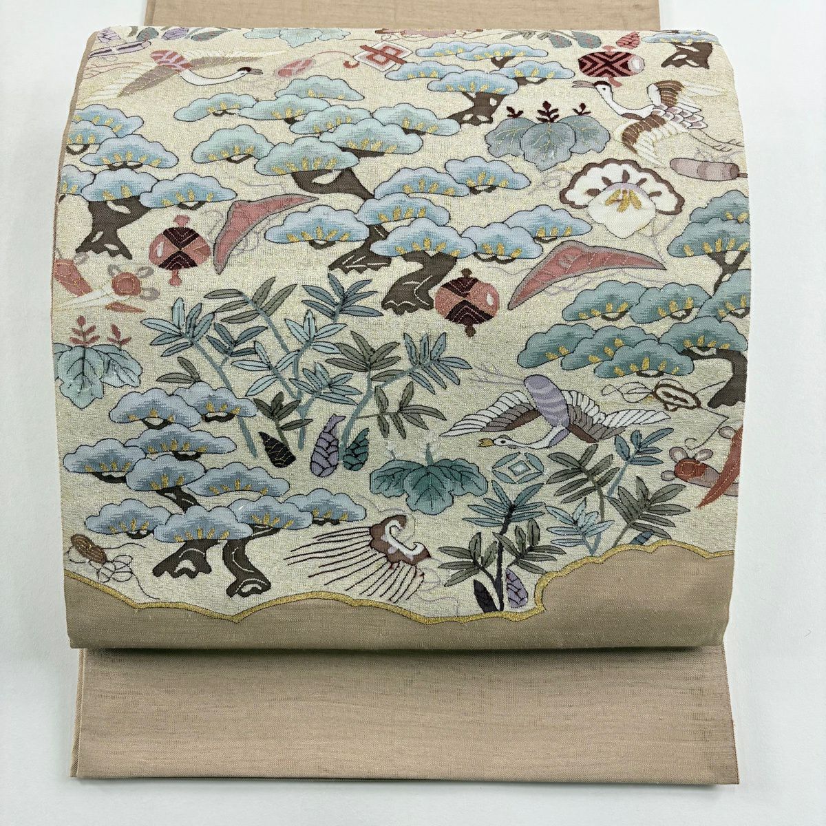 【美品】 袋帯 逸品 鳥 宝尽くし 金通し 金糸 薄茶色 お太鼓柄 正絹