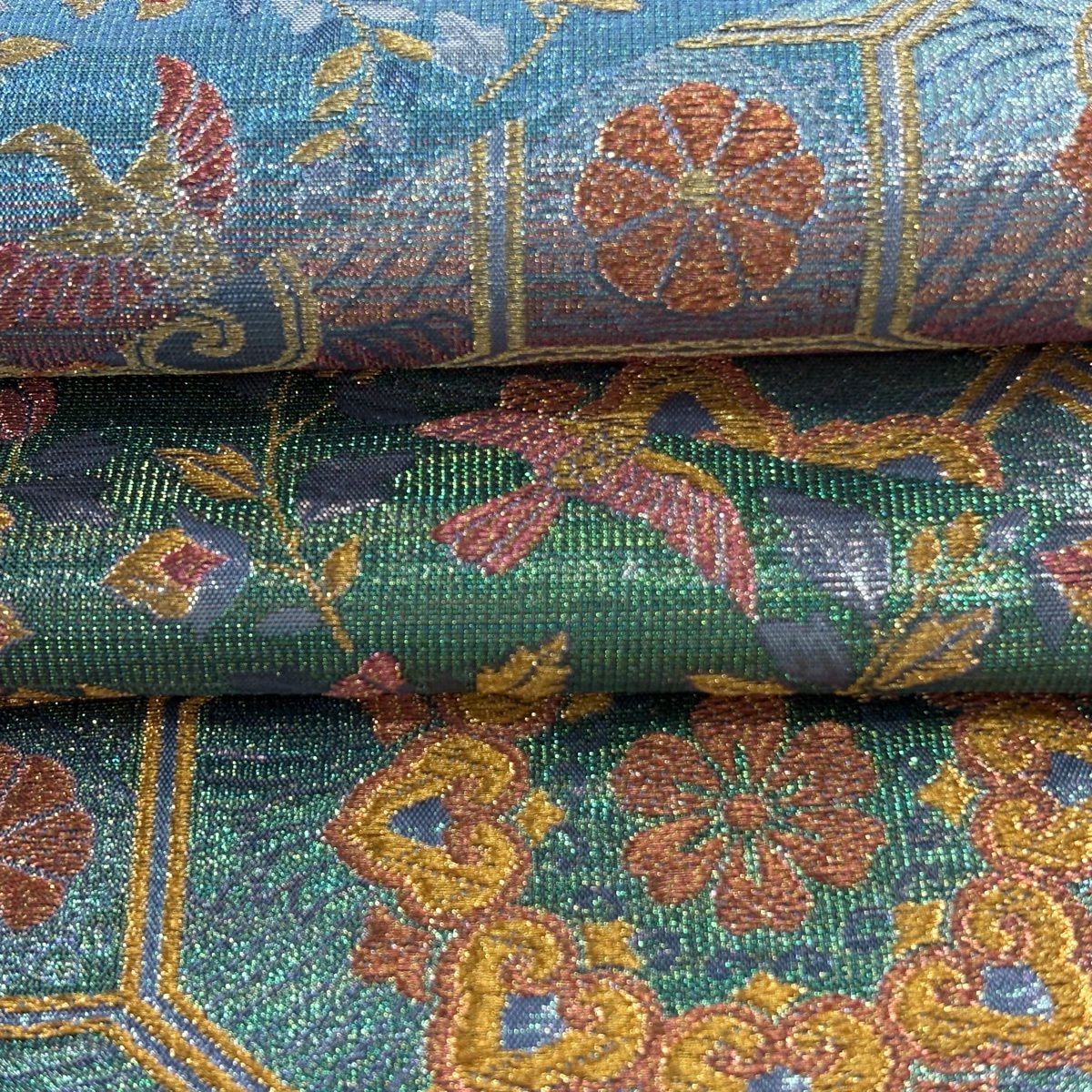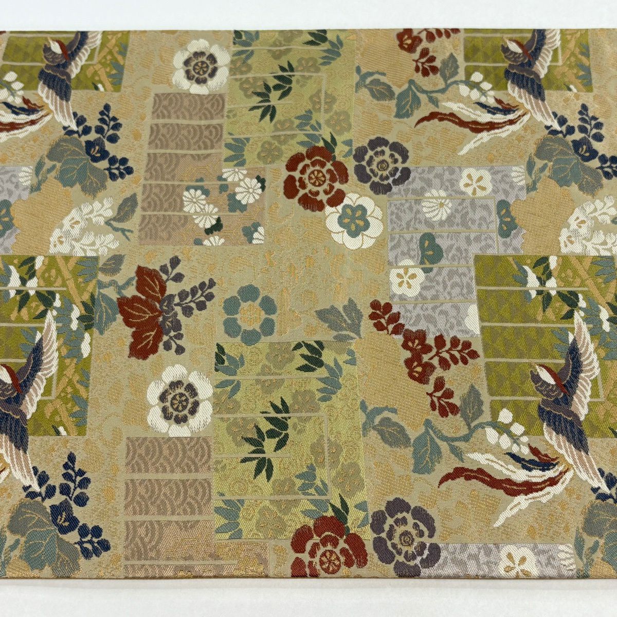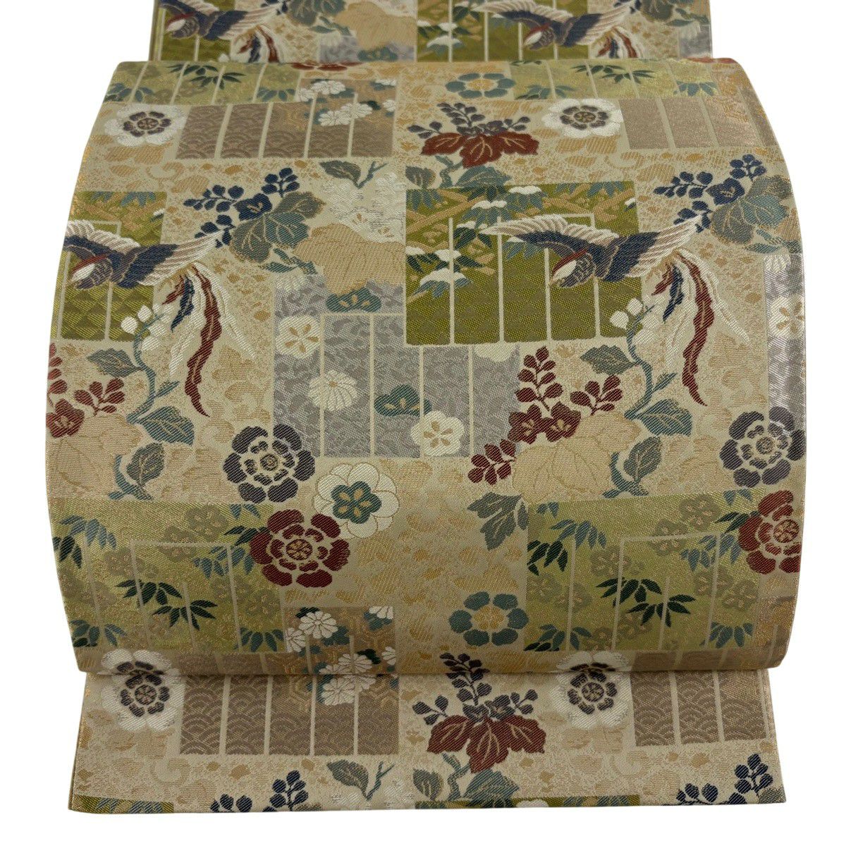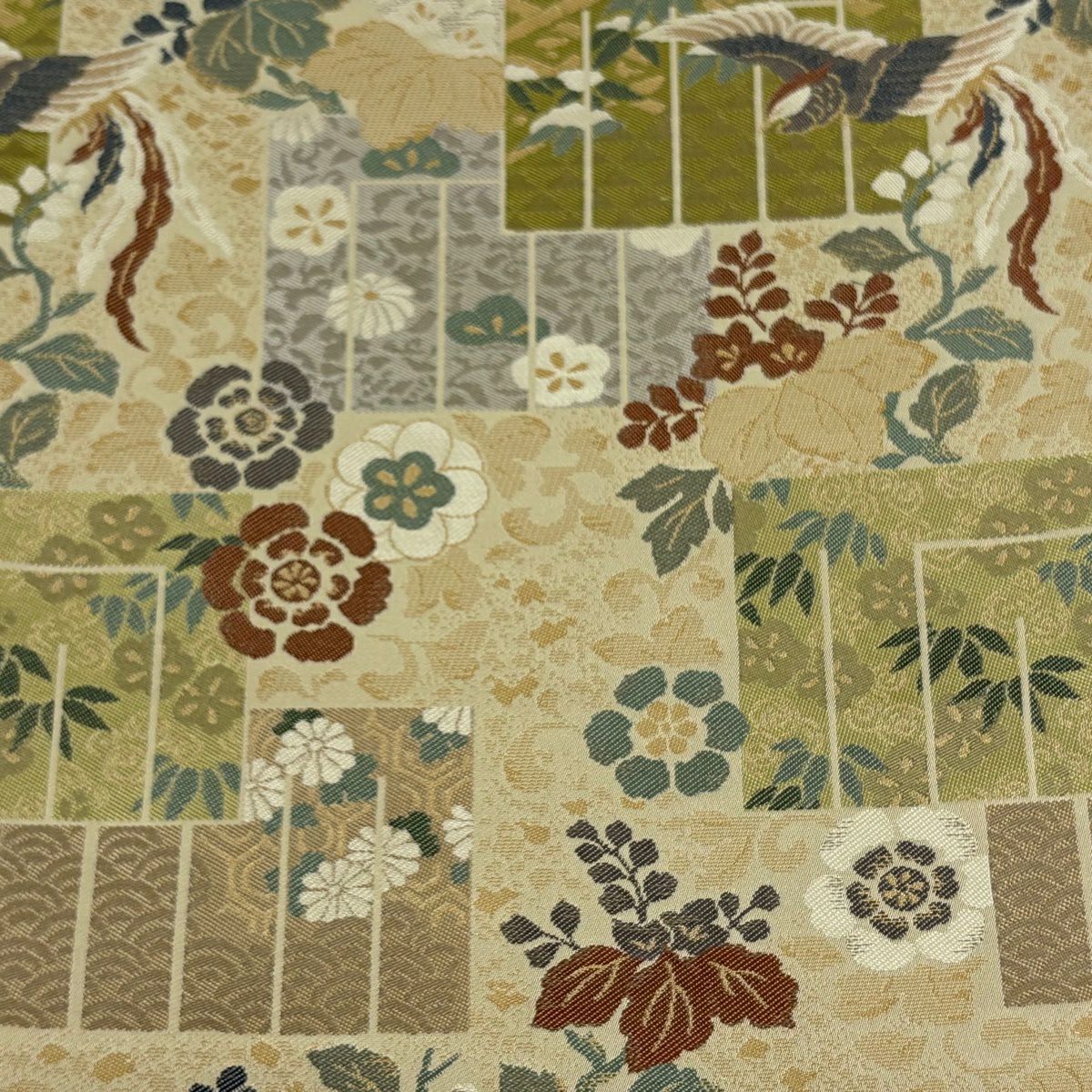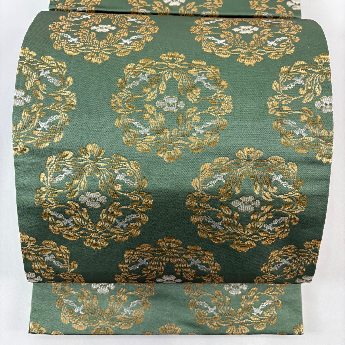 【美品】 袋帯 逸品 龍村晋 落款あり 草花 鳥 箔 薄緑 全通 正絹