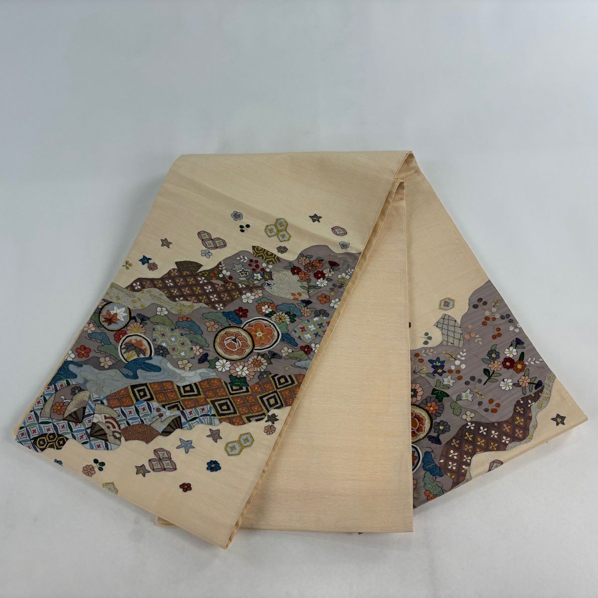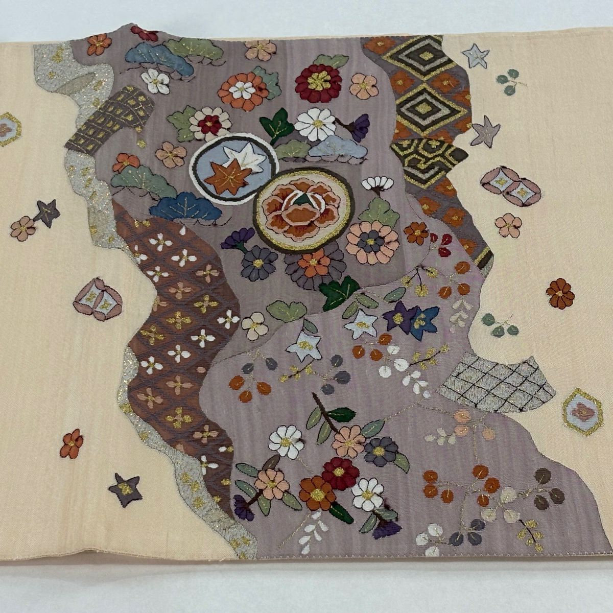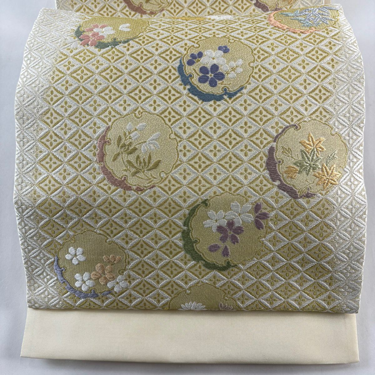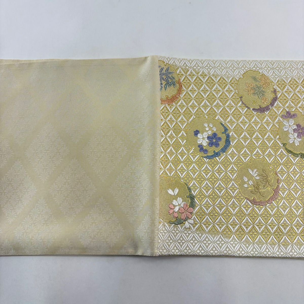 袋帯 逸品 証紙あり 雪月花 雪輪 梅 金糸 刺繍 クリーム 六通 正絹