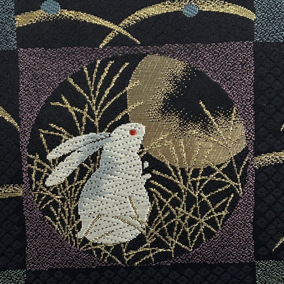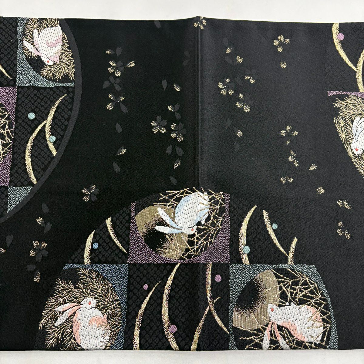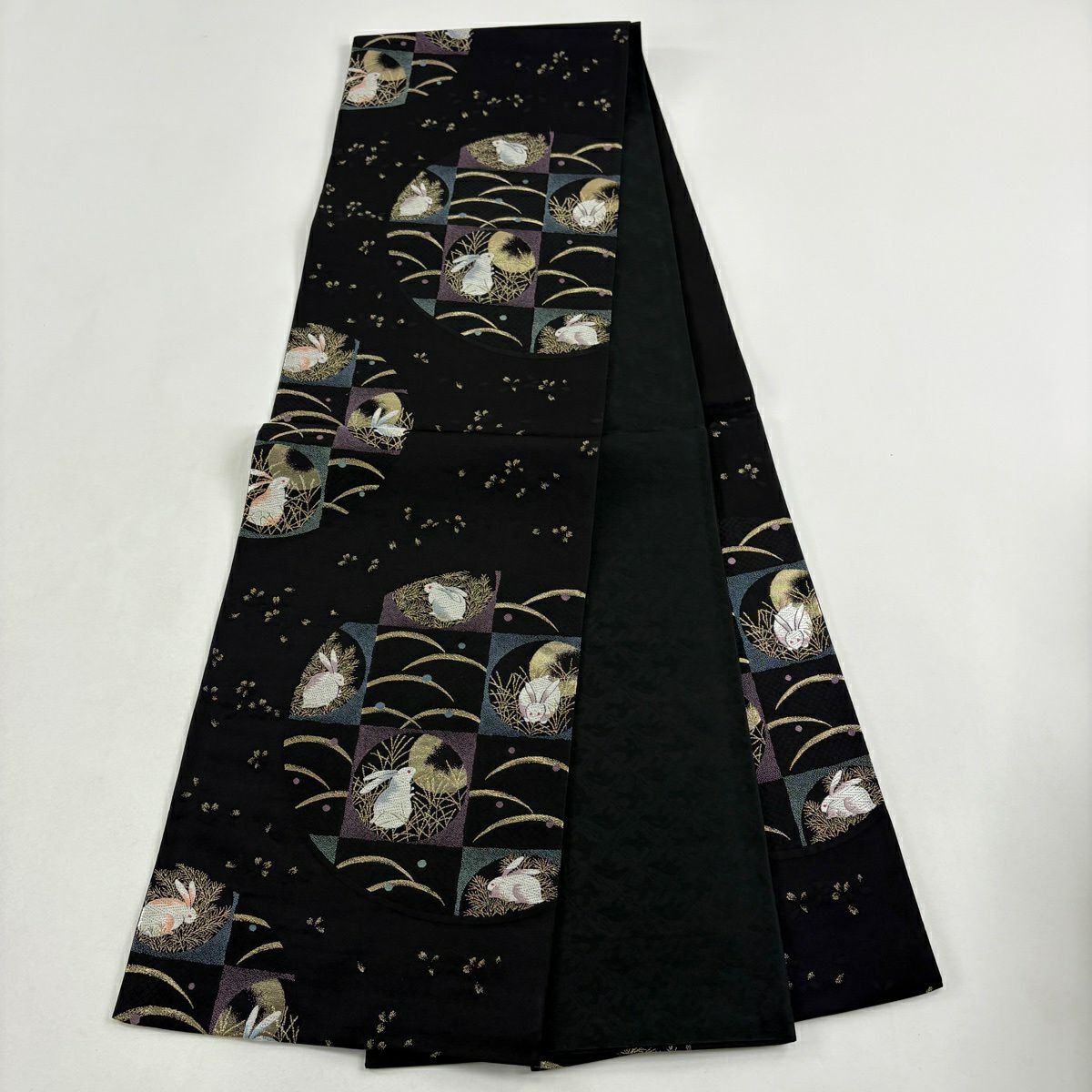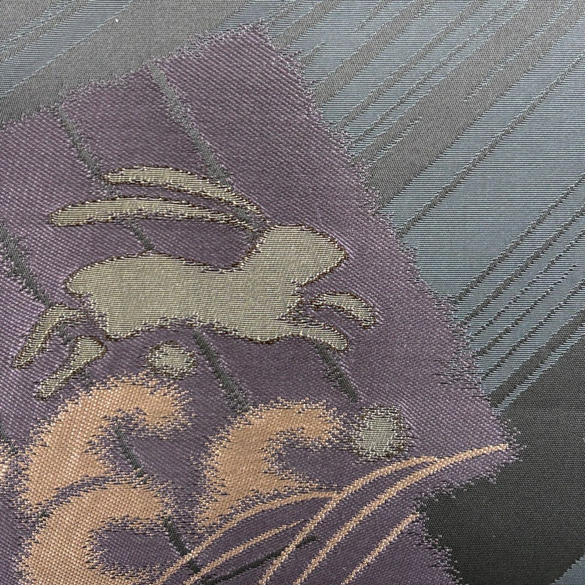 【美品】 袋帯 逸品 萬葉染 うさぎ 露芝 金糸 刺繍 黒 六通 正絹