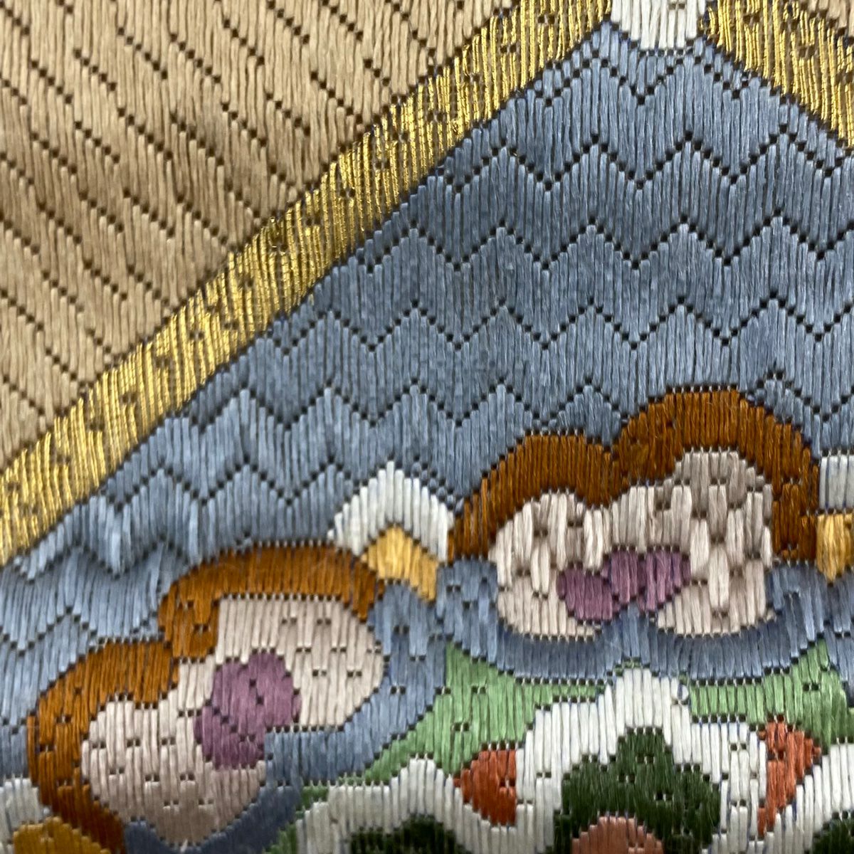 袋帯 逸品 渡文 落款あり 波 霞 箔 金彩 クリーム お太鼓柄 正絹