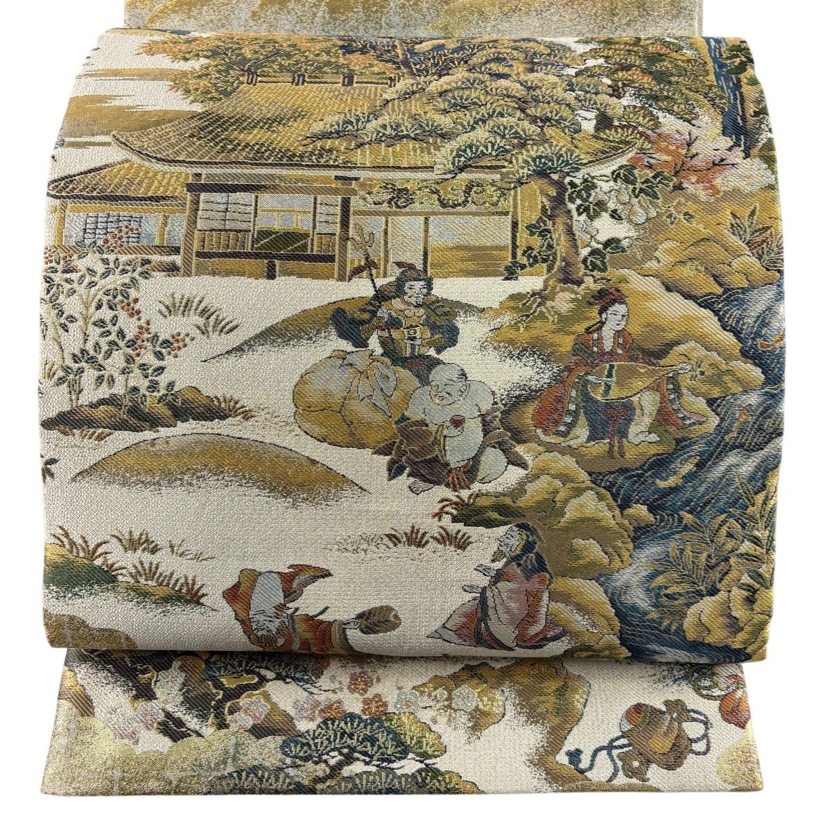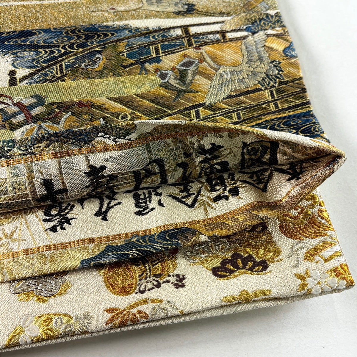 丸帯 逸品 桃山扇面鳳凰文 花鳥 御所車 金糸 箔 金色 お太鼓柄 正絹