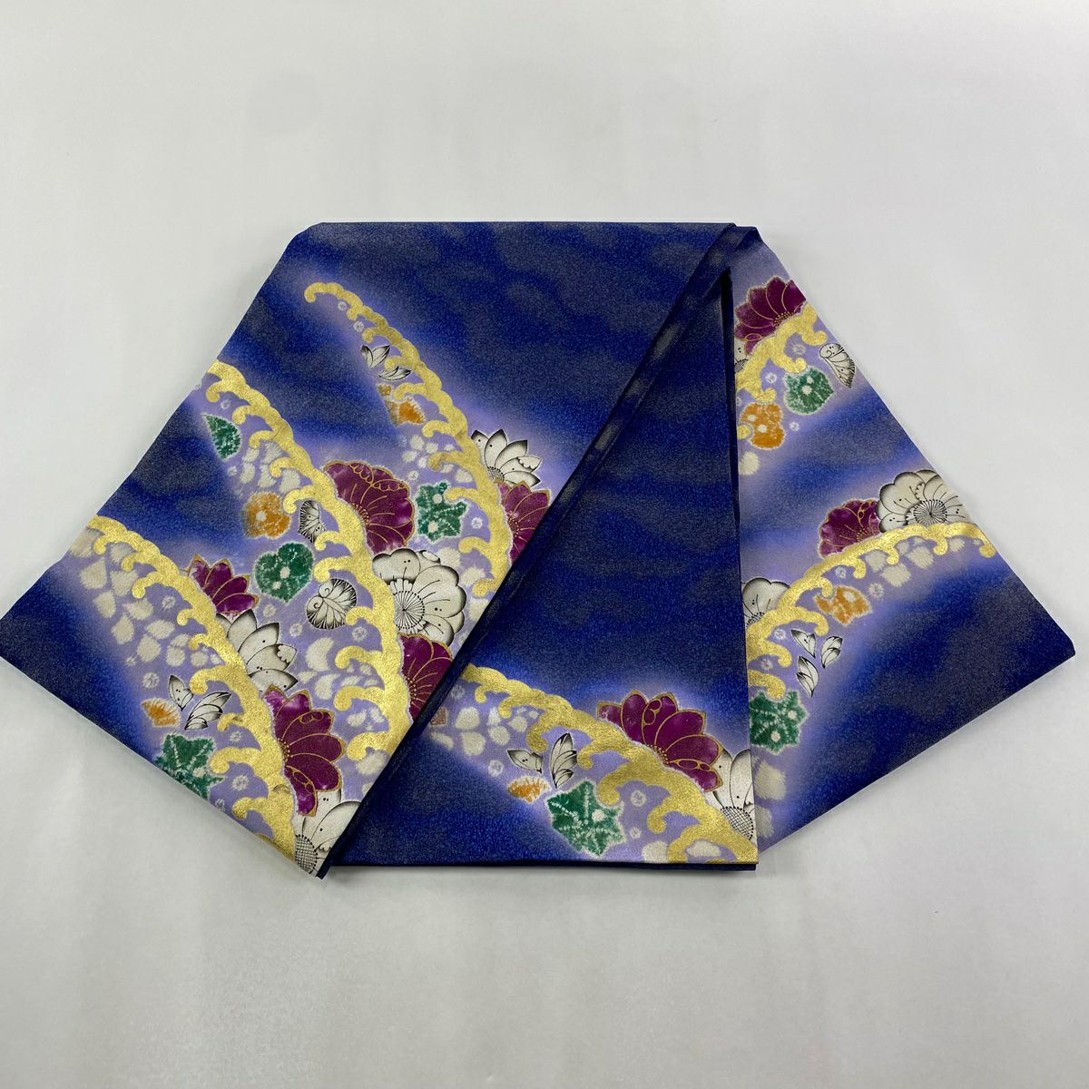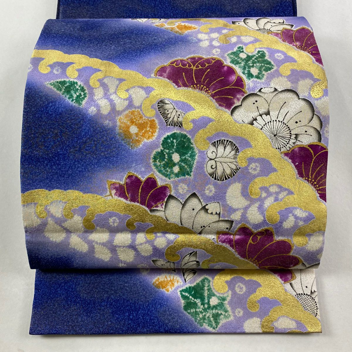 【在庫一掃】 袋帯 逸品 辻が花 波 金通し 金彩 青紫 お太鼓柄 正絹