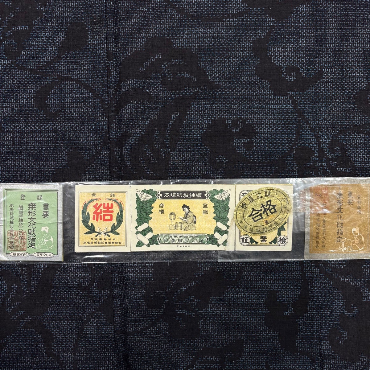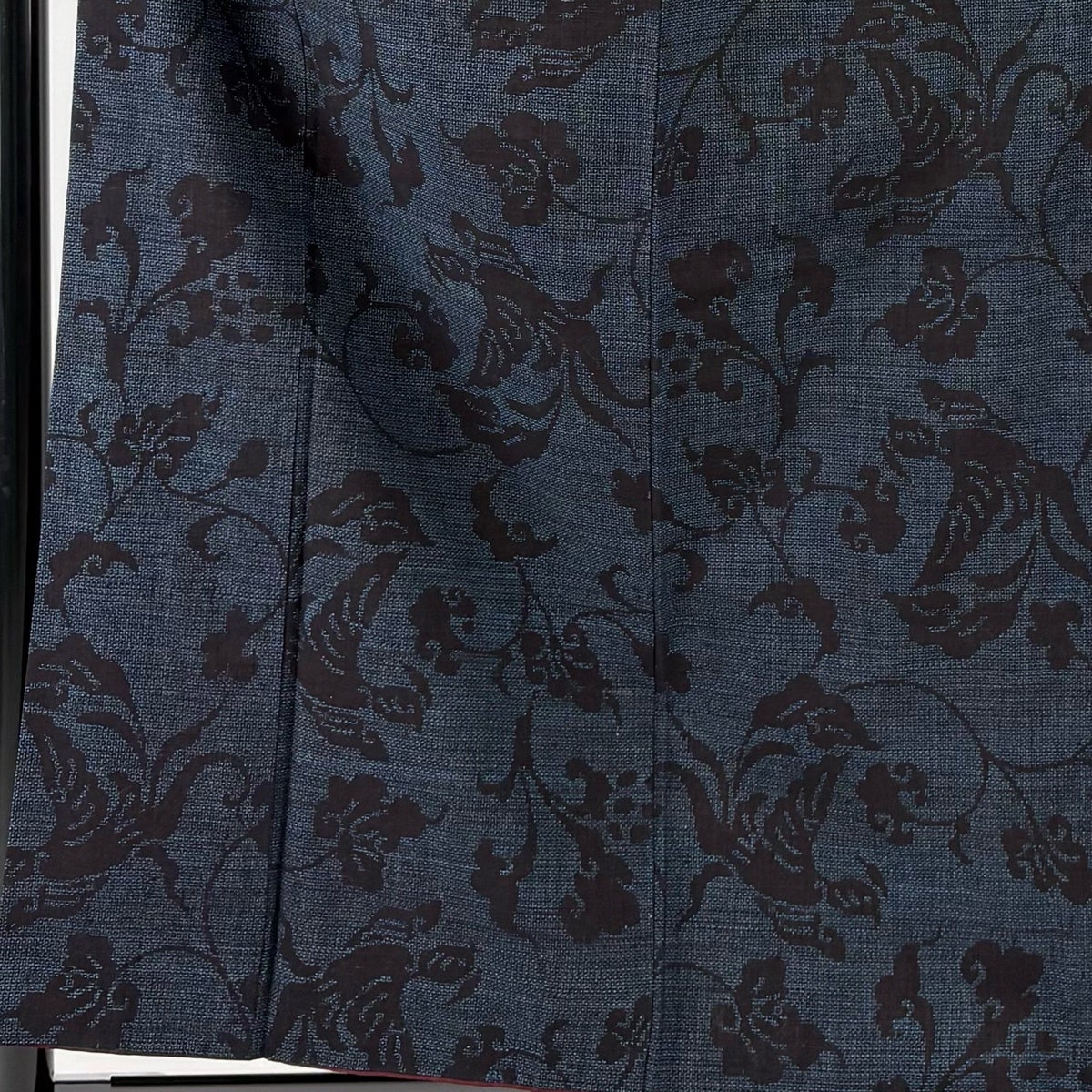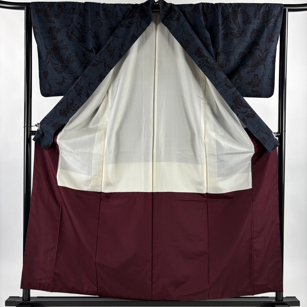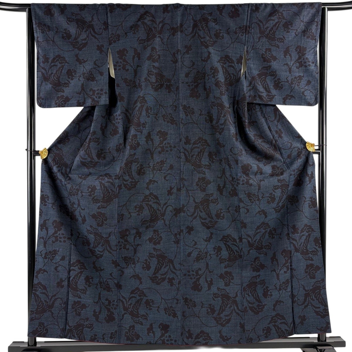 紬 身丈158cm 裄丈64cm M 袷 花唐草 亀甲絣 紺色 正絹 逸品