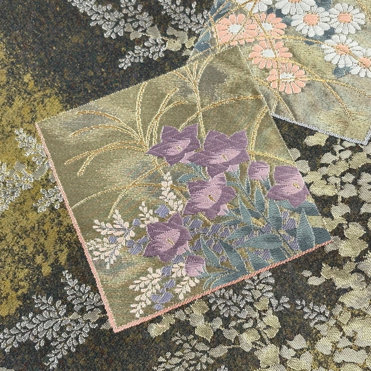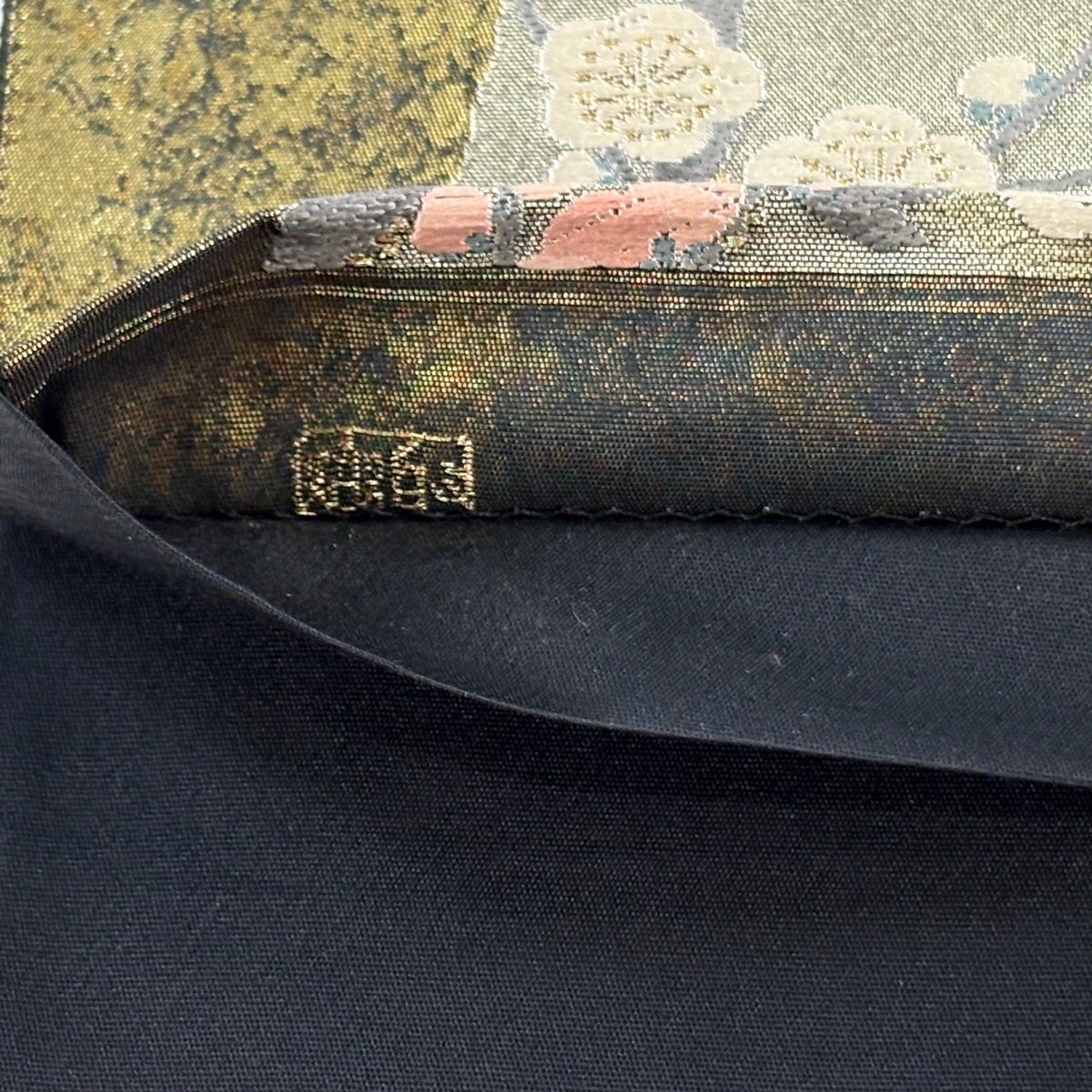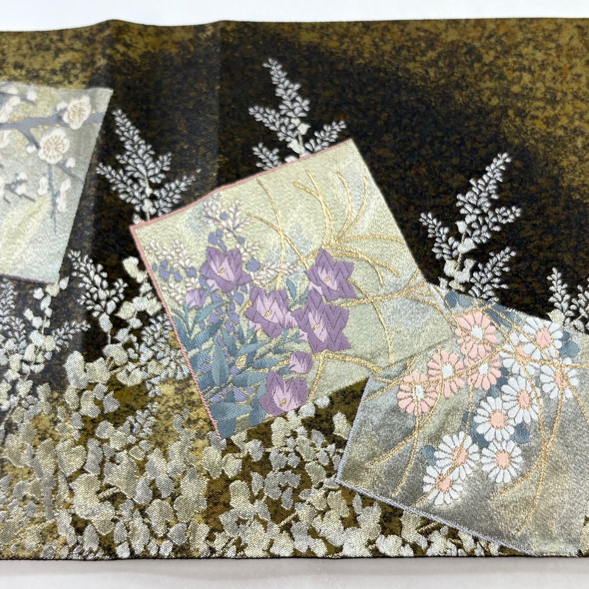 袋帯 逸品 じゅらく 落款あり 色紙 草花 唐織 金銀糸 金色 六通 正絹