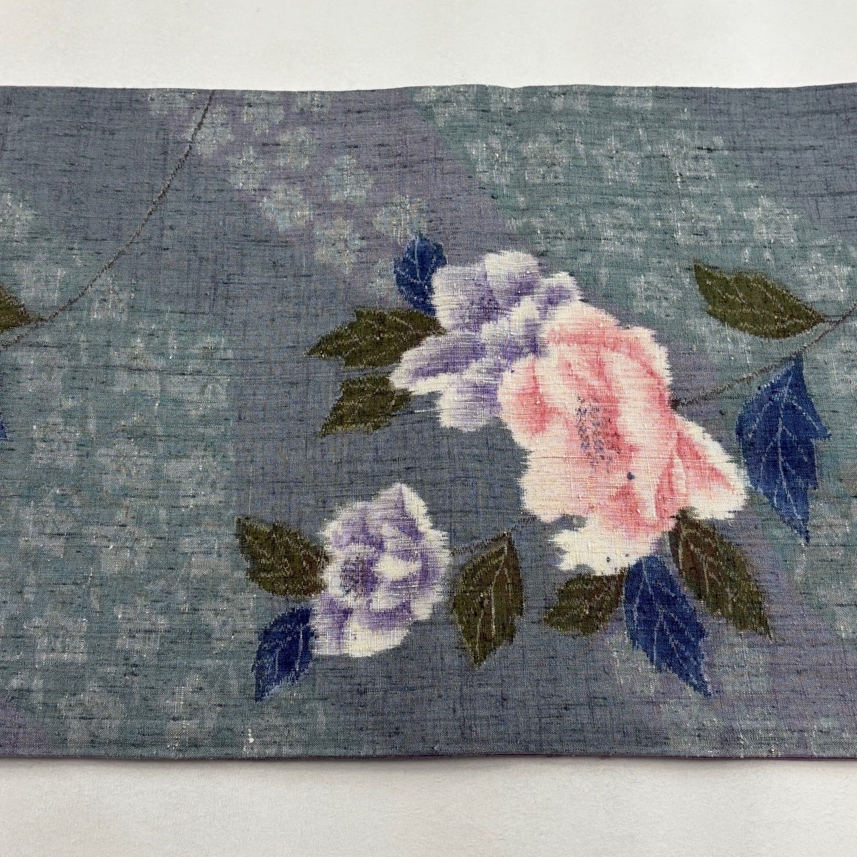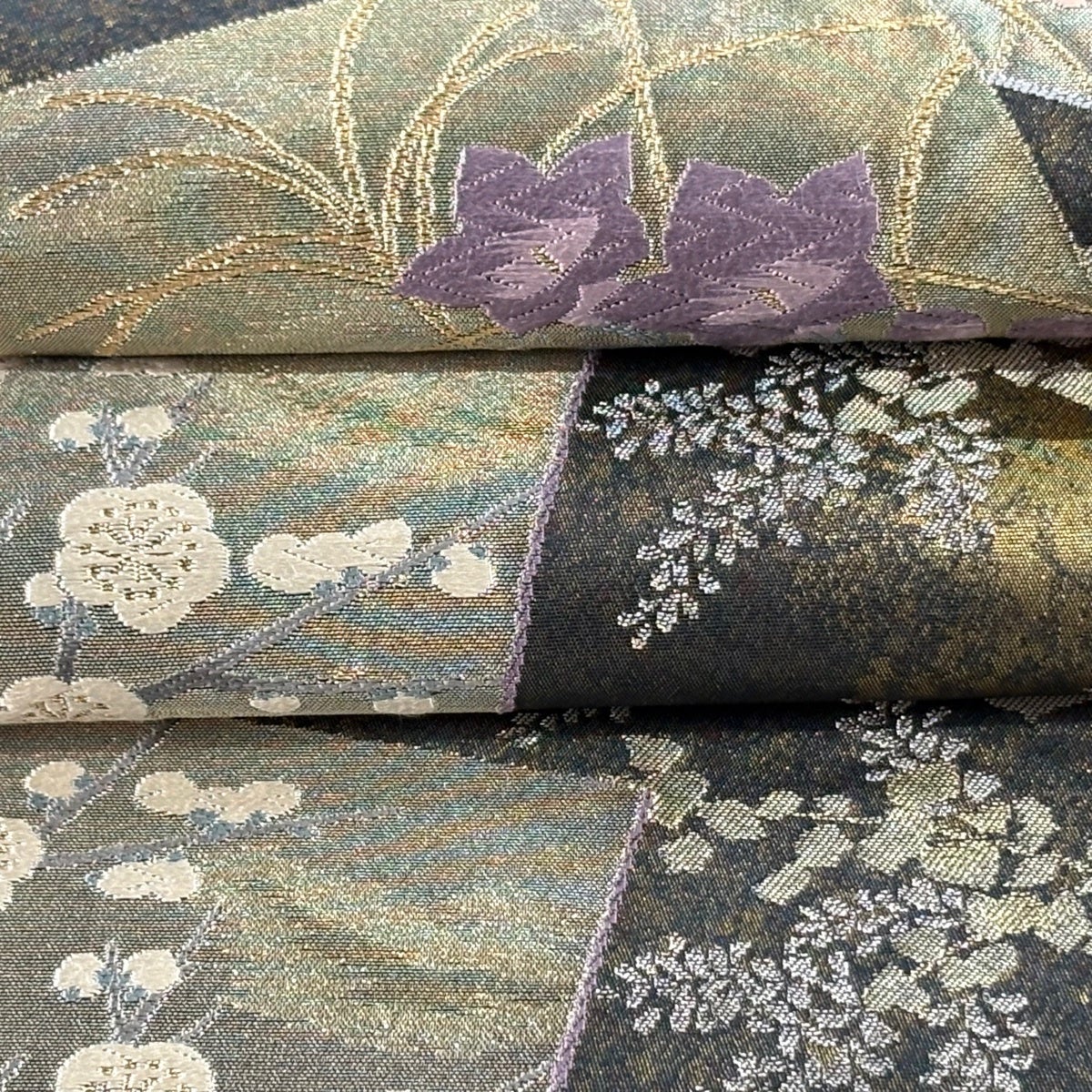 【美品】 袋帯 逸品 落款あり 源氏香 草花 金糸 青灰色 六通 正絹