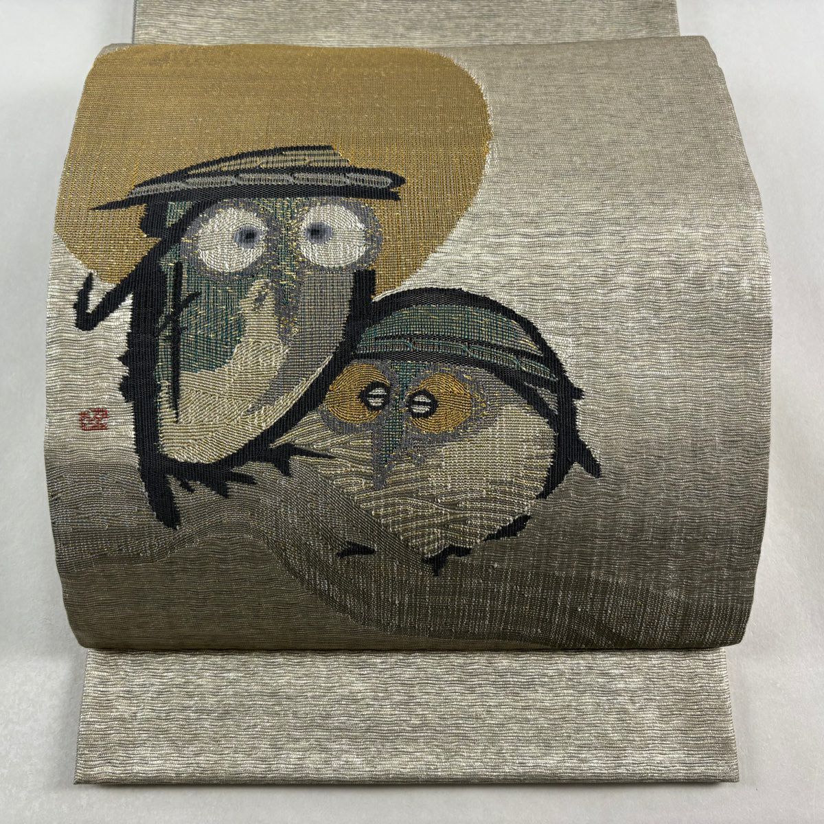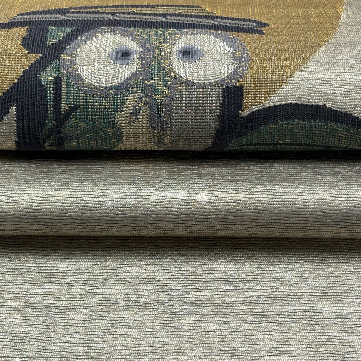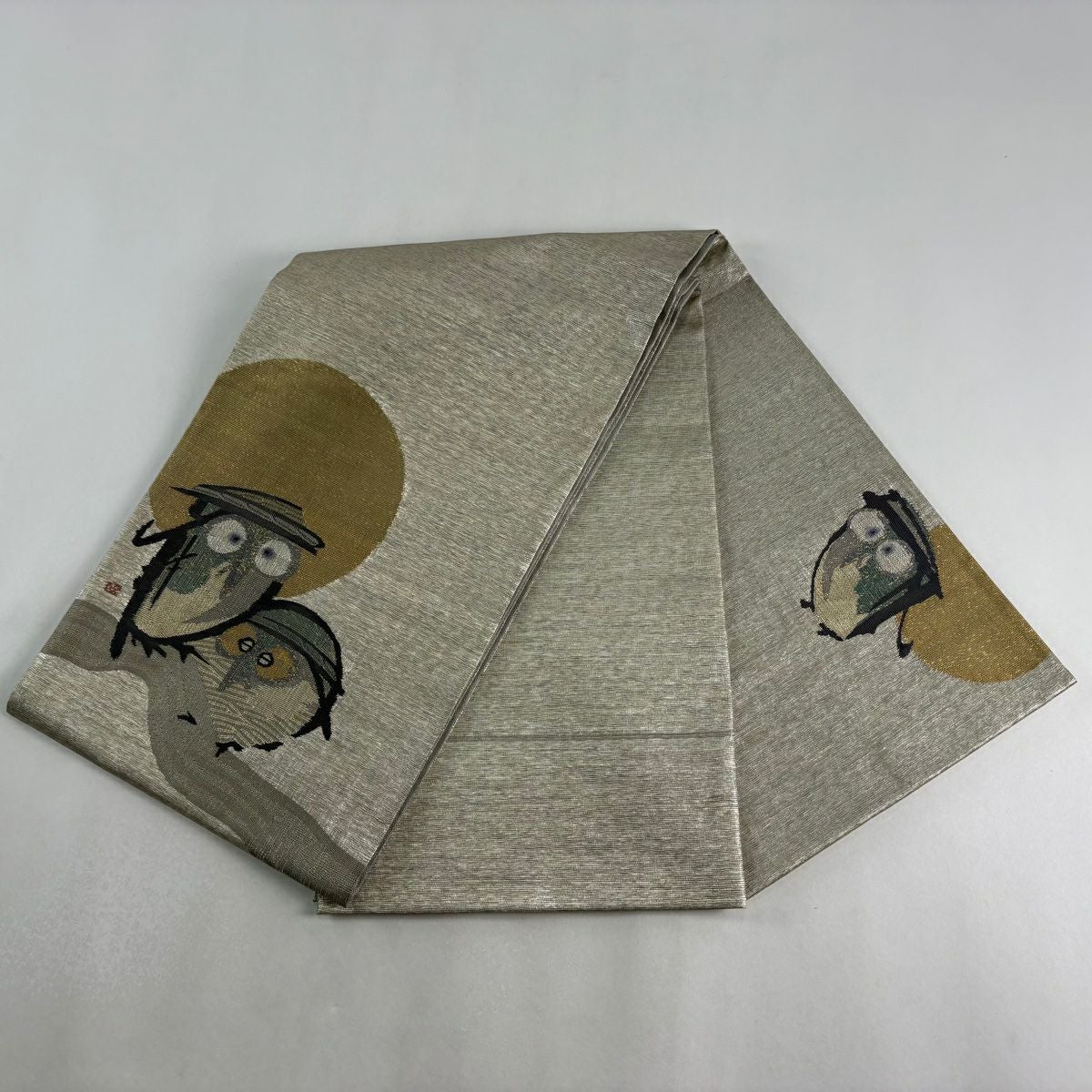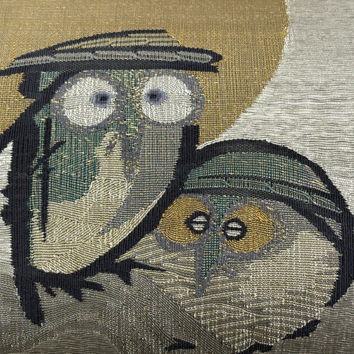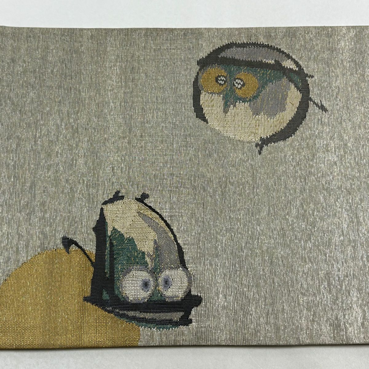【美品】 袋帯 逸品 落款あり ふくろう 金通し 箔 銀色 お太鼓柄 正絹