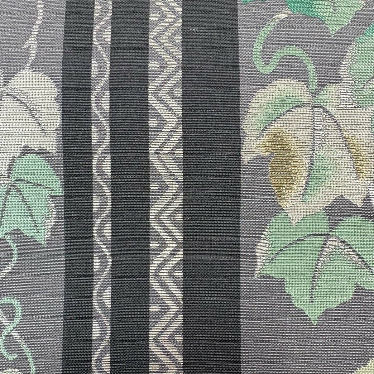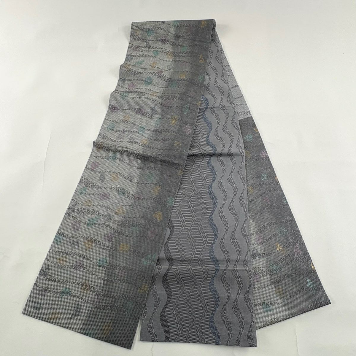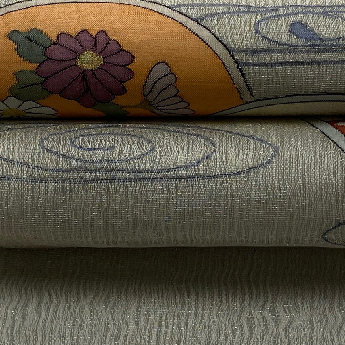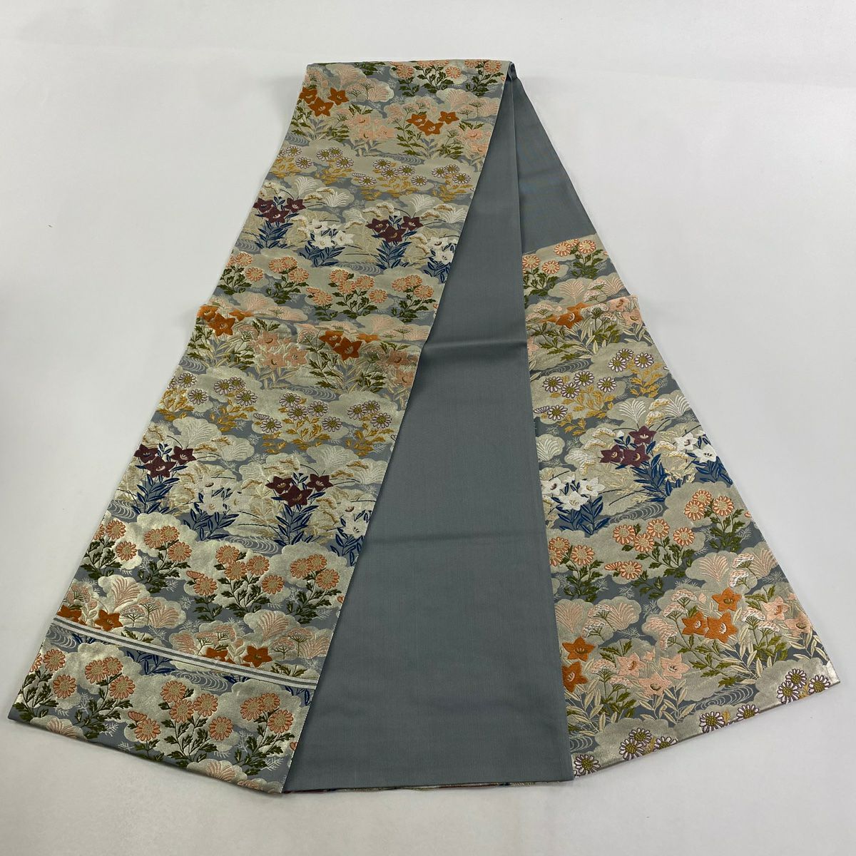 【在庫一掃】 袋帯 逸品 夏帯 草花 観世水 金銀糸 灰色 お太鼓柄 正絹