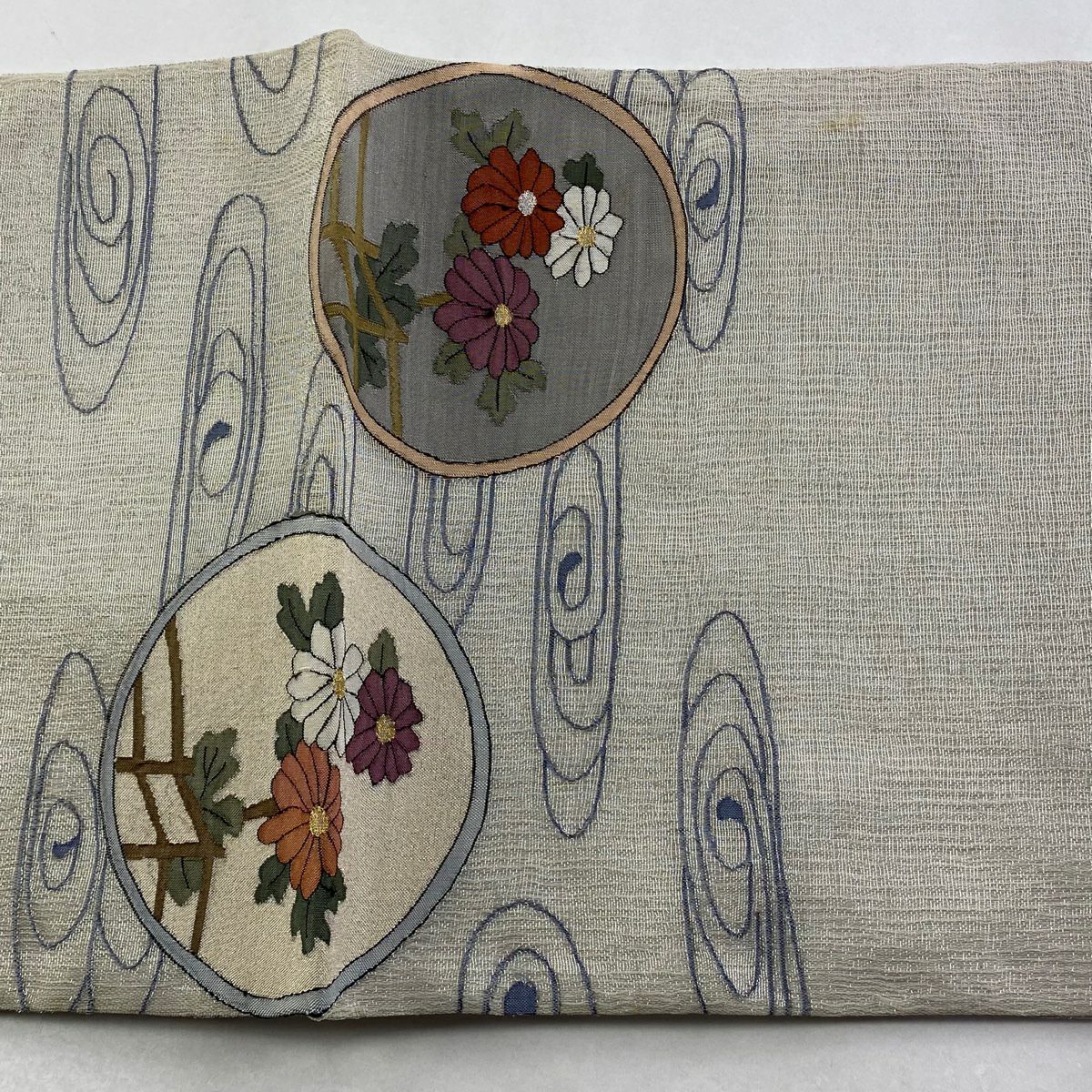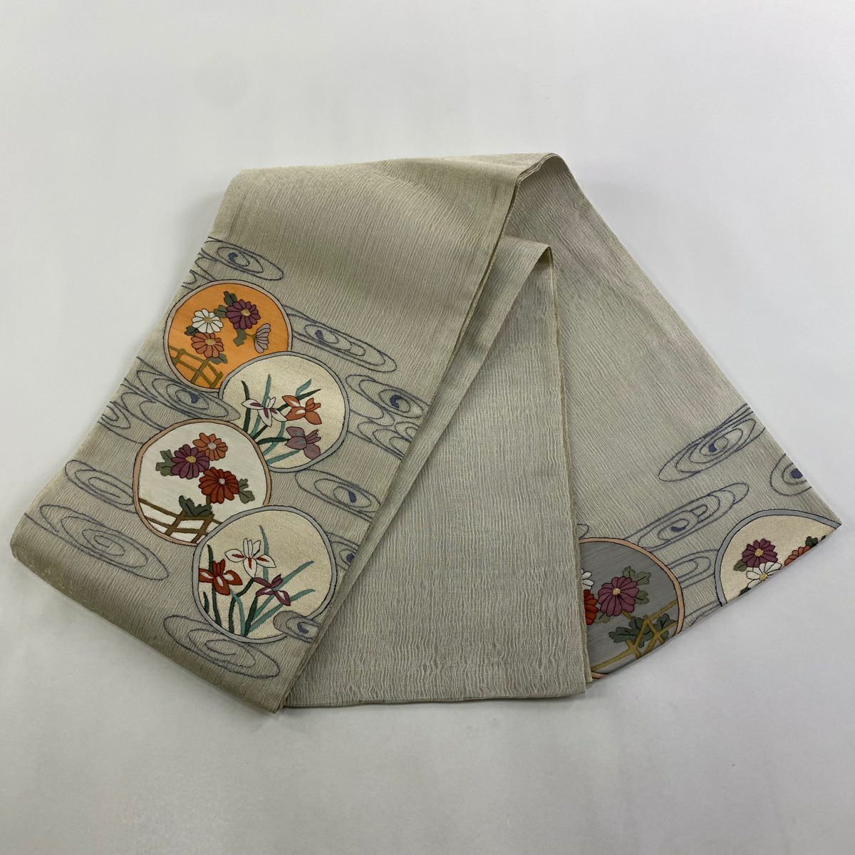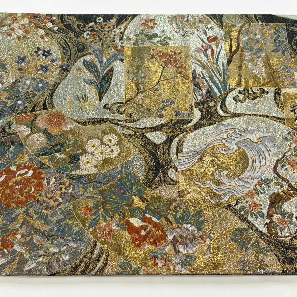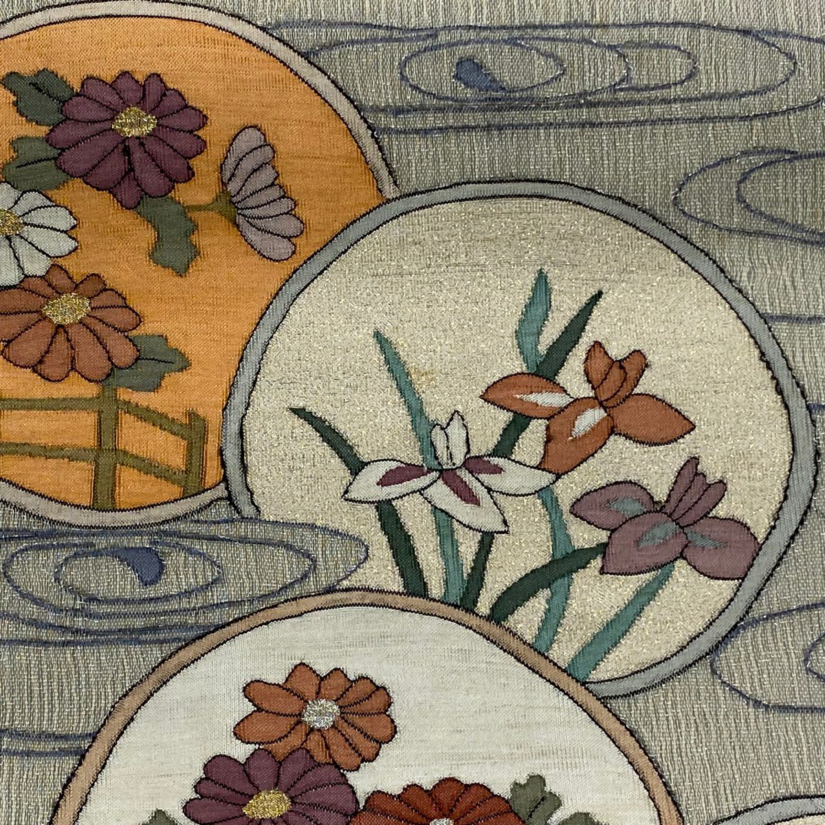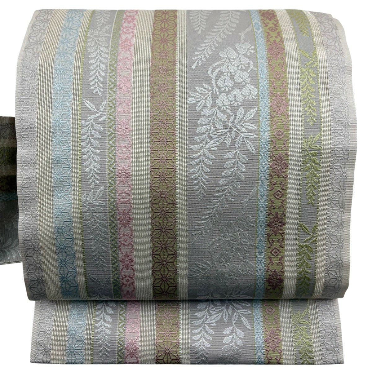 【在庫一掃】 袋帯 逸品 夏帯 草花 観世水 金銀糸 灰色 お太鼓柄 正絹
