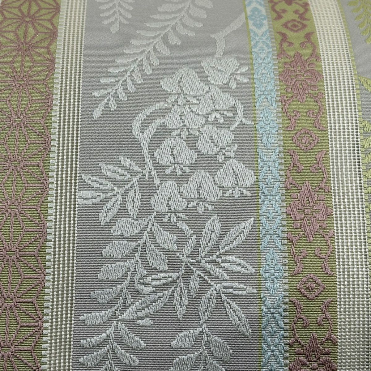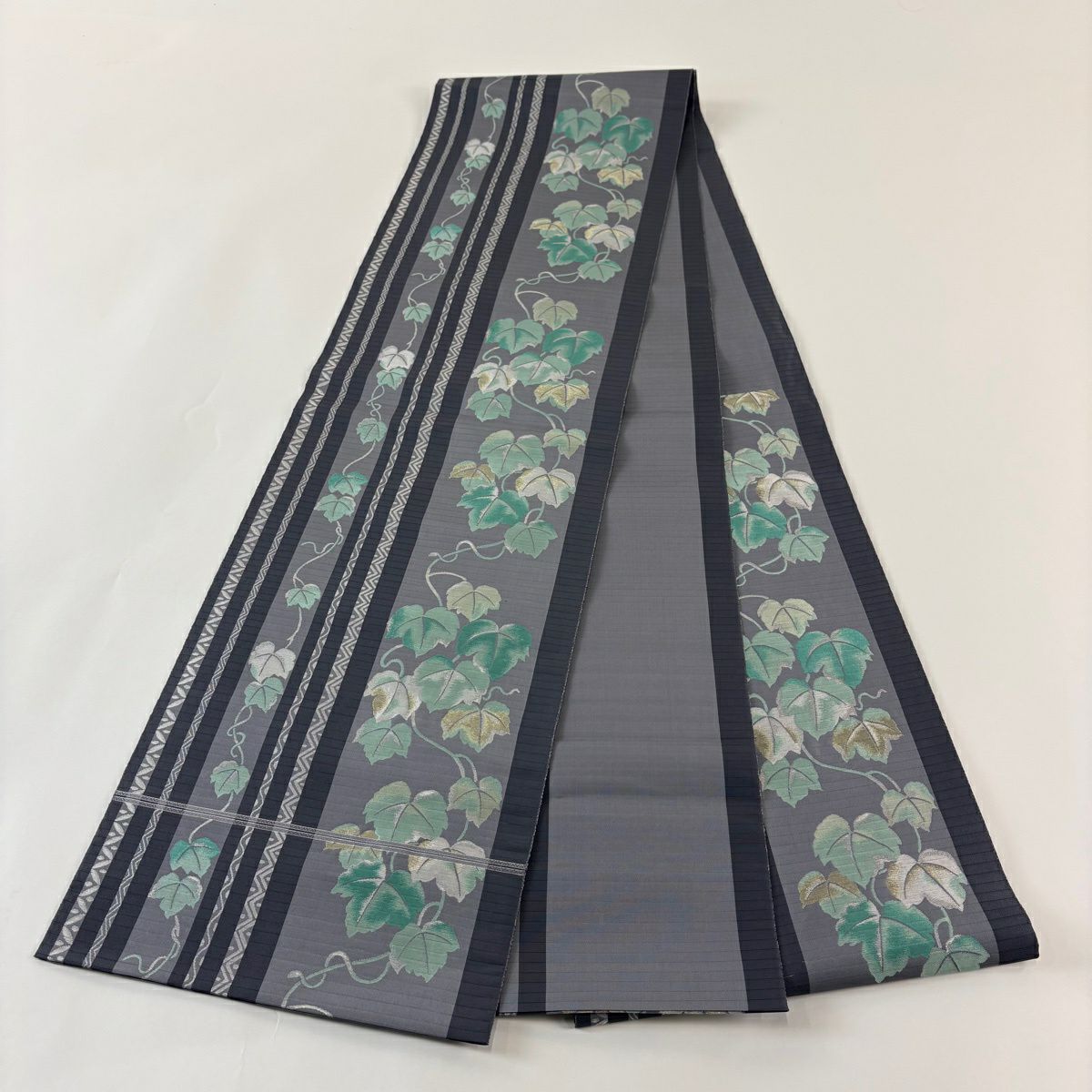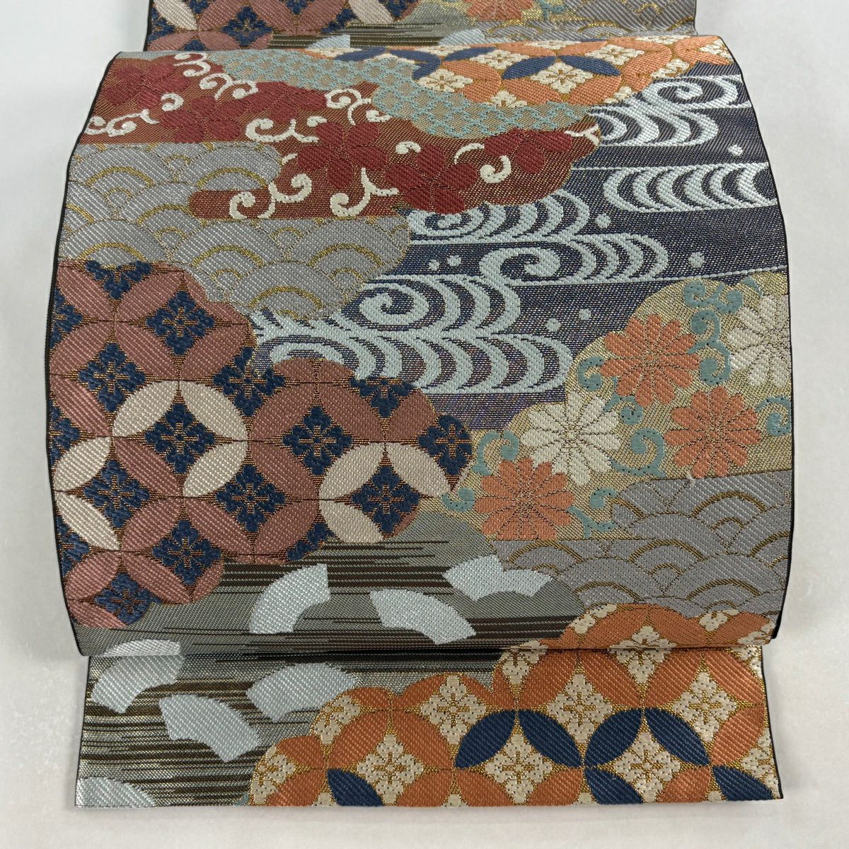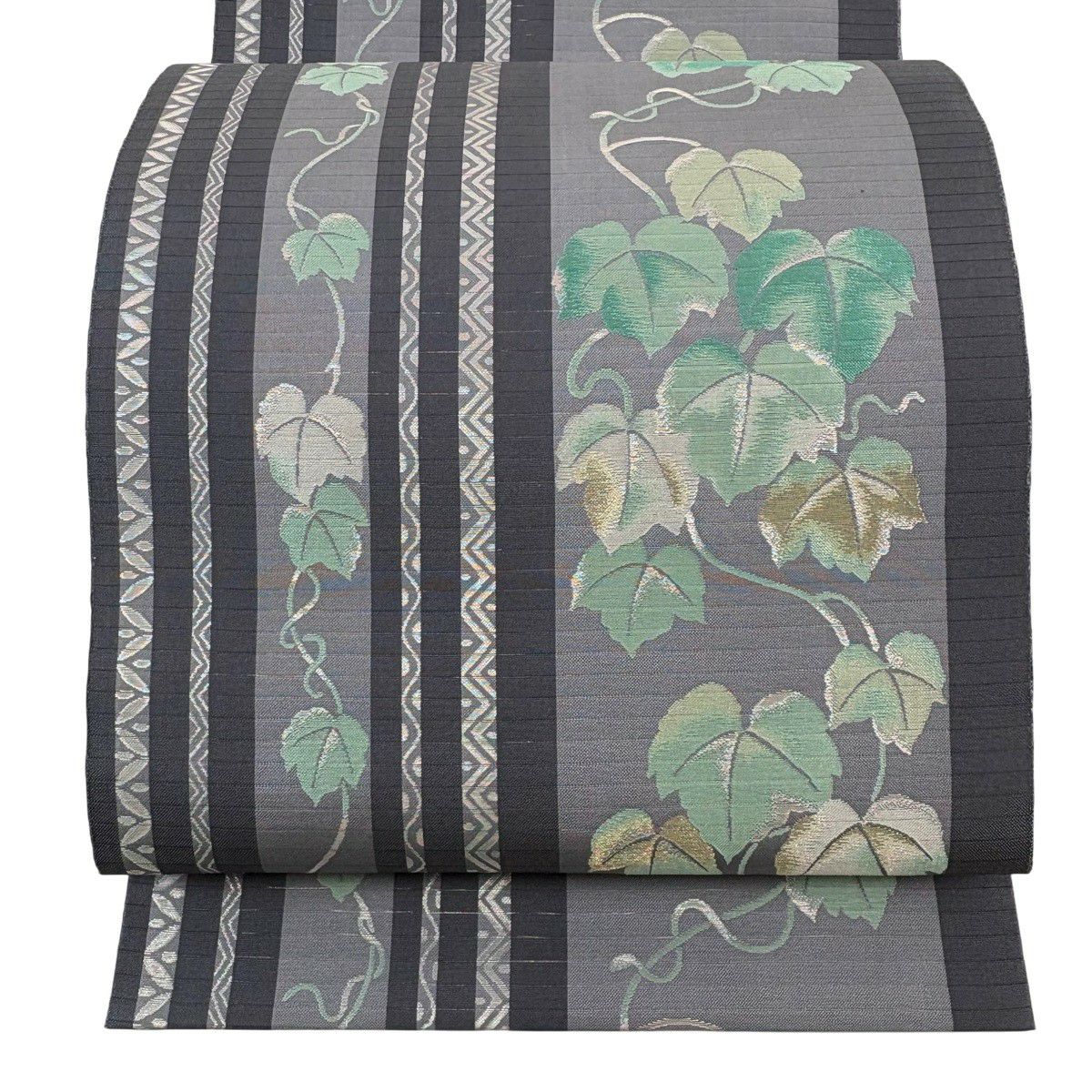 【在庫一掃】 袋帯 逸品 夏帯 草花 観世水 金銀糸 灰色 お太鼓柄 正絹