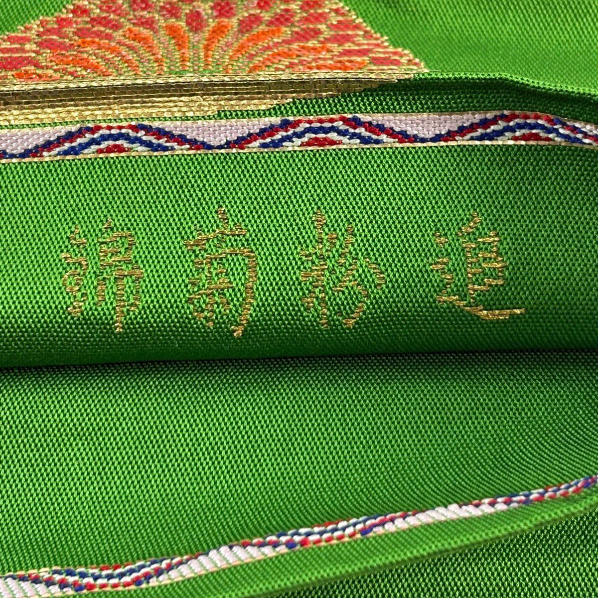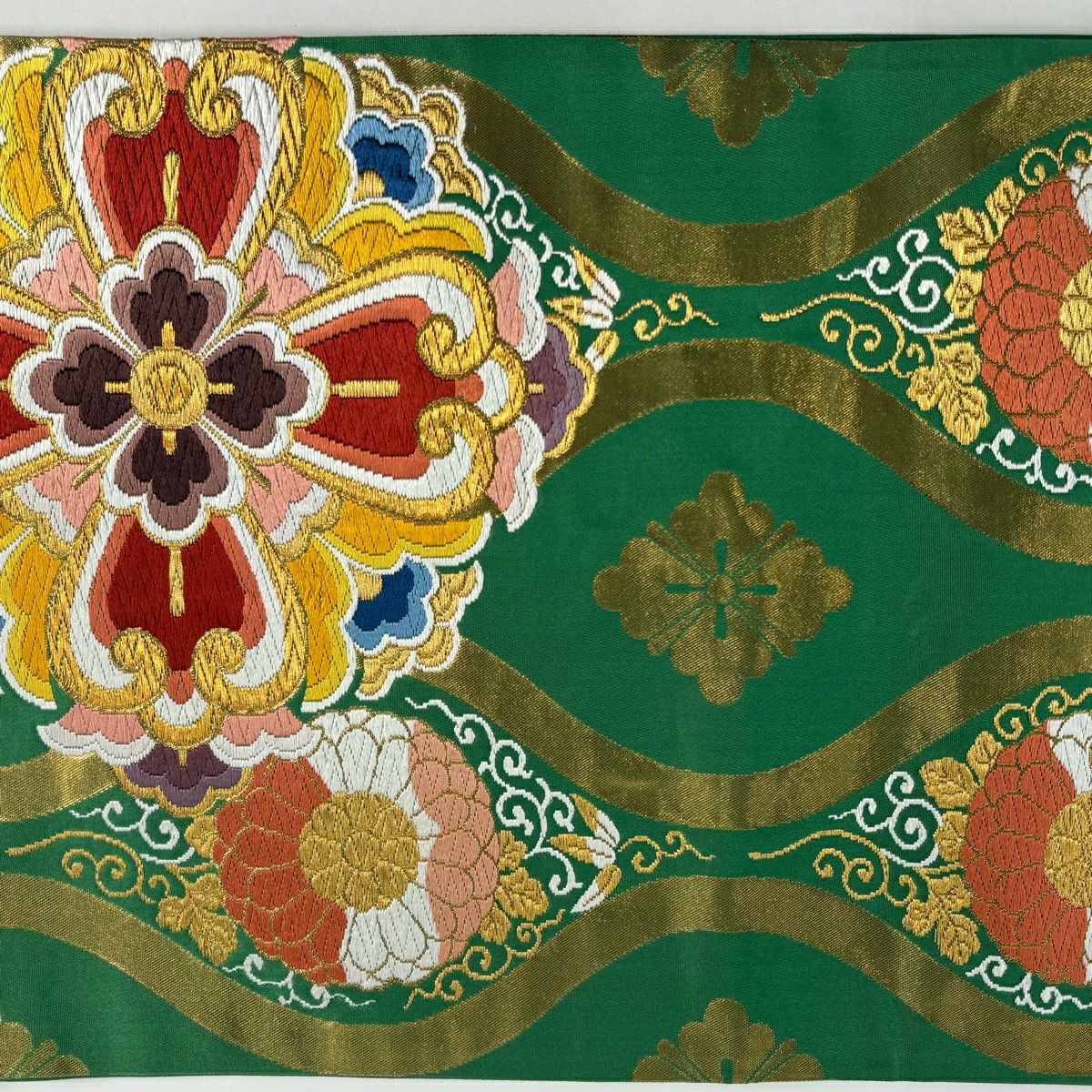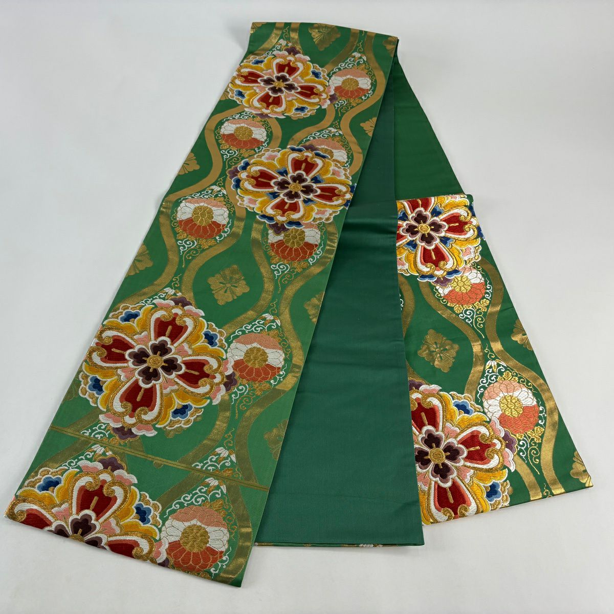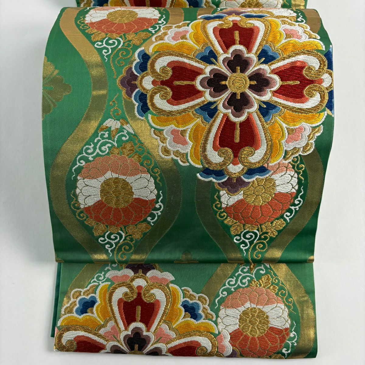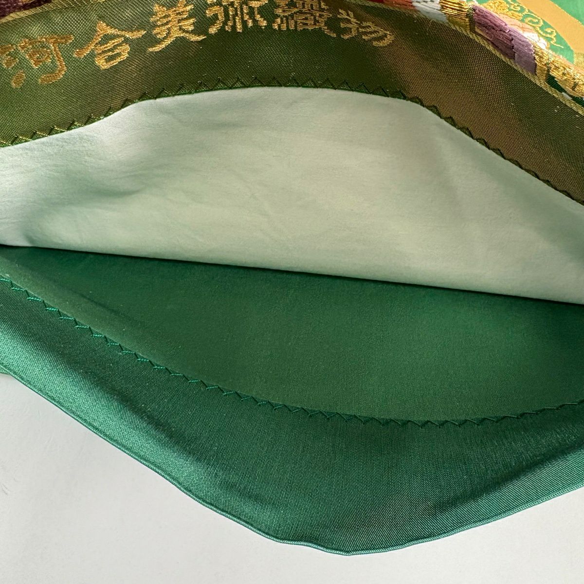 袋帯 逸品 河合美術織物 落款あり 華文 立涌 金糸 唐織 緑 六通 正絹