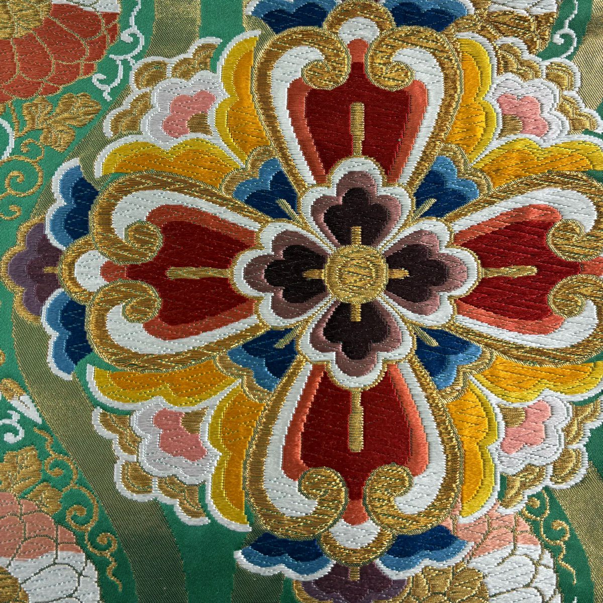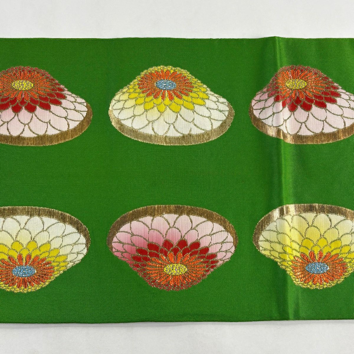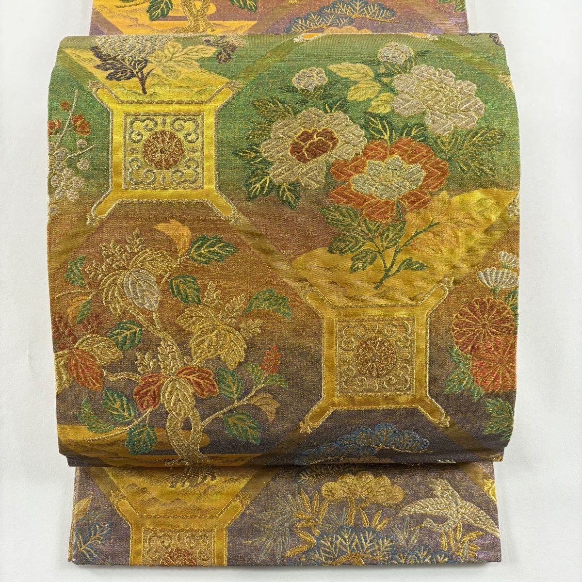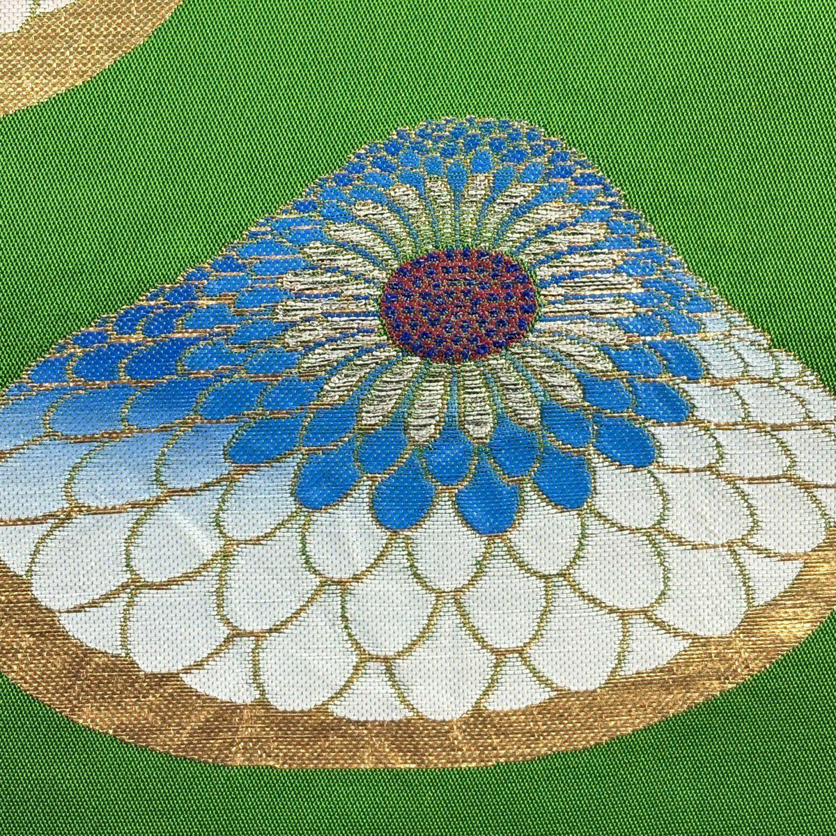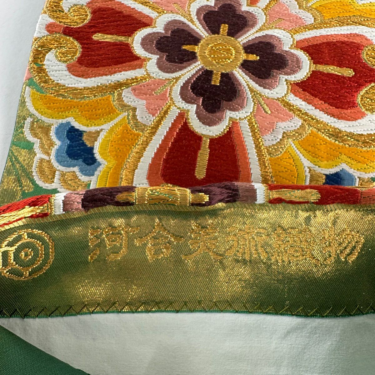 袋帯 逸品 河合美術織物 落款あり 華文 立涌 金糸 唐織 緑 六通 正絹