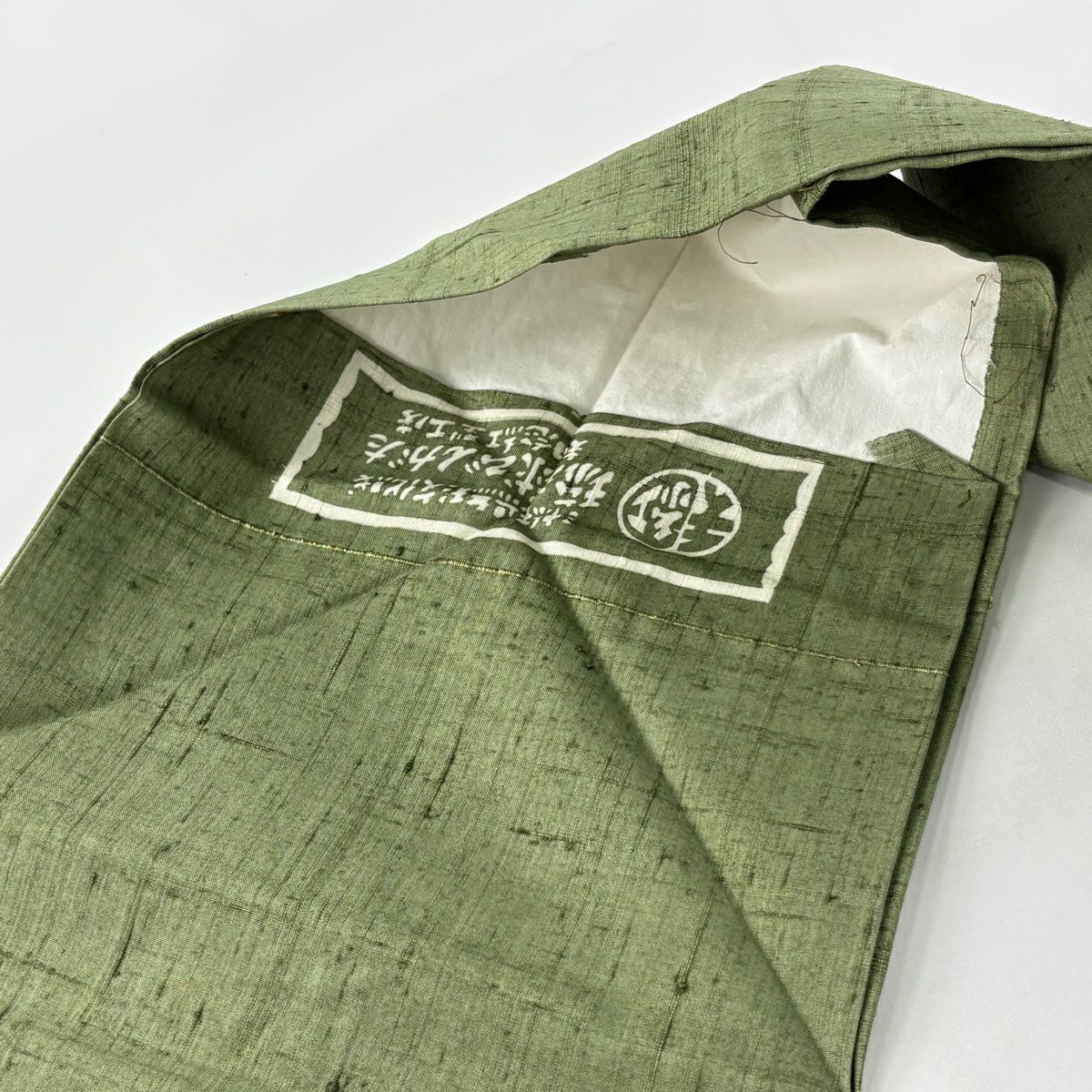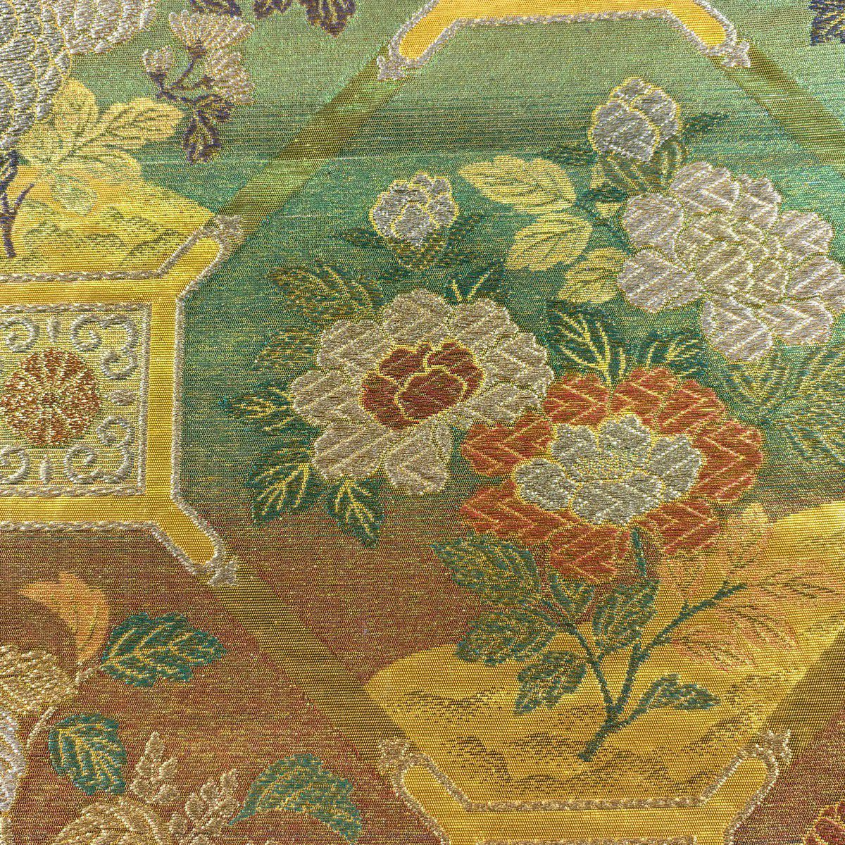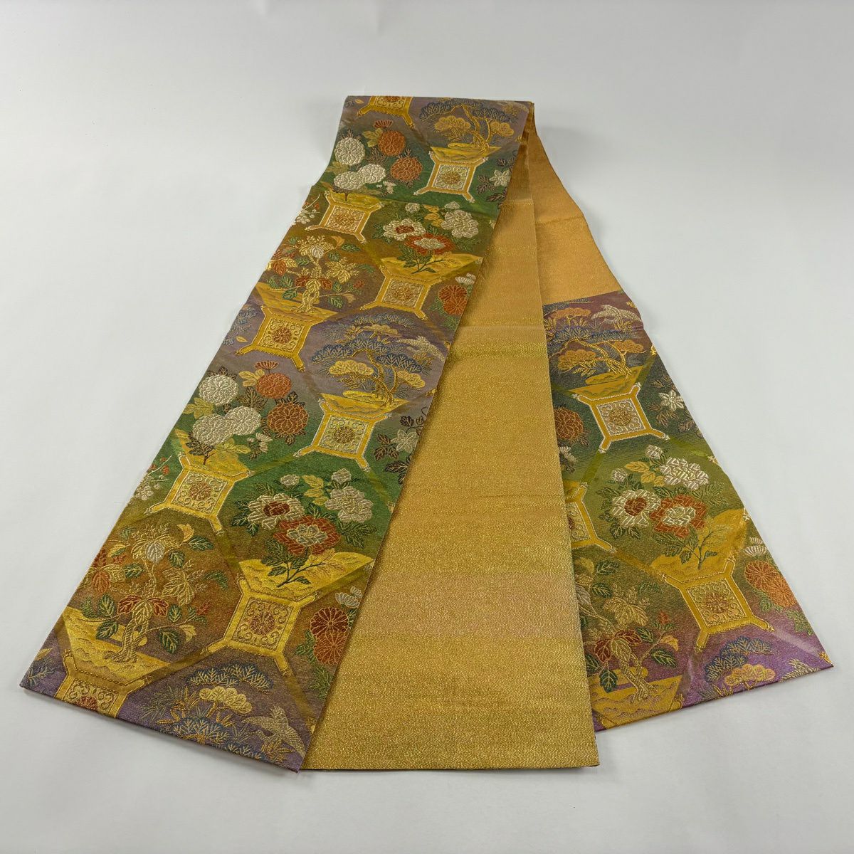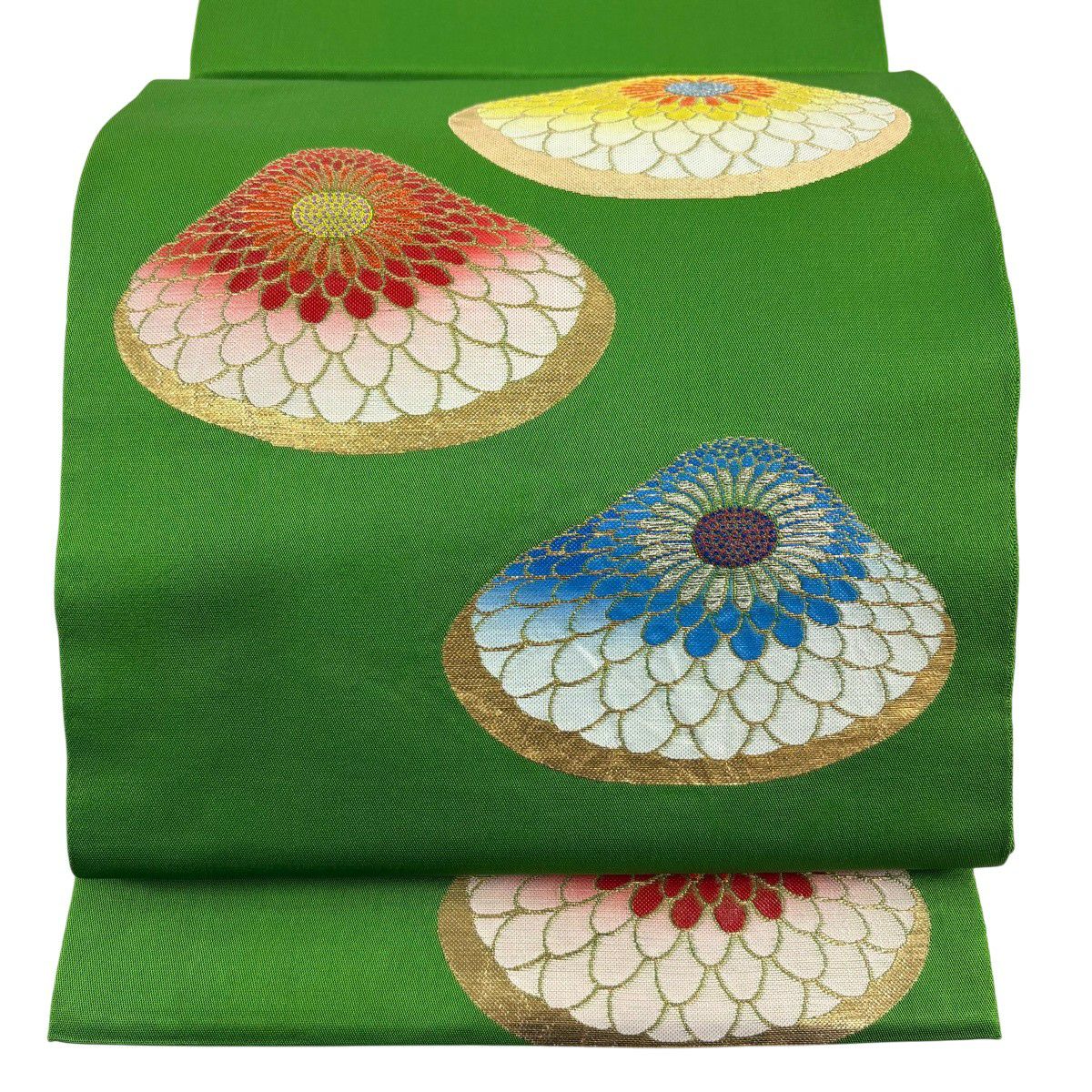 袋帯 逸品 河合美術織物 落款あり 華文 立涌 金糸 唐織 緑 六通 正絹