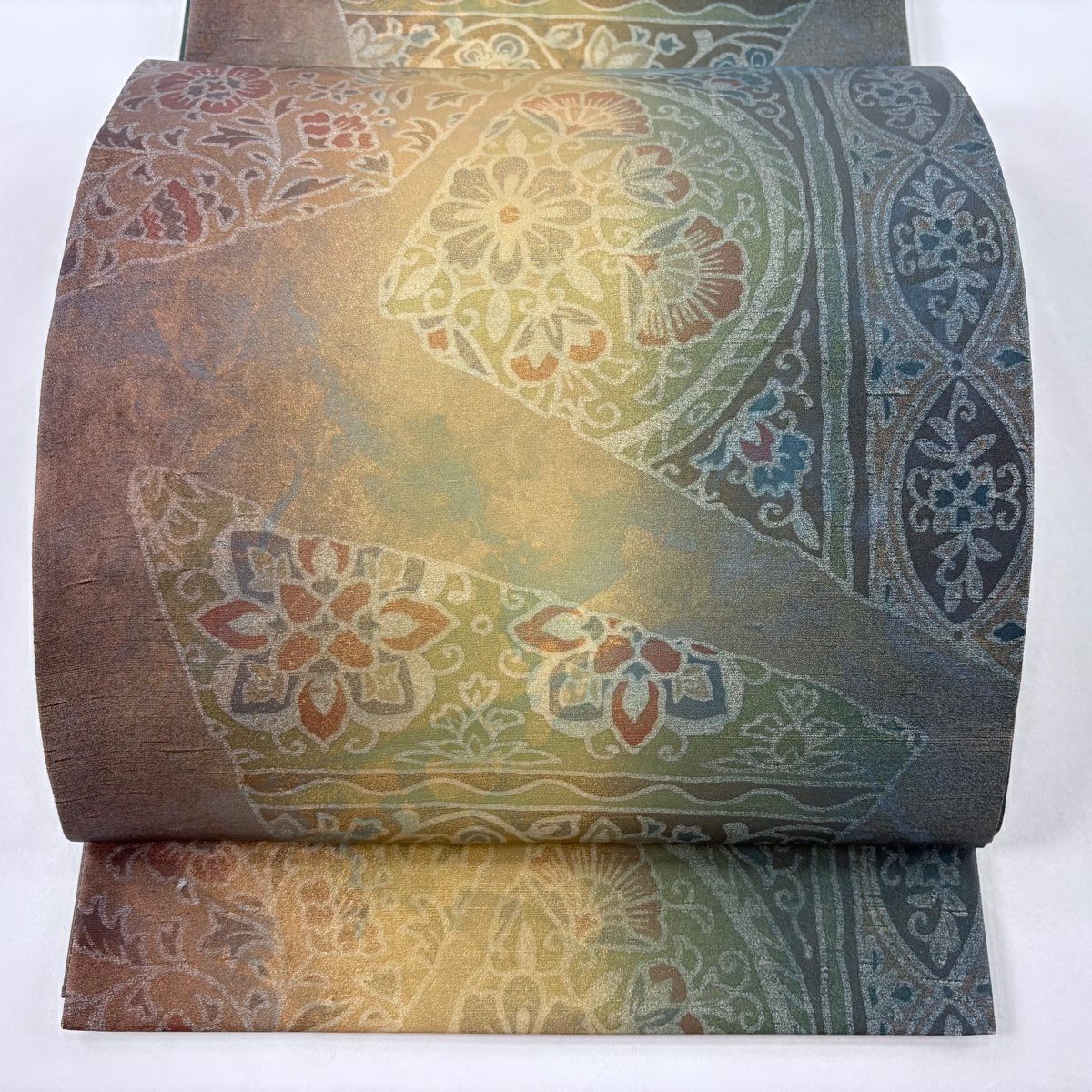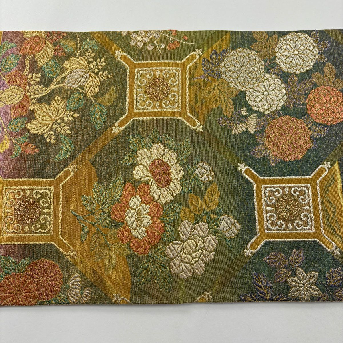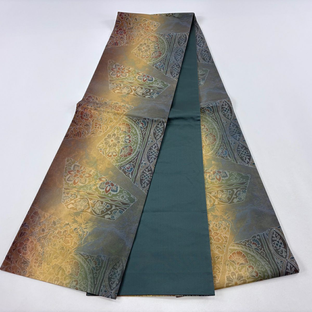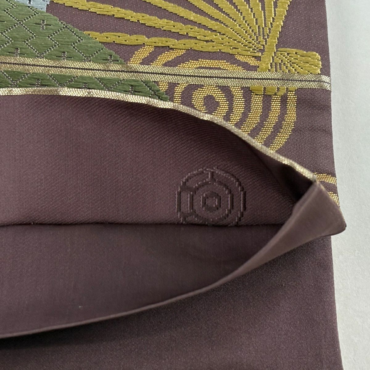 【美品】 袋帯 逸品 証紙あり 博多織 幾何学模様 箔 茶緑色 六通 正絹