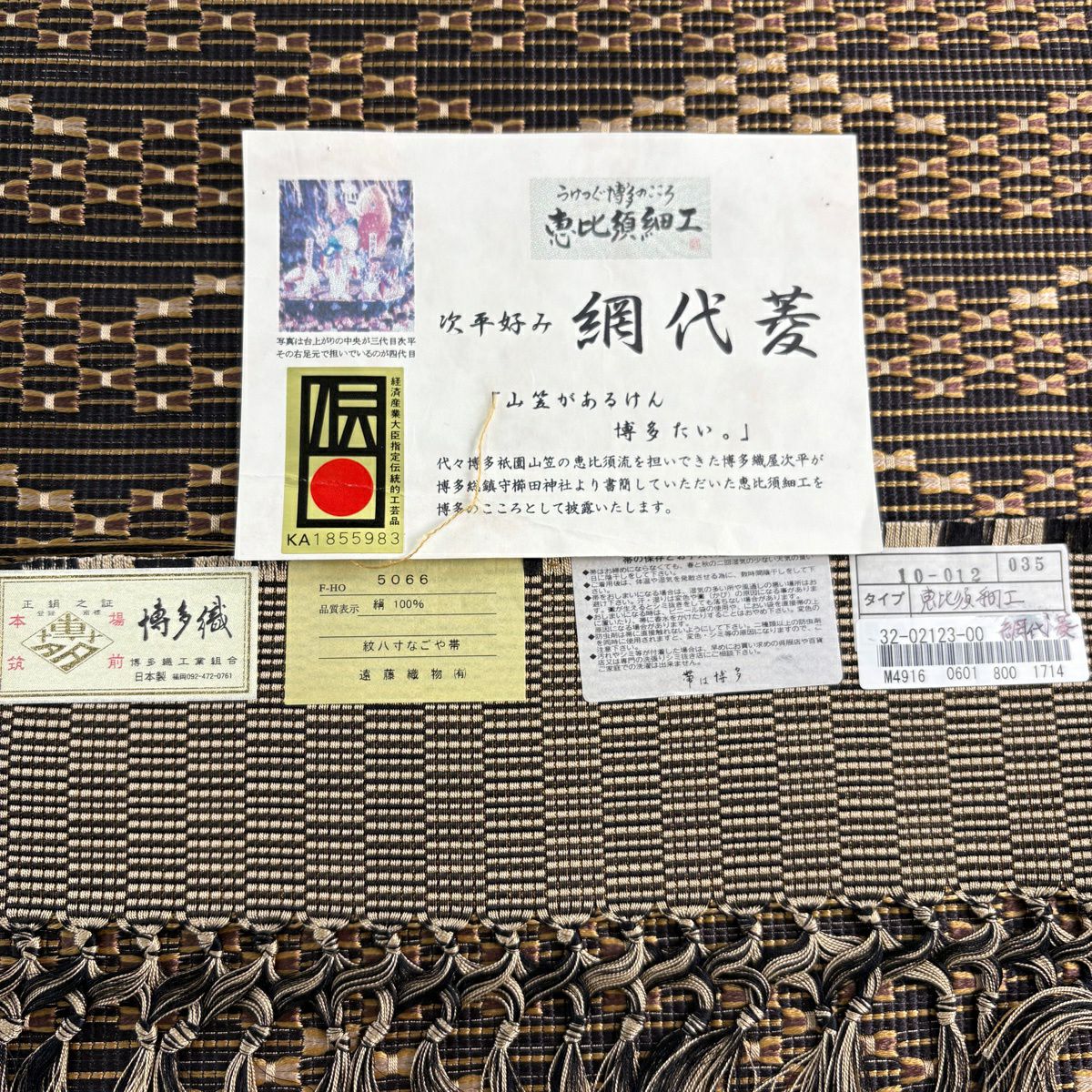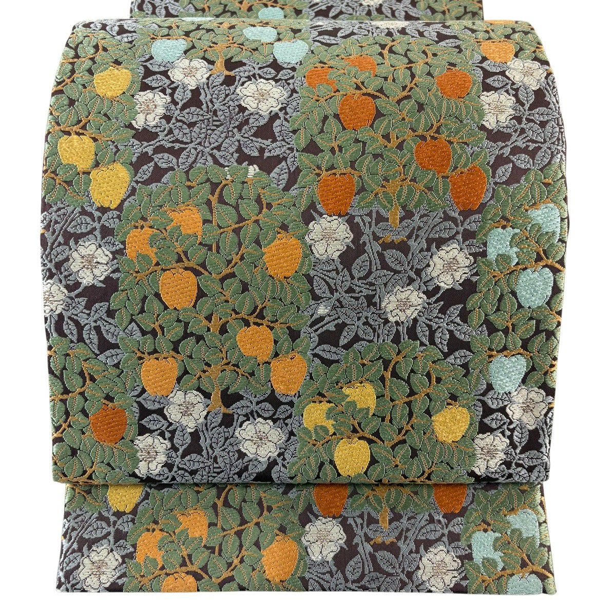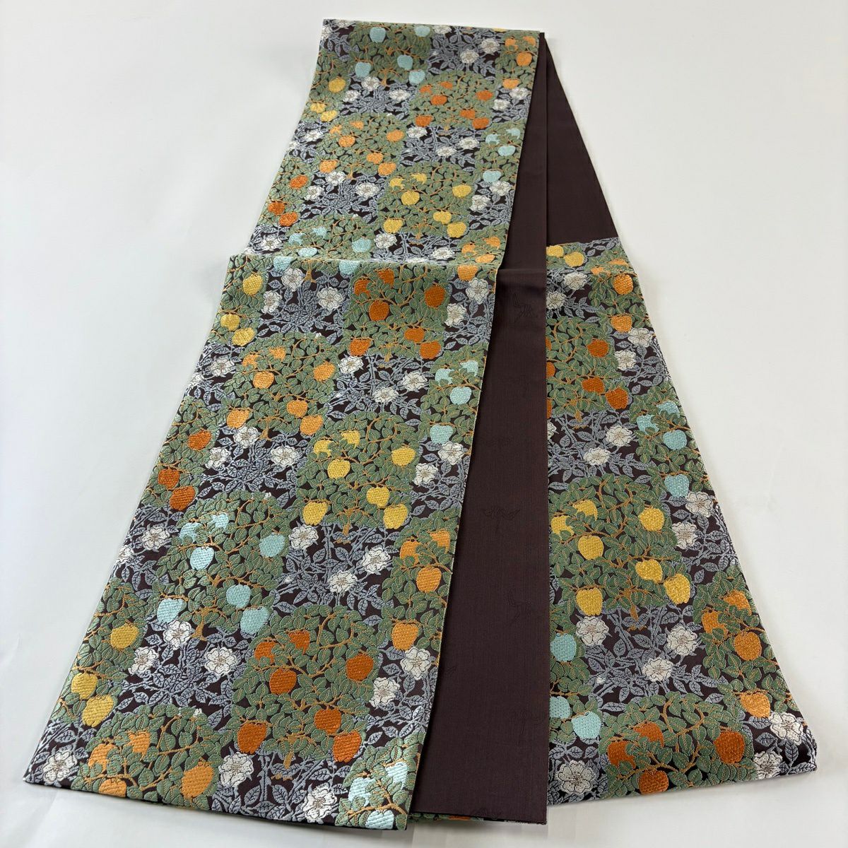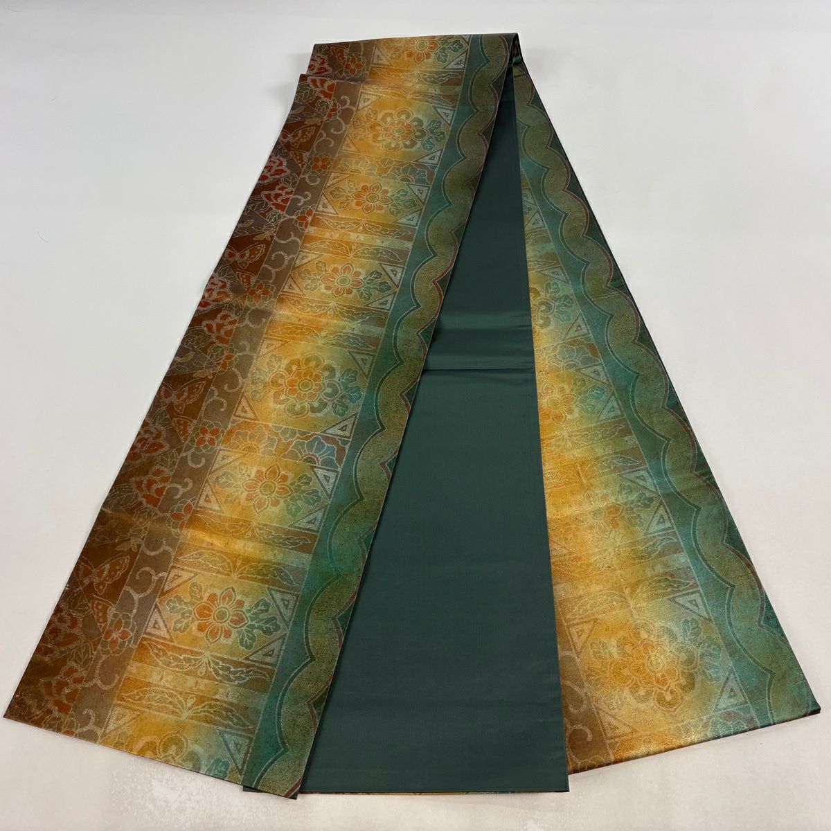 【美品】 袋帯 逸品 証紙あり 博多織 幾何学模様 箔 茶緑色 六通 正絹