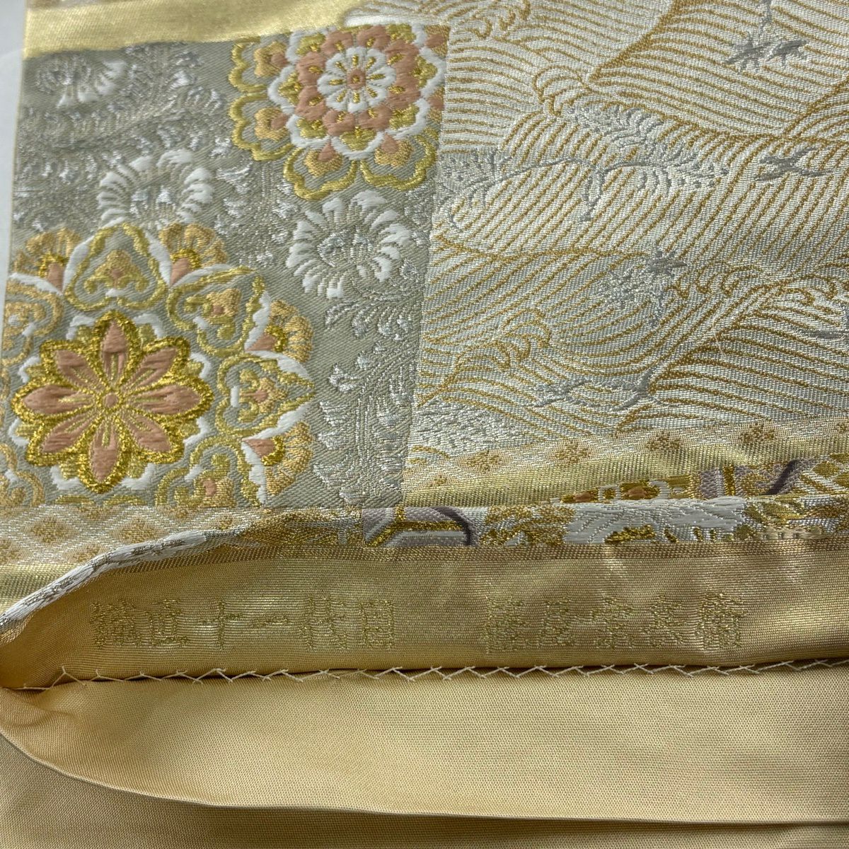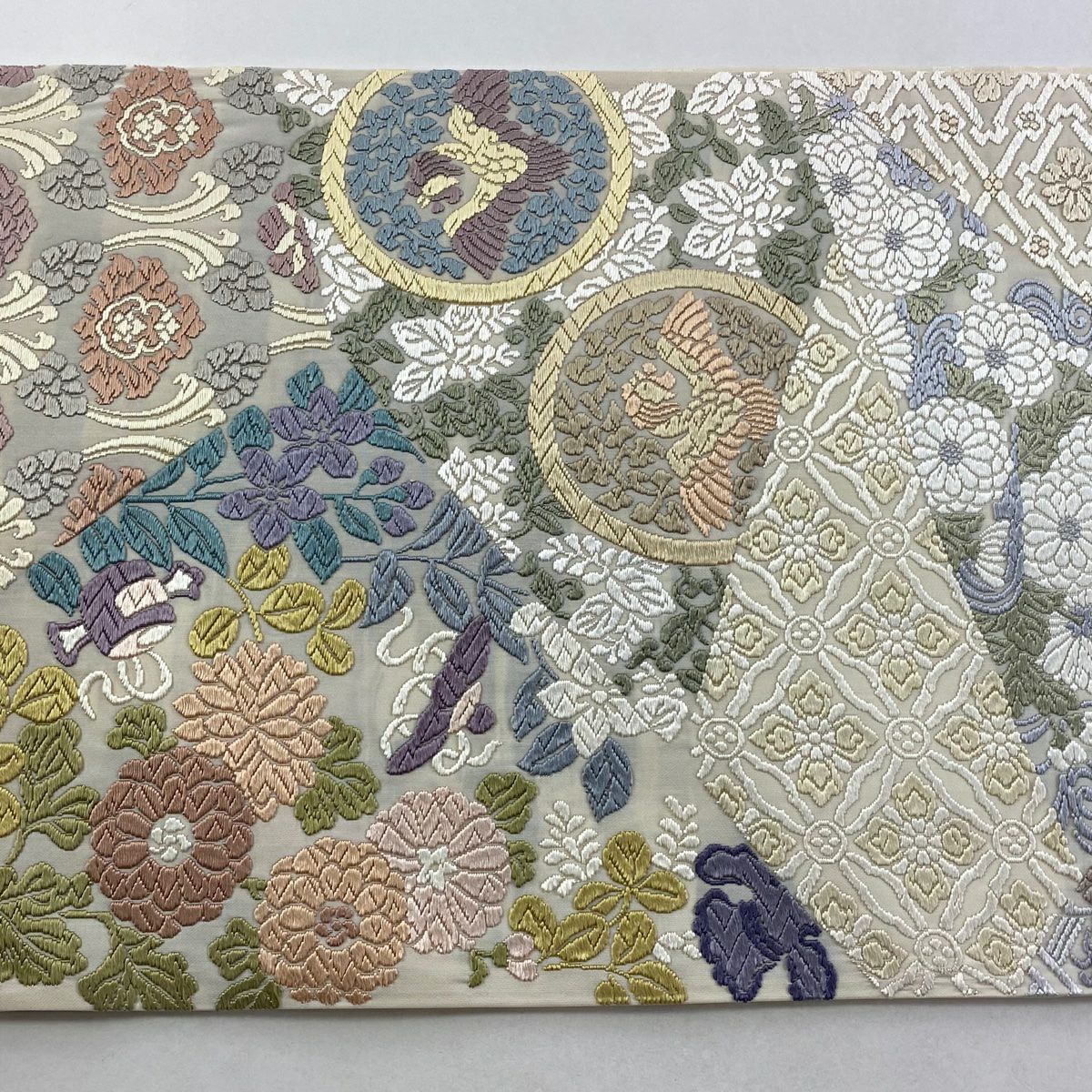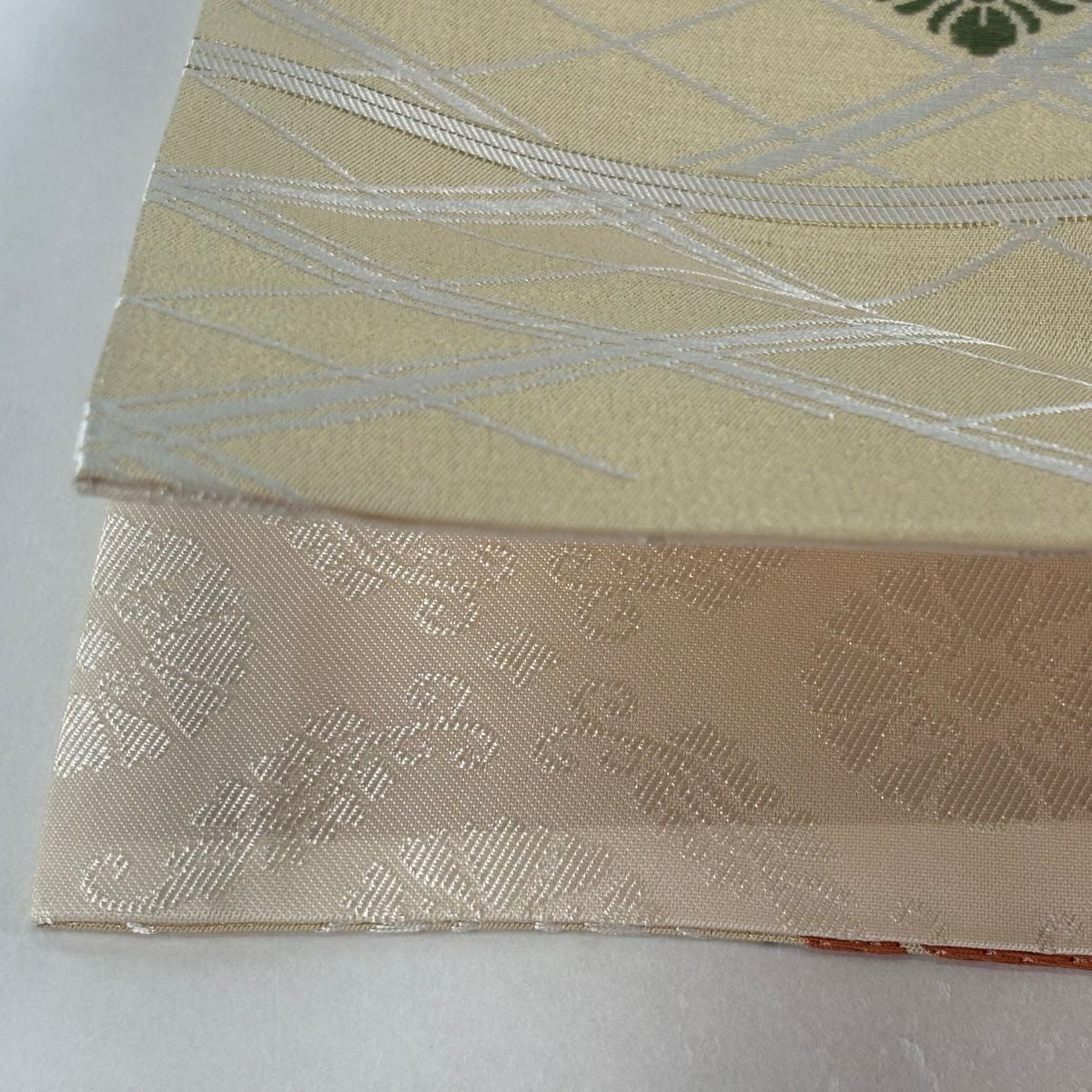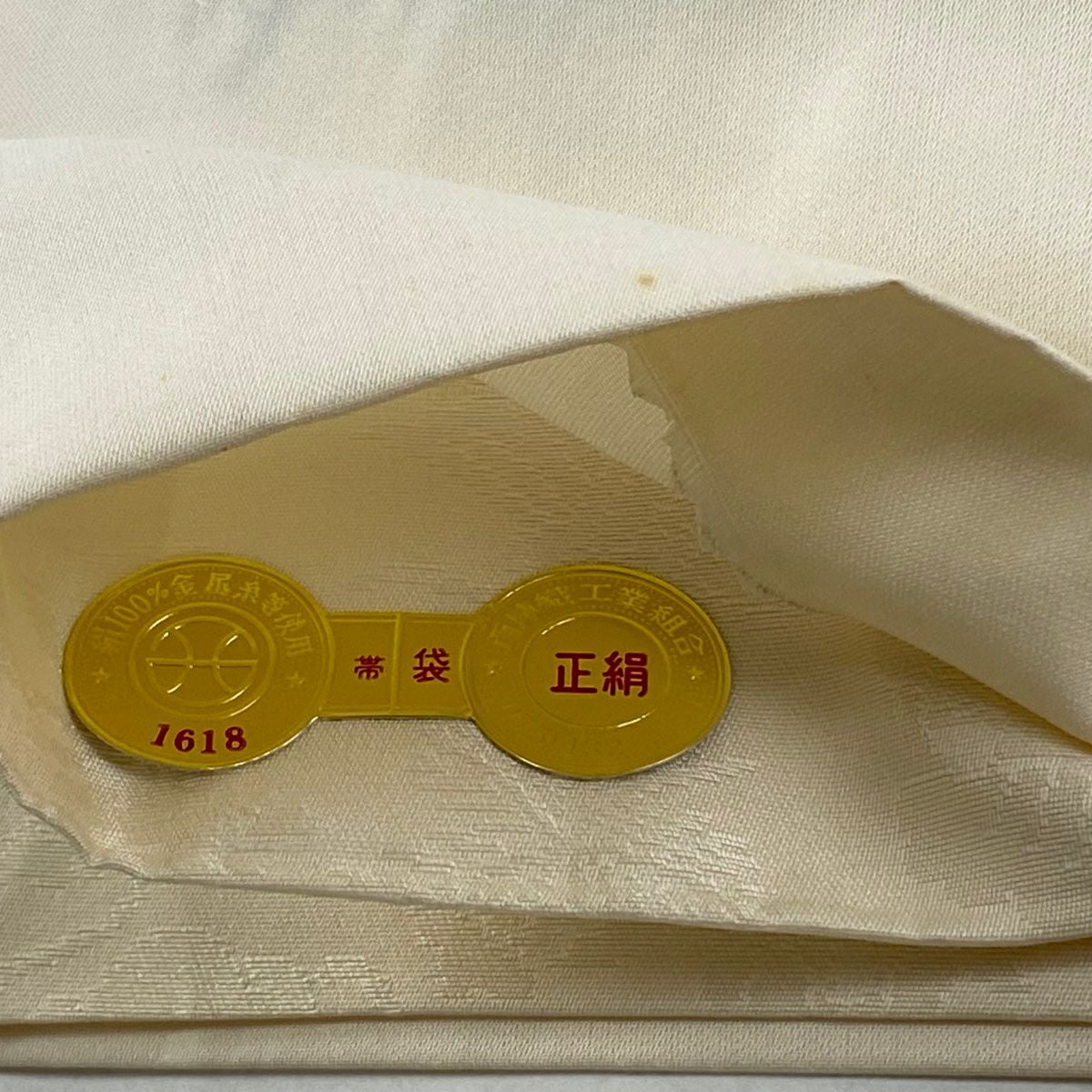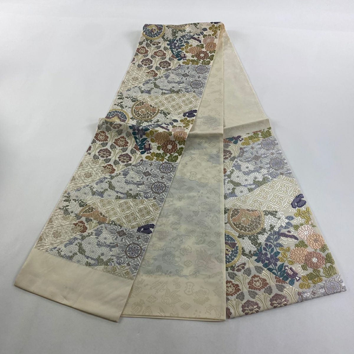 【在庫一掃】 袋帯 逸品 証紙あり 草花 花菱 唐織 クリーム 六通 正絹