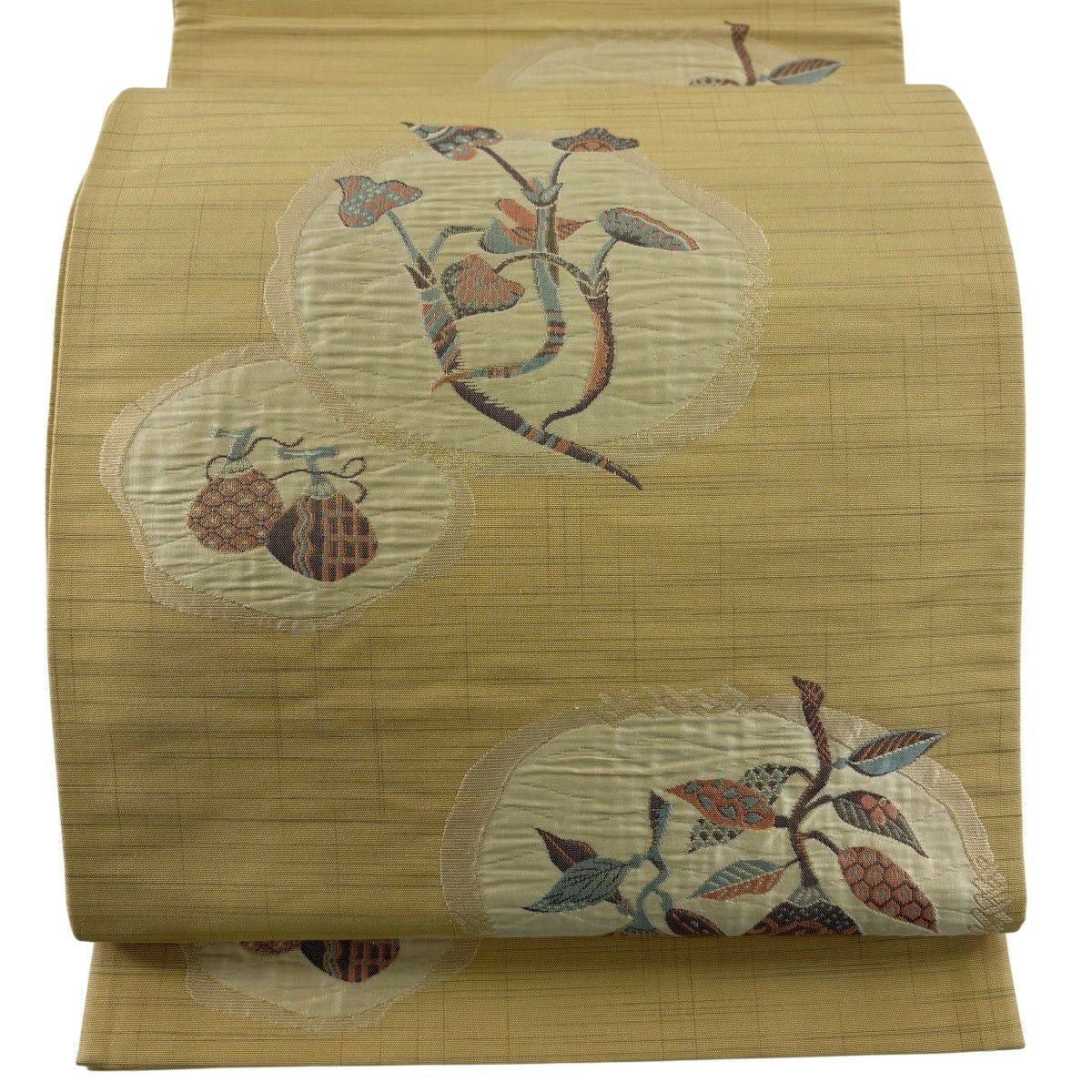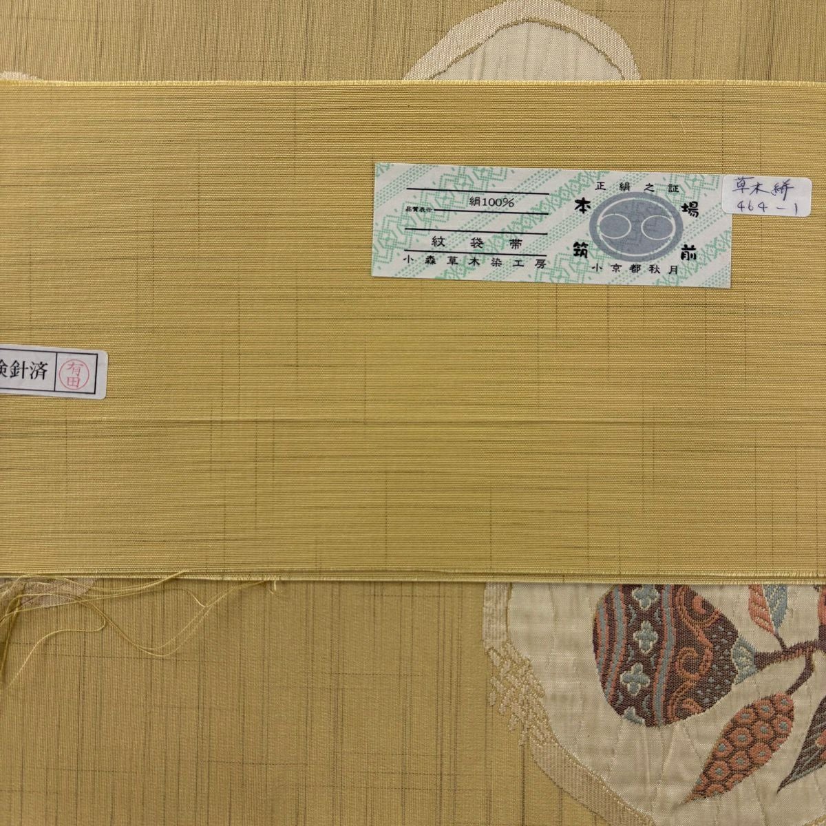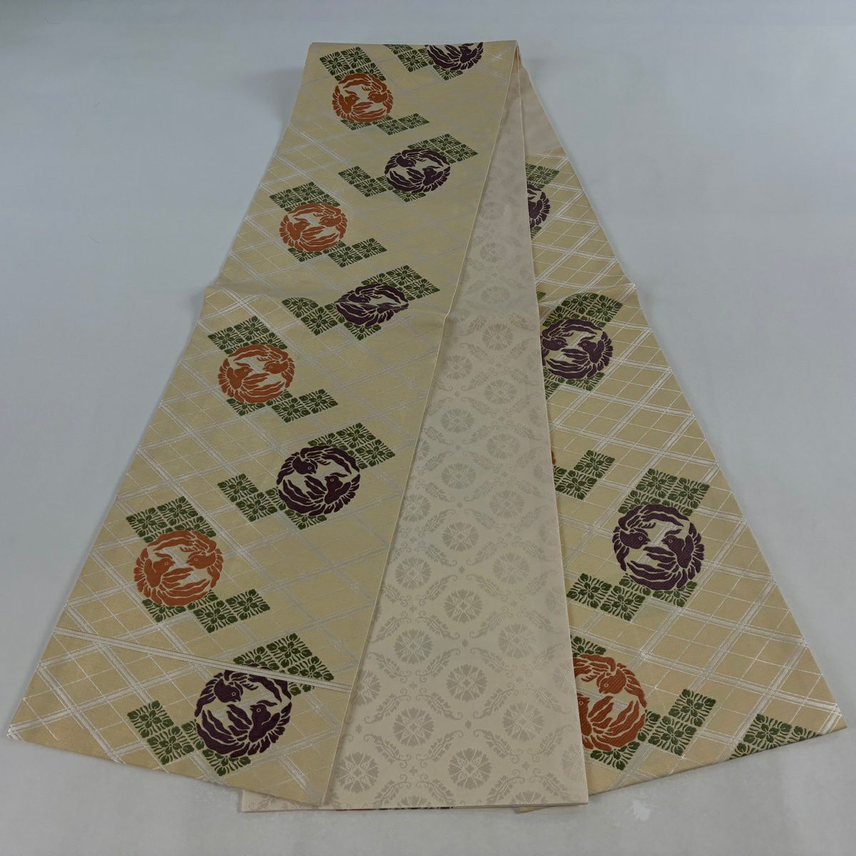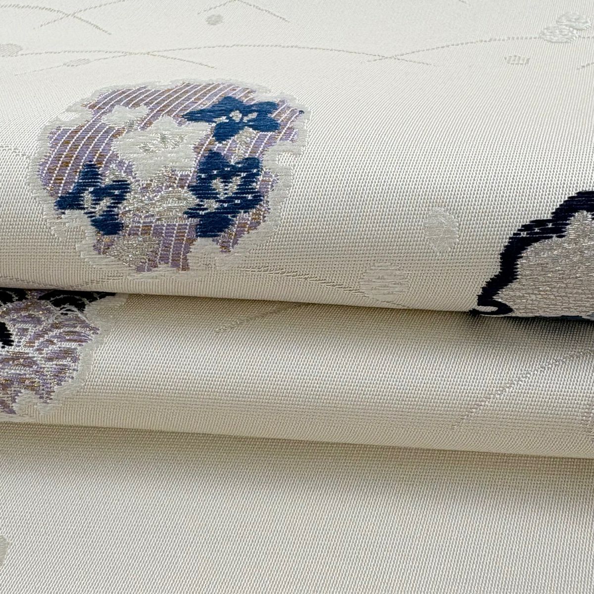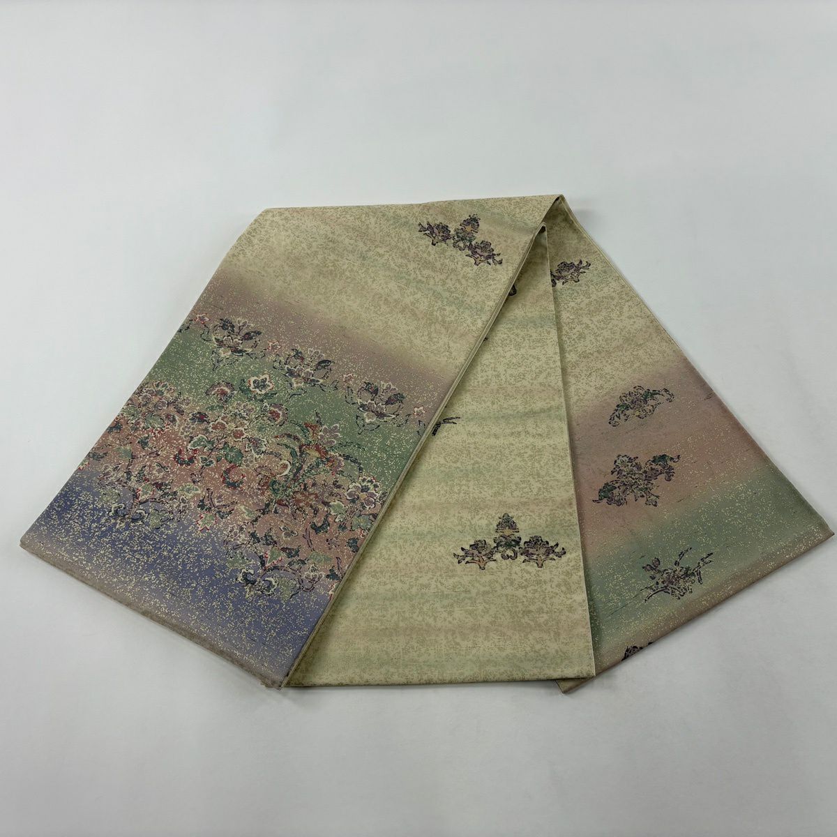 【在庫一掃】 袋帯 逸品 証紙あり 草花 花菱 唐織 クリーム 六通 正絹
